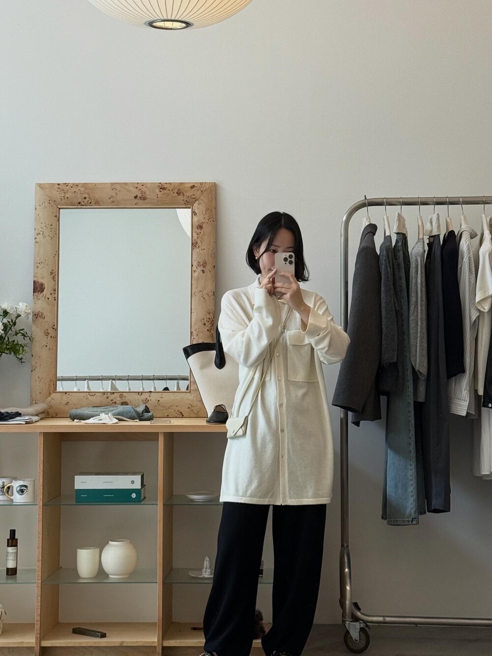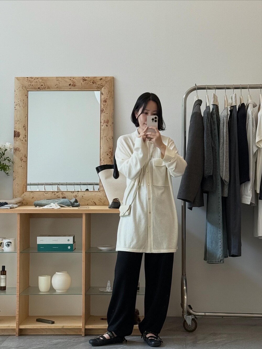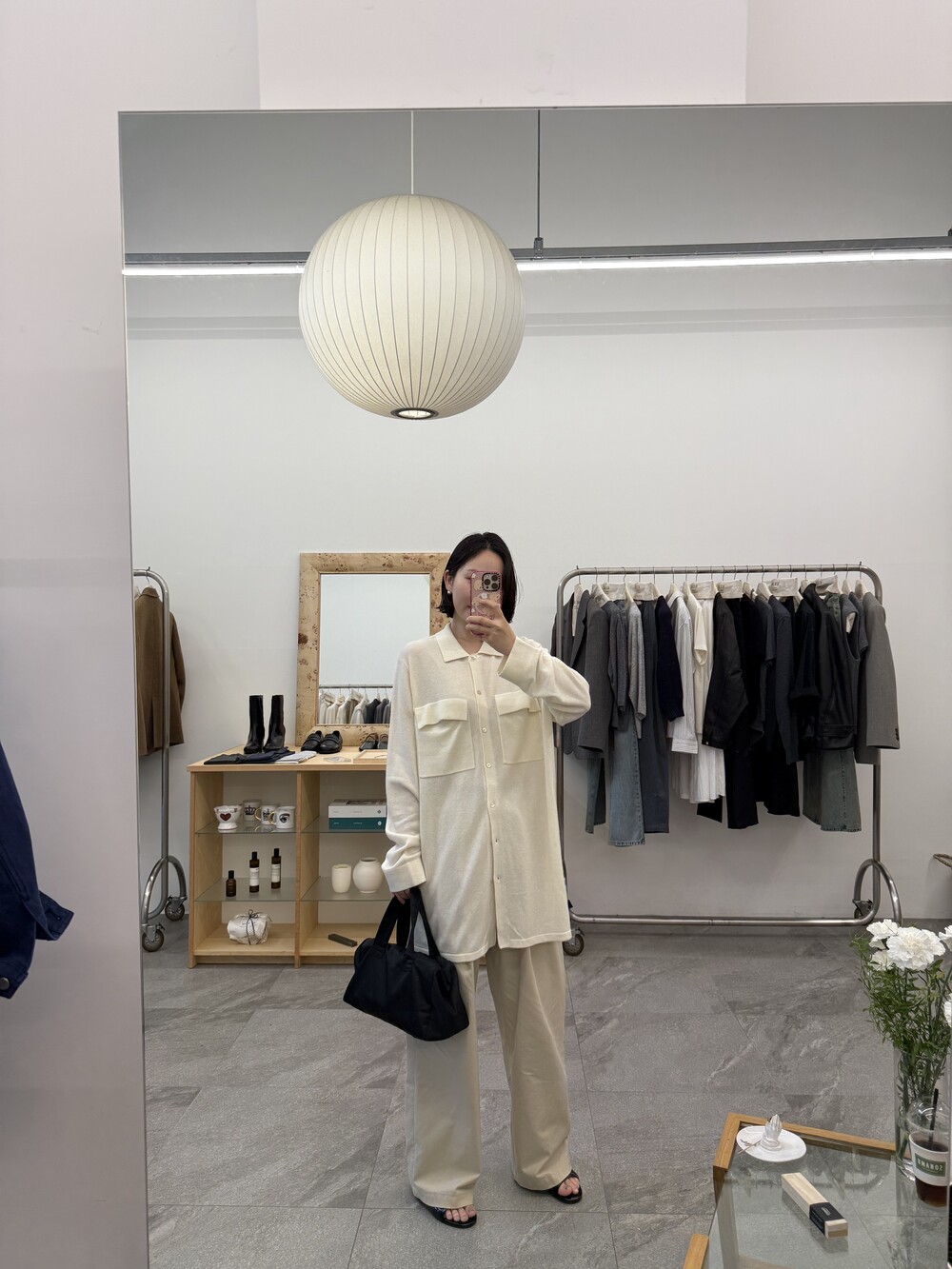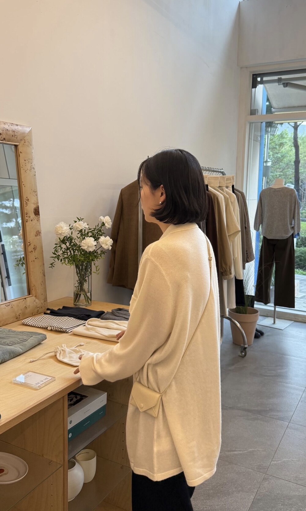 가볍고 부드러운 소재감이 특징이며 얇은 게이지로 짜여져 가벼운 착용감을 자랑합니다. 울 소재로 제작되었으며 가디건 및 블라우스로 활용 가능한 제품입니다.