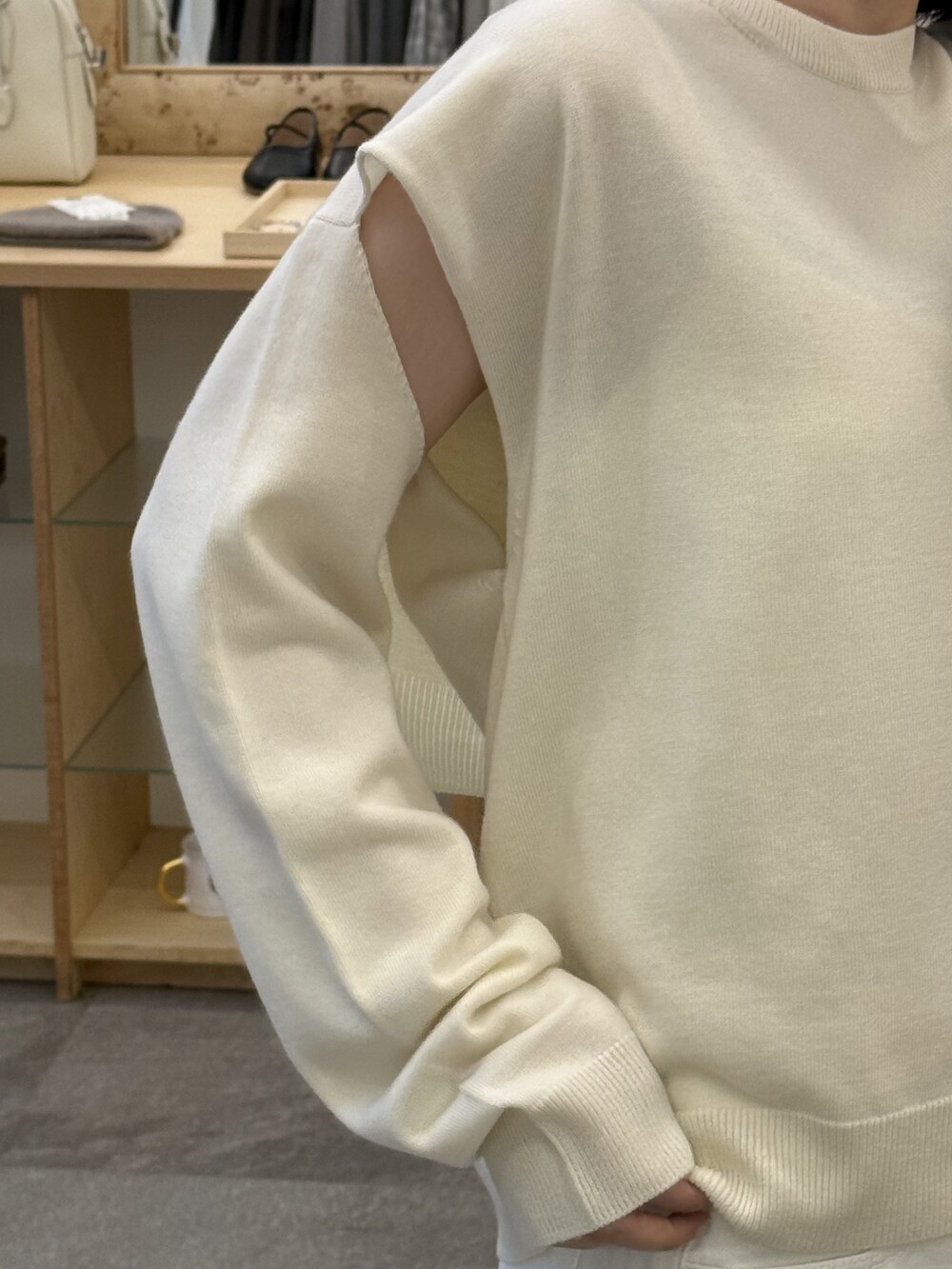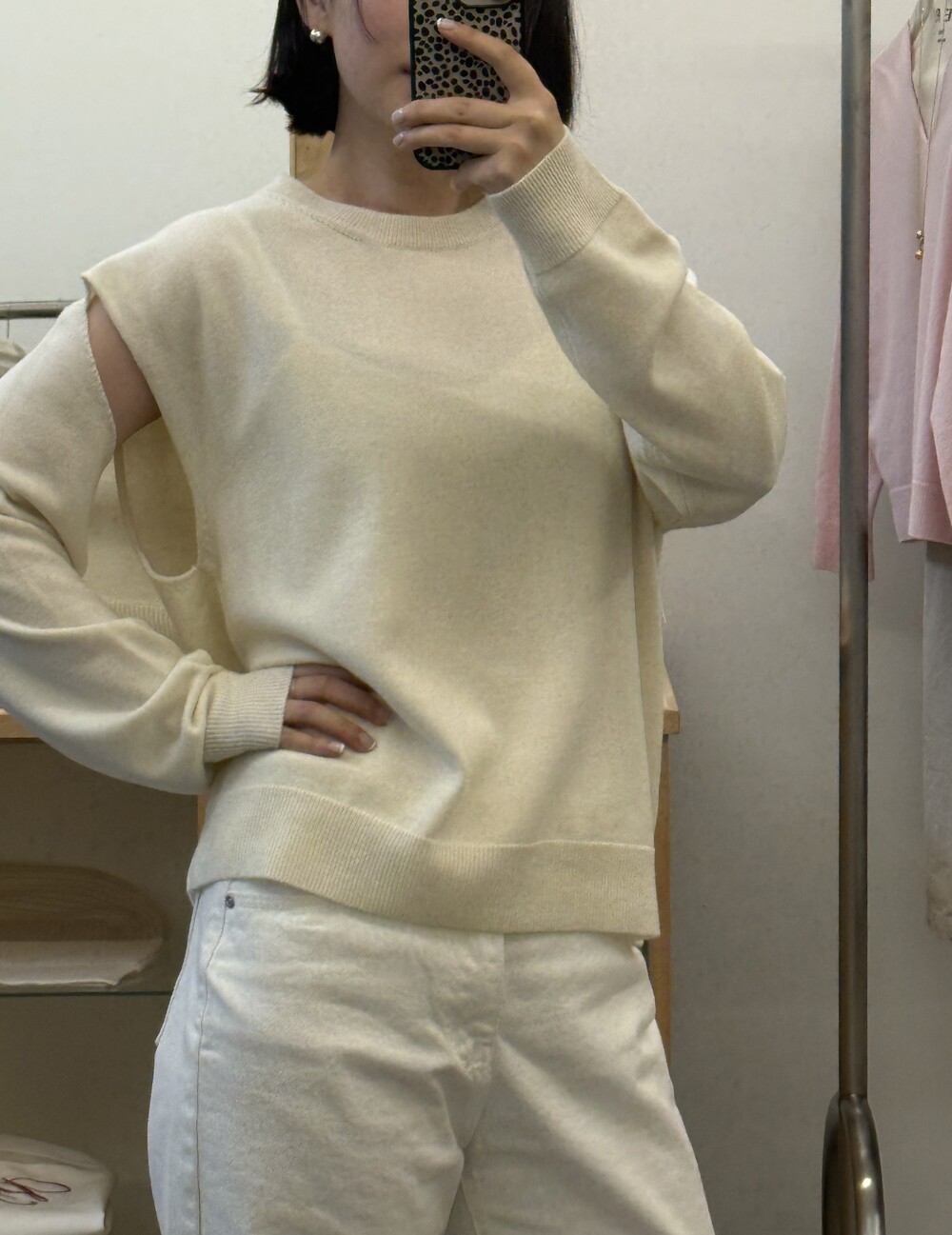볼레로가 연결된 구조로 별도의 아우터 없이도 자연스럽게 레이어드가 완성되는 슬릿 니트입니다.