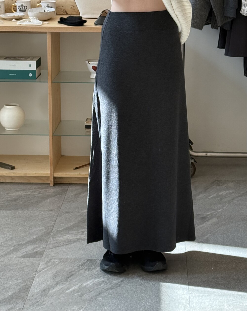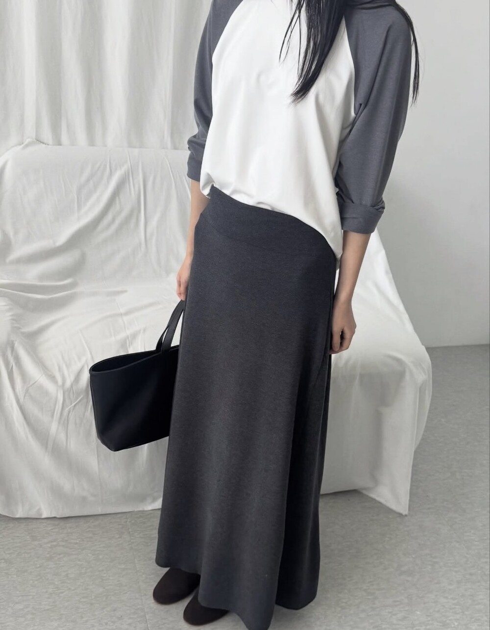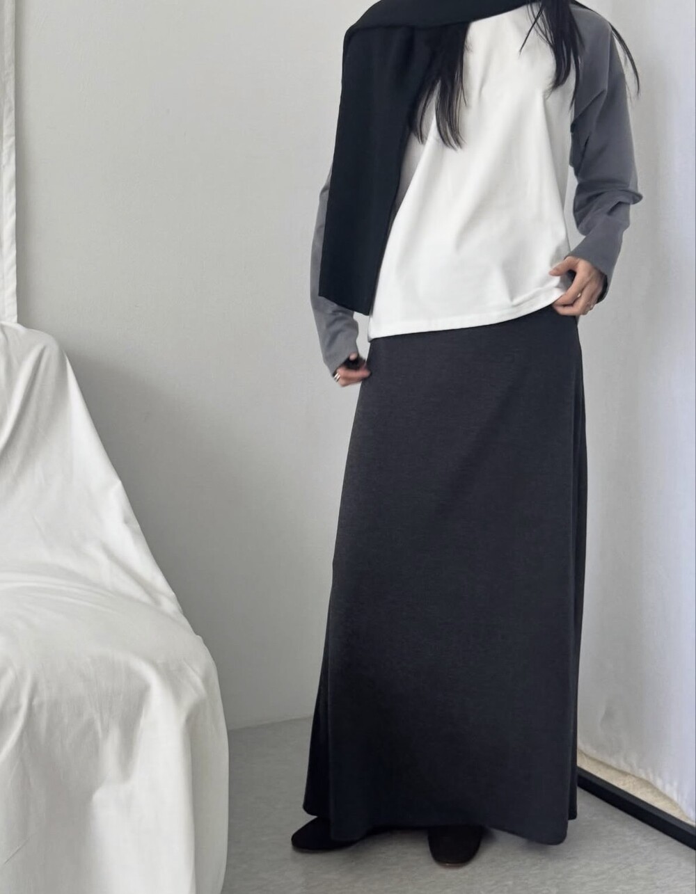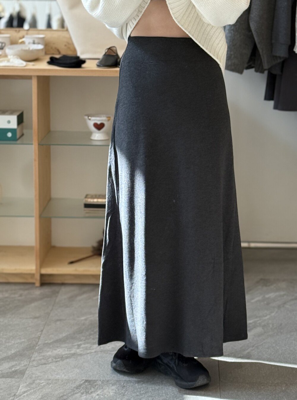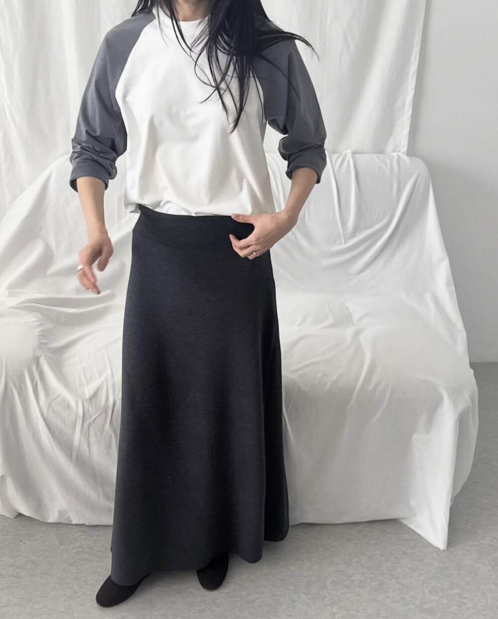 사이즈는 밴딩 타입으로 44~77까지 다양하게 착용 가능합니다. 혹시 맥시한 기장감이 부담스러우신 고객님은 수선하지 않고 허리를 한단 접어서 착용해 주세요!.