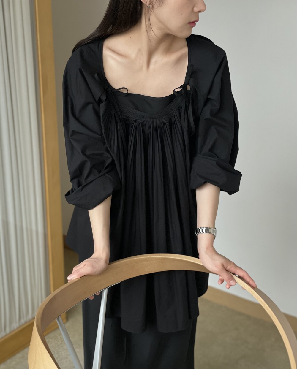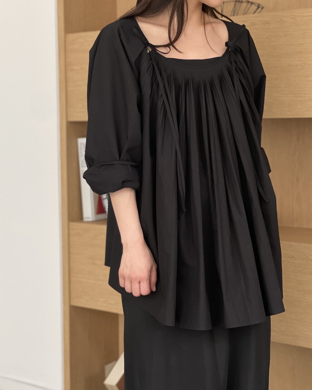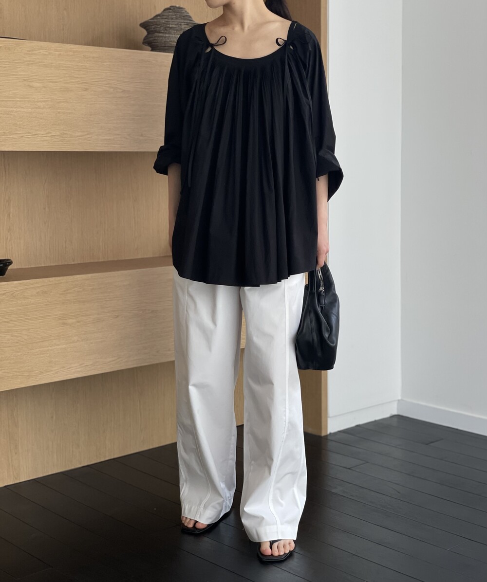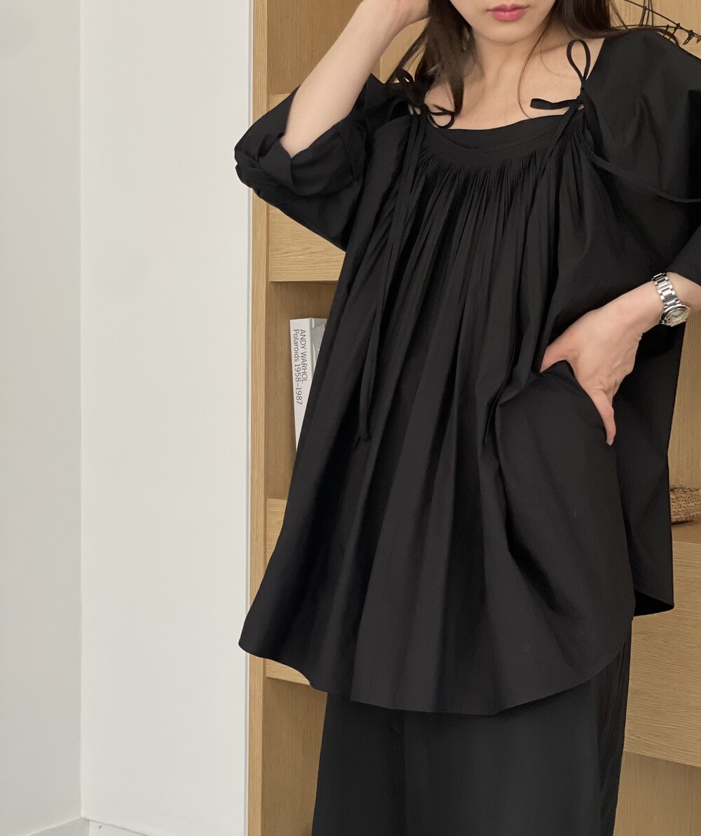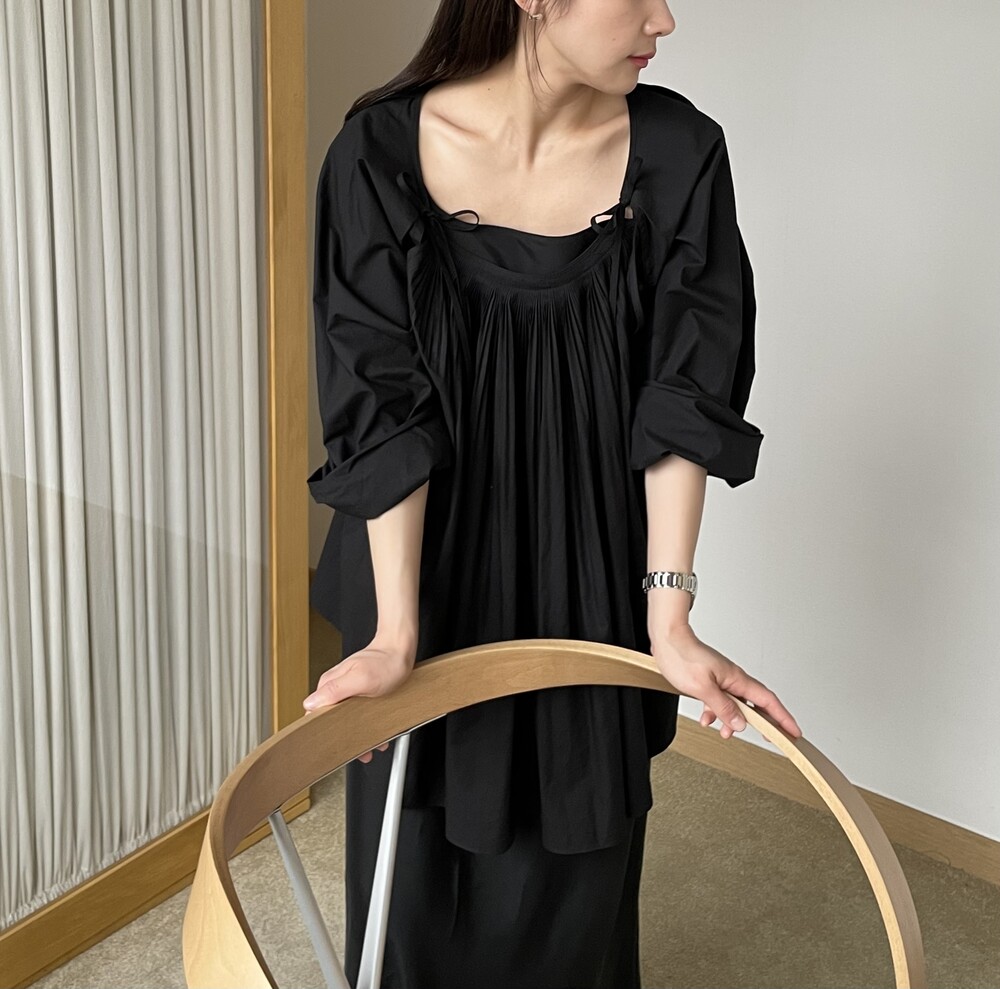 앞 부분에 셔링과 타이를 넣어 미니멀한 여성스러운 느낌을 살리면서 블랙 컬러로 시크한 분위기를 자아냅니다.