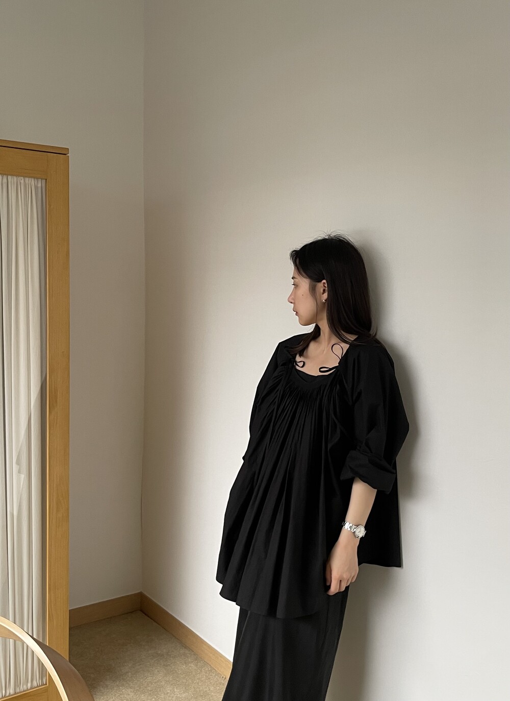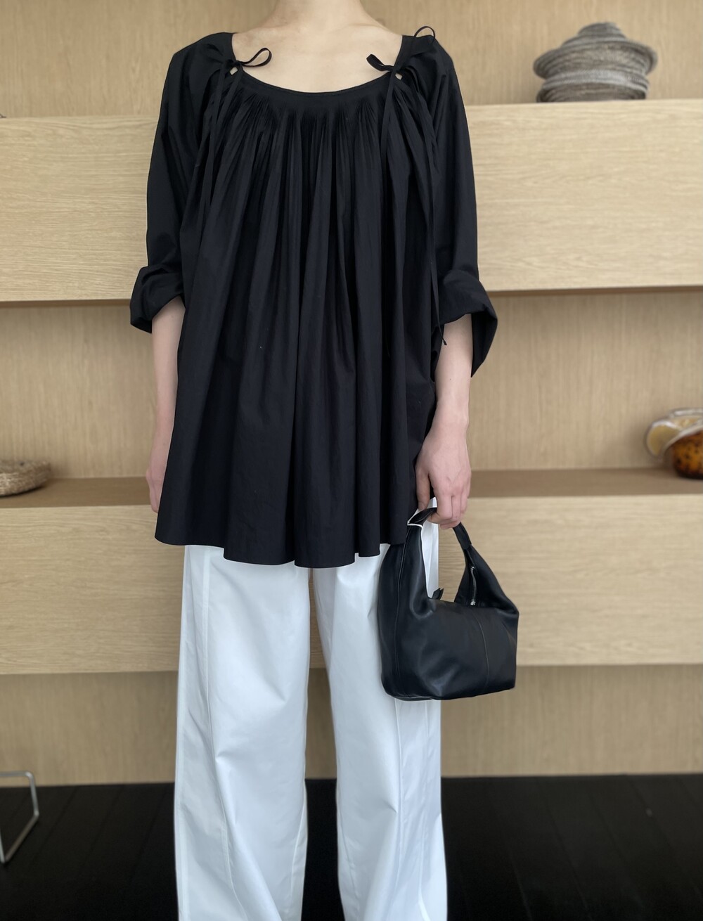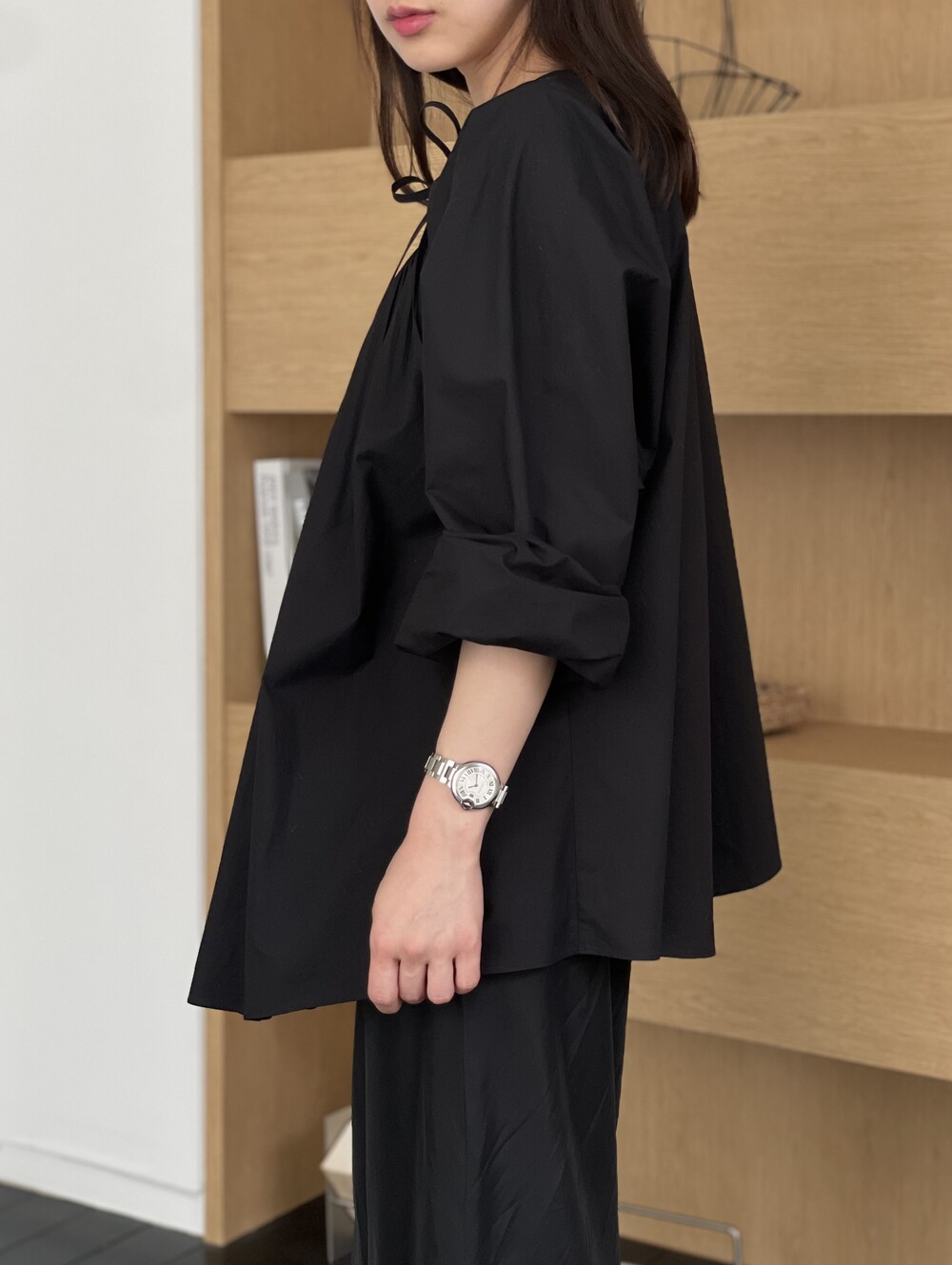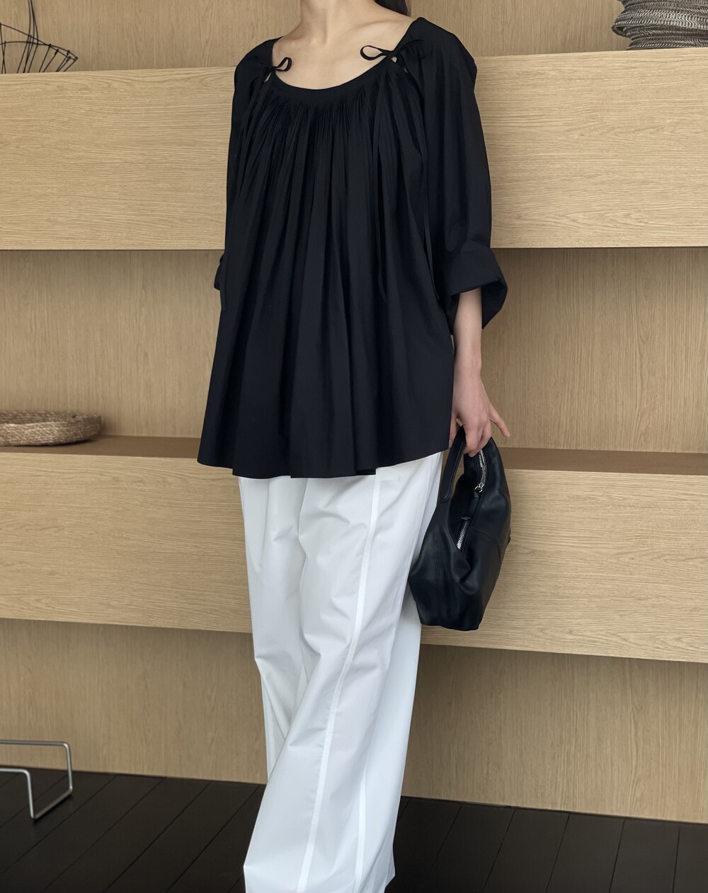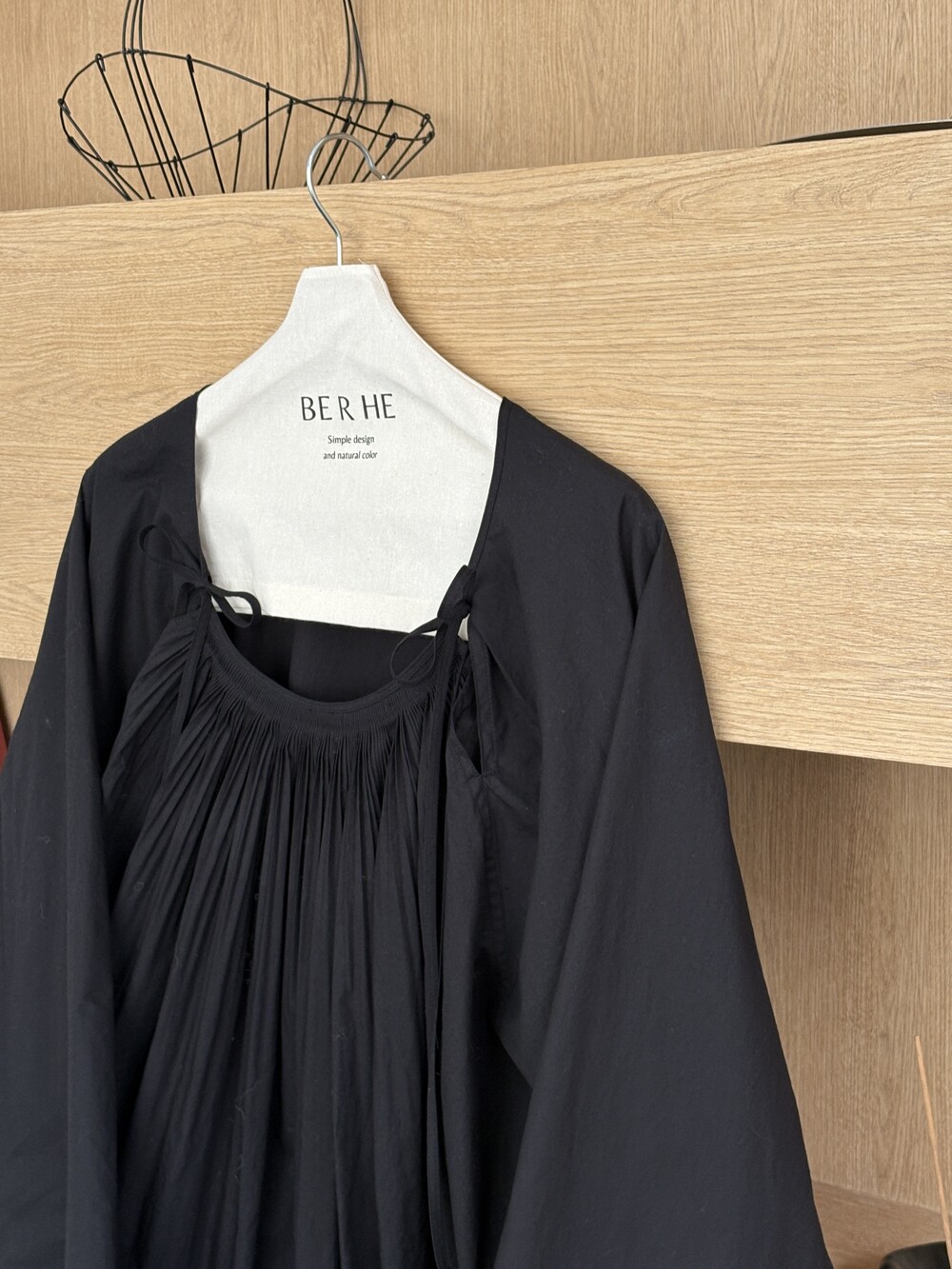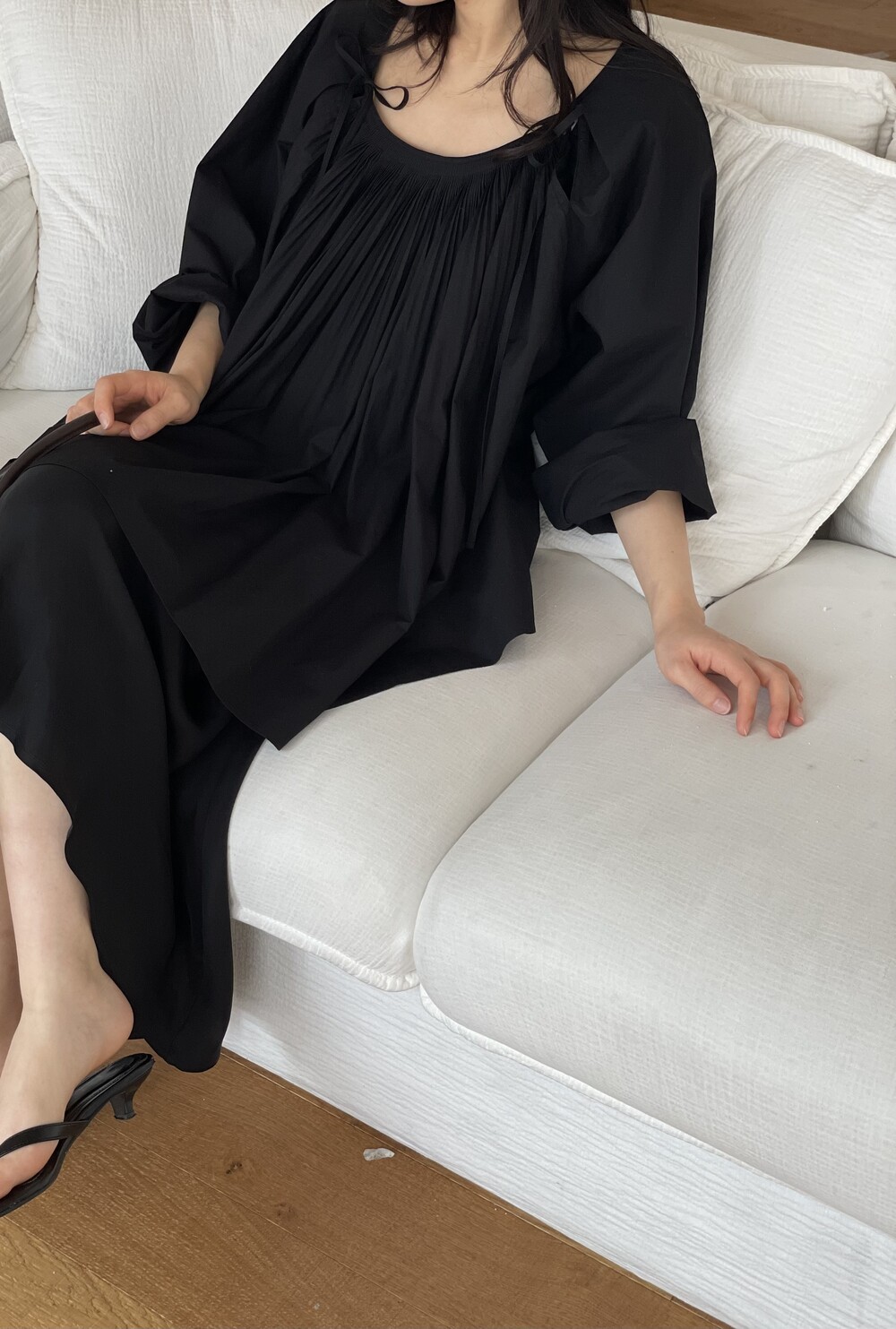 앞 부분에 셔링과 타이를 넣어 미니멀한 여성스러운 느낌을 살리면서 블랙 컬러로 시크한 분위기를 자아냅니다.