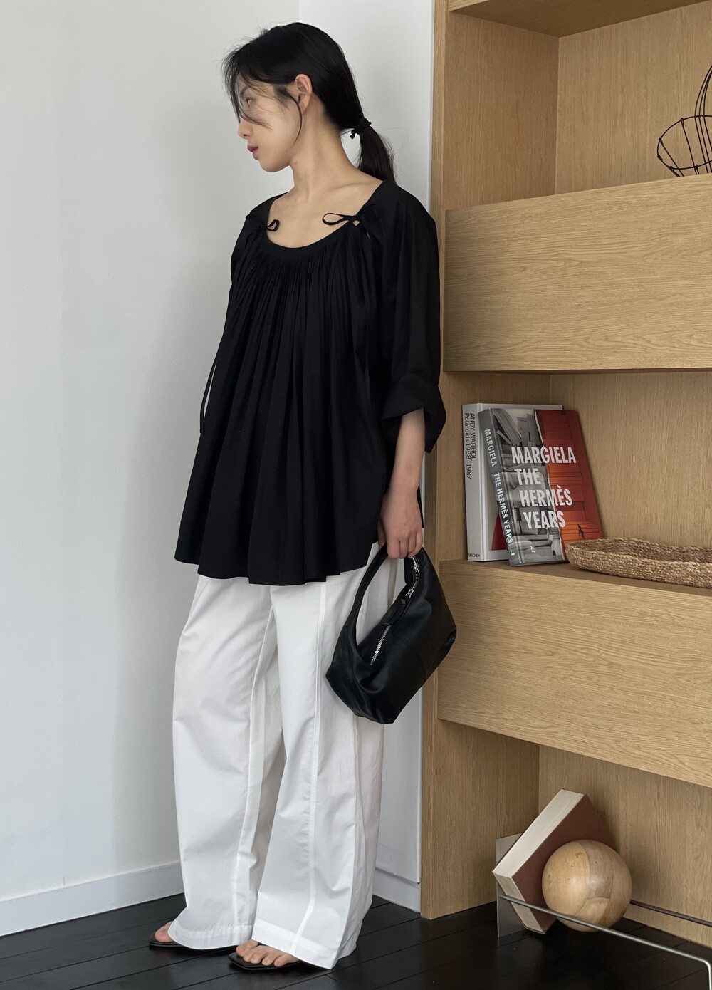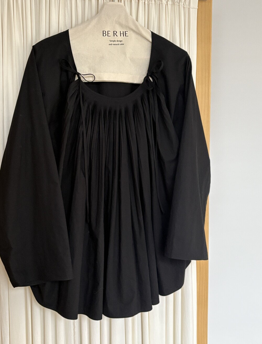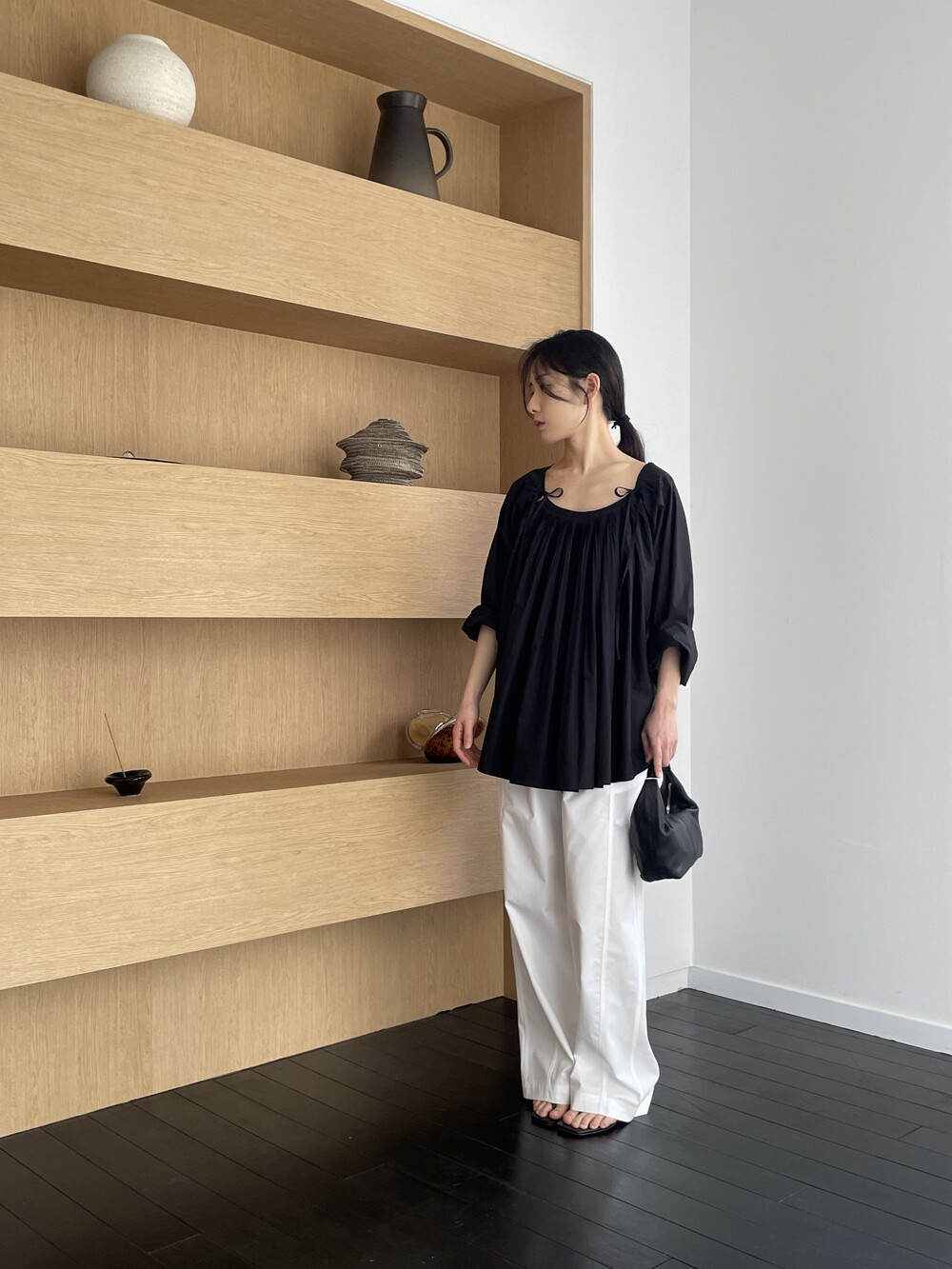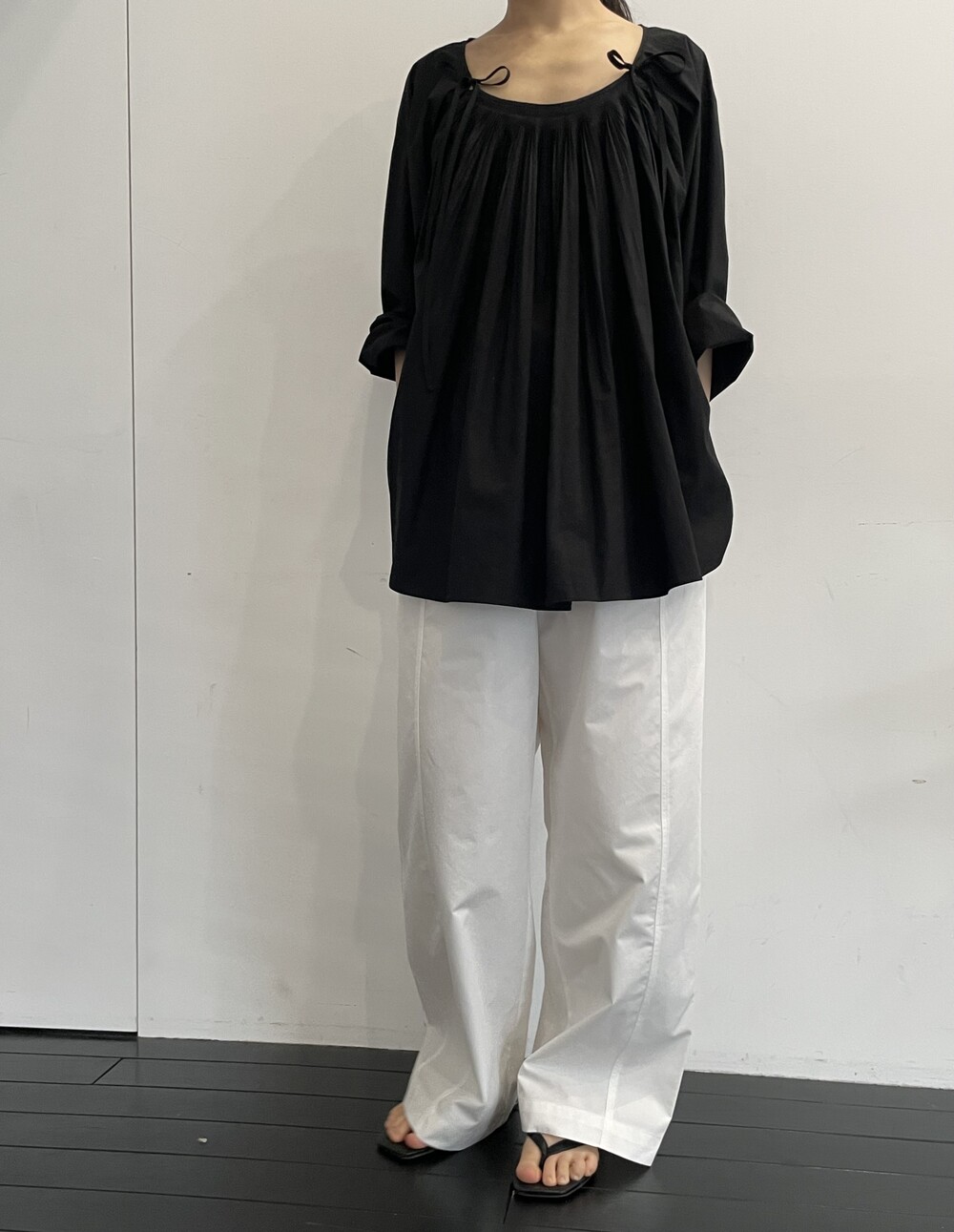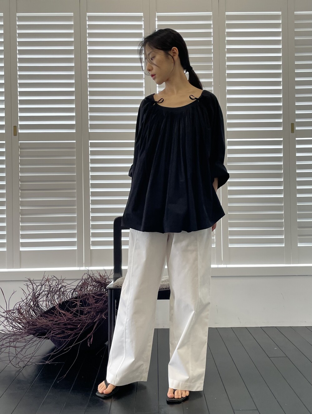 앞 부분에 셔링과 타이를 넣어 미니멀한 여성스러운 느낌을 살리면서 블랙 컬러로 시크한 분위기를 자아냅니다.