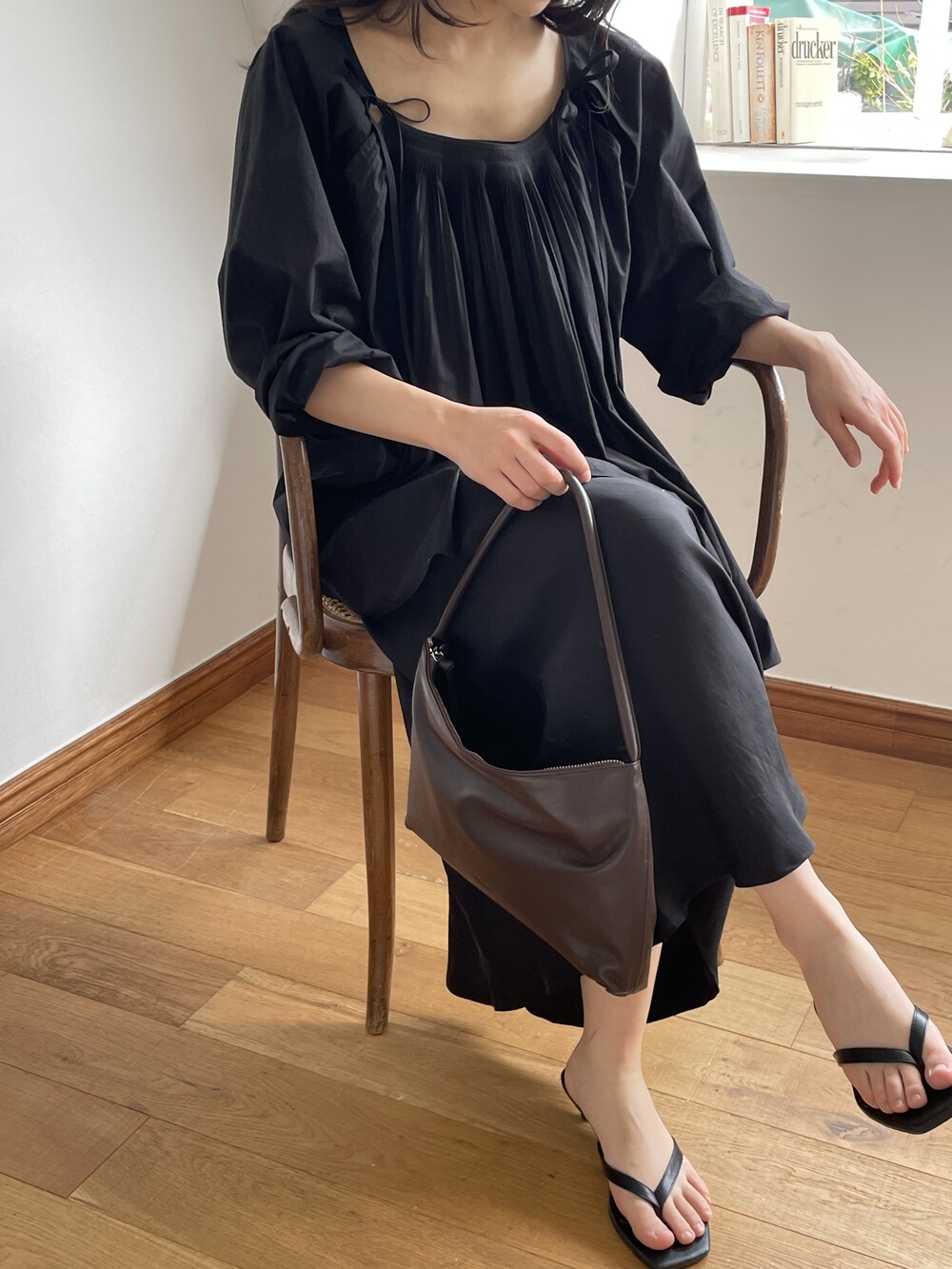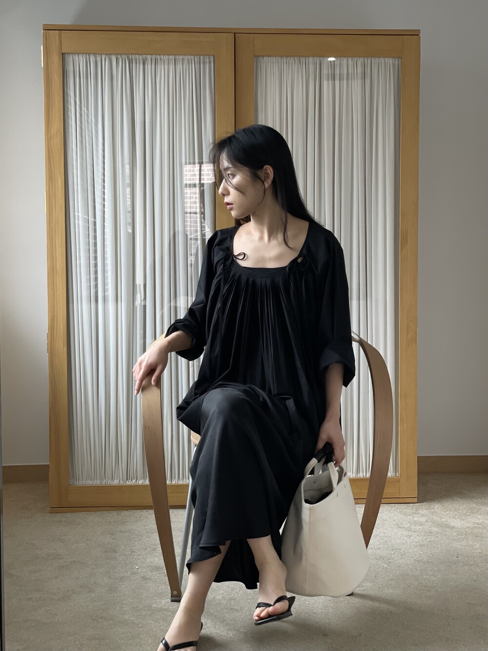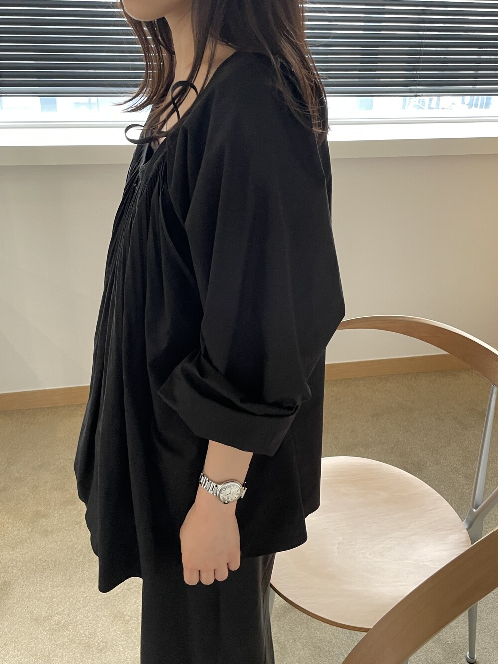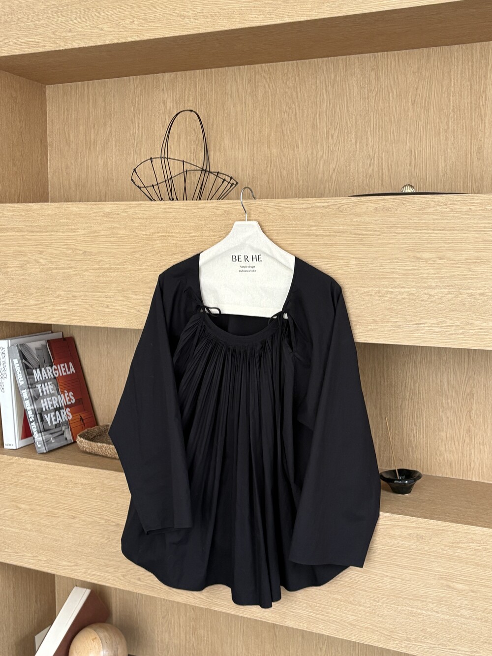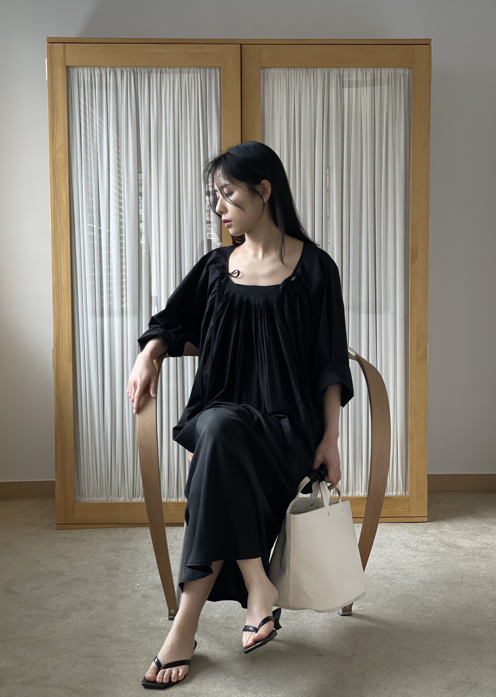 앞 부분에 셔링과 타이를 넣어 미니멀한 여성스러운 느낌을 살리면서 블랙 컬러로 시크한 분위기를 자아냅니다.