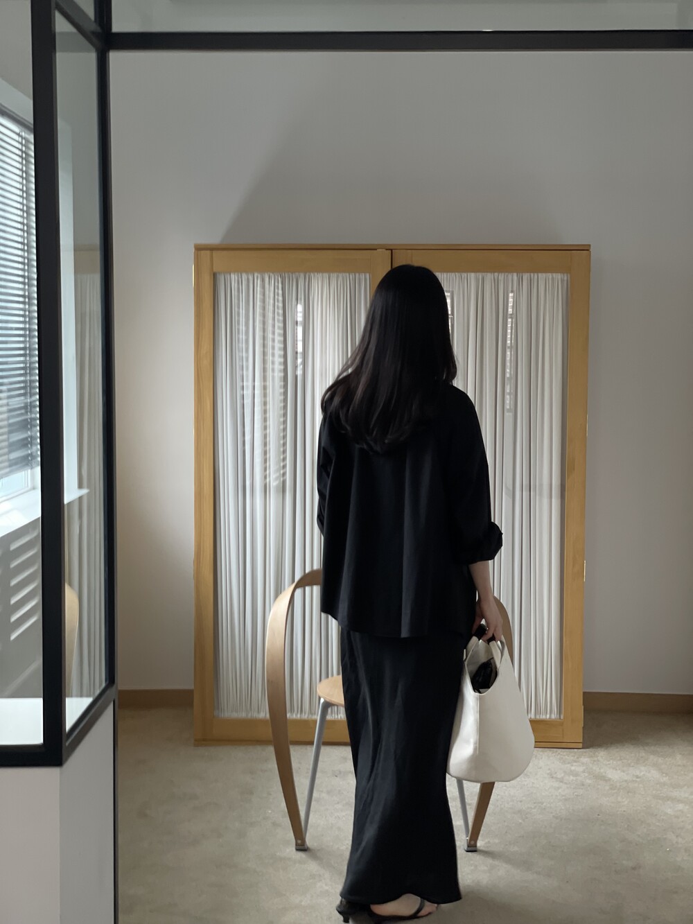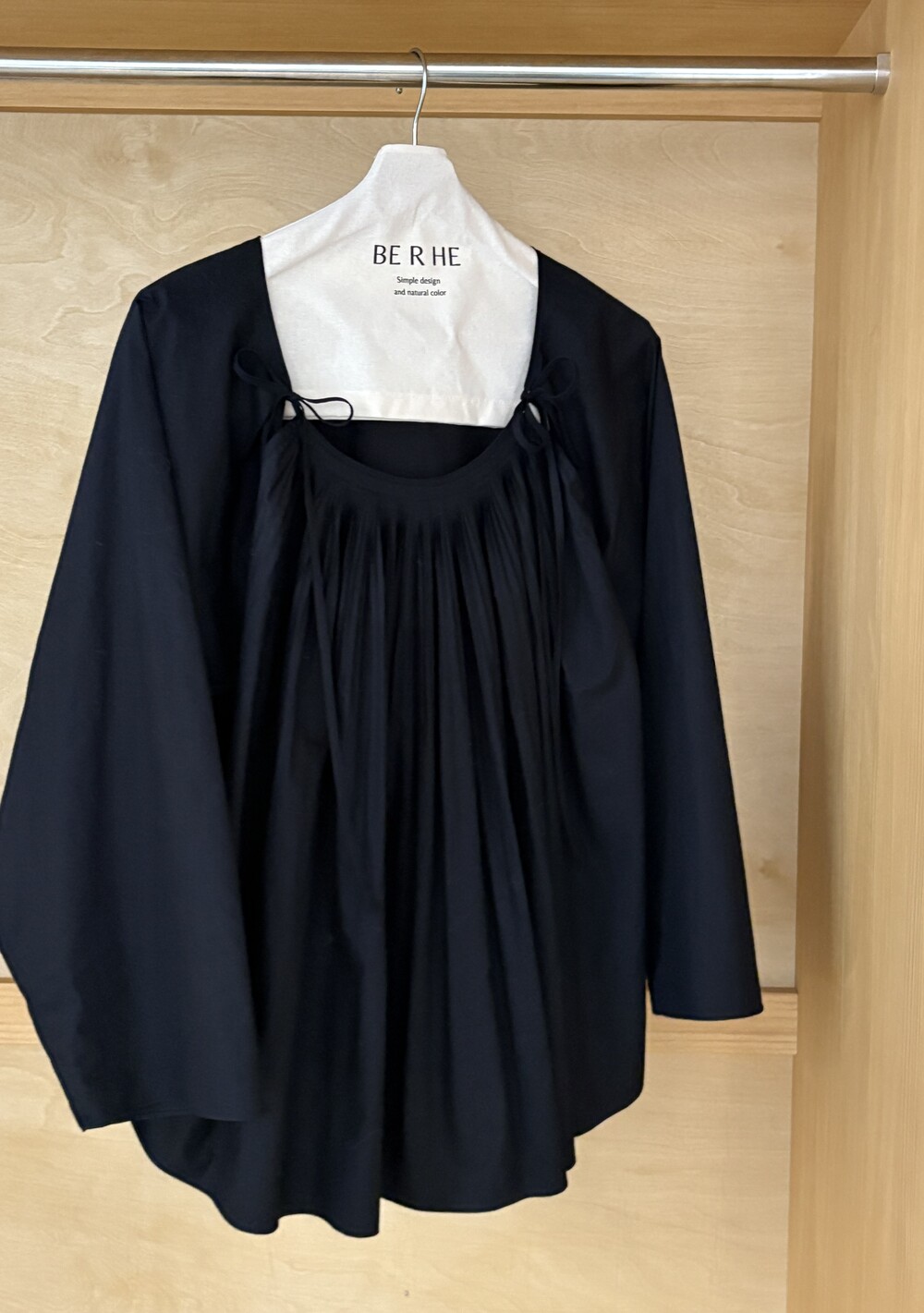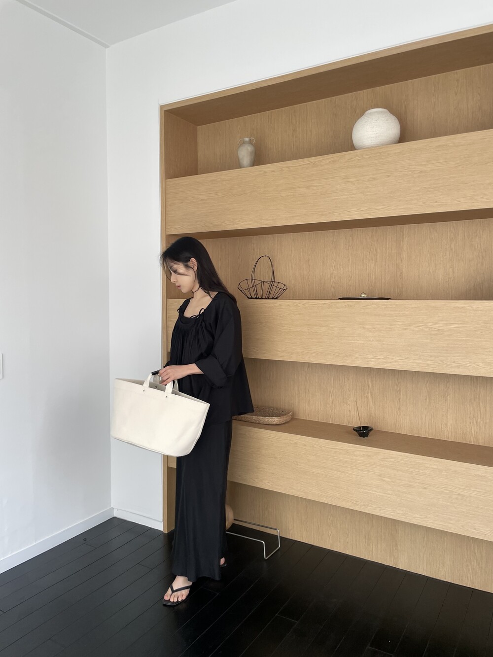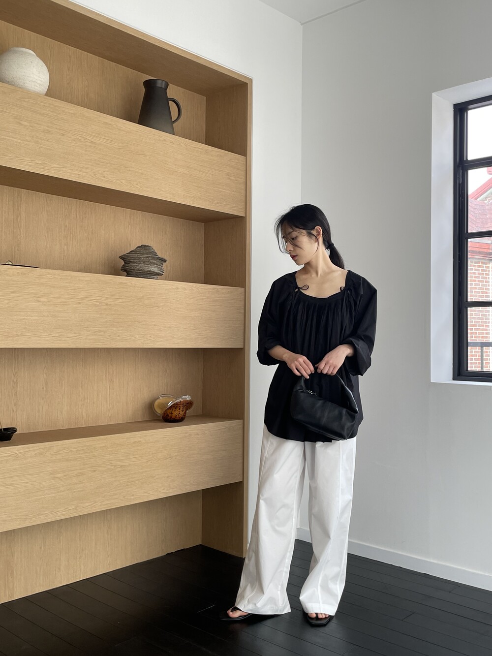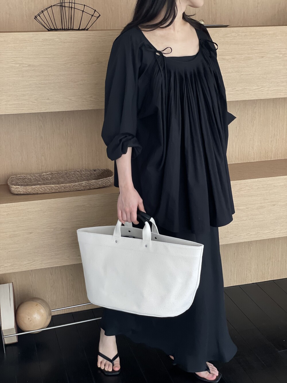 앞 부분에 셔링과 타이를 넣어 미니멀한 여성스러운 느낌을 살리면서 블랙 컬러로 시크한 분위기를 자아냅니다.