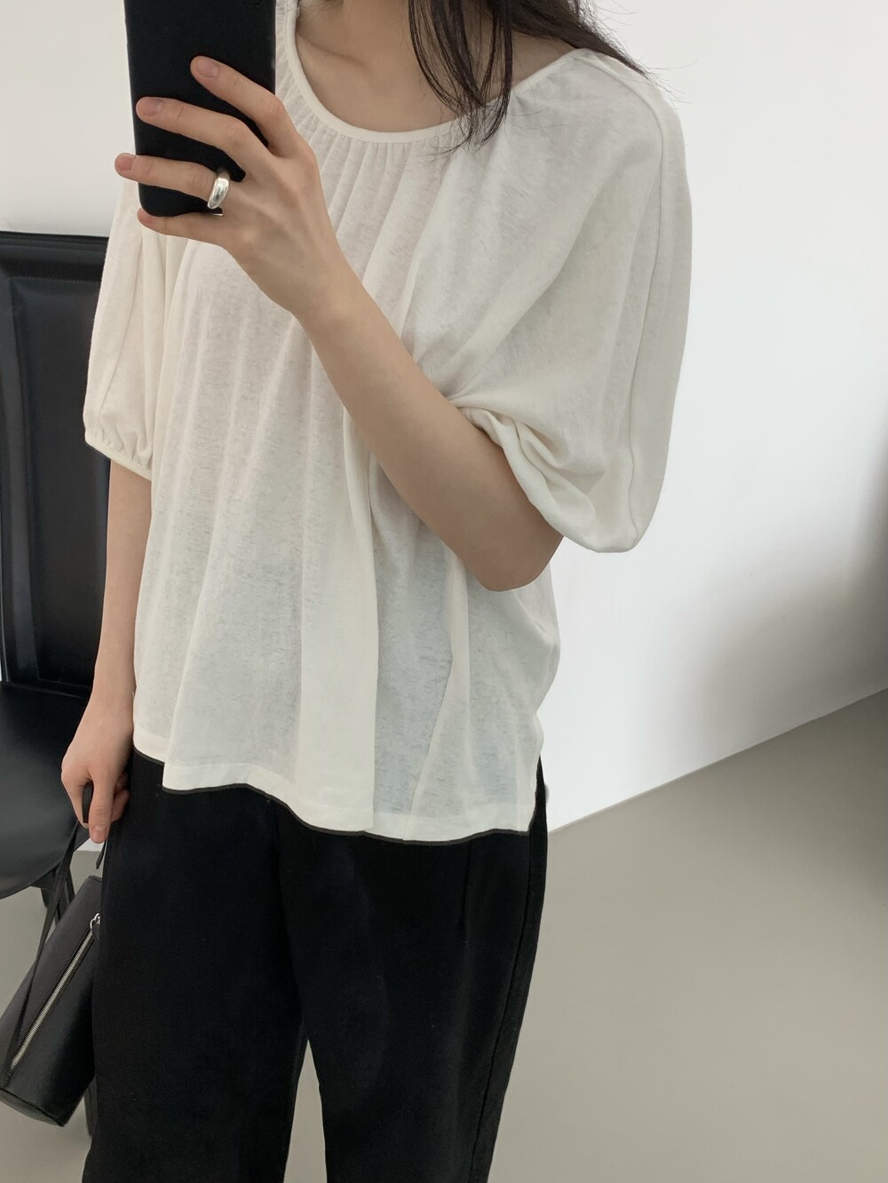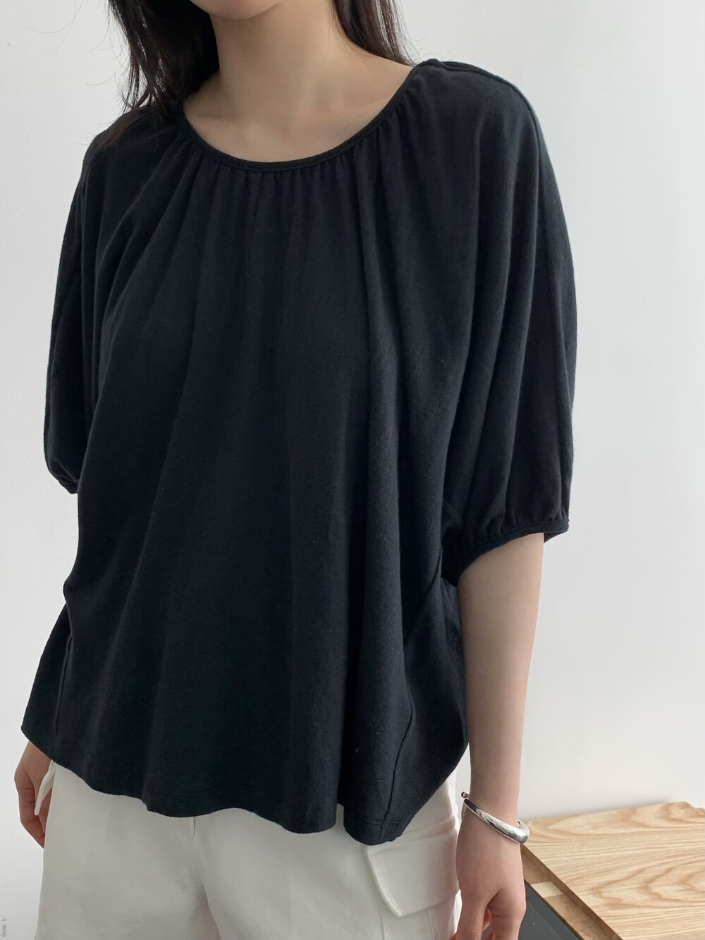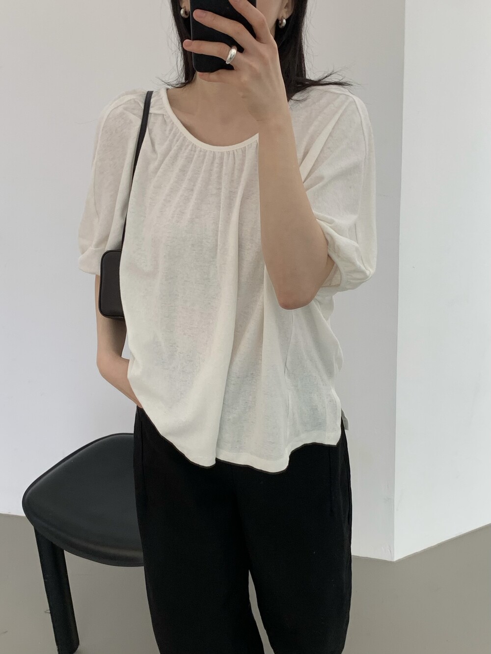 넥라인에 잔잔하게 잡힌 셔링 디테일이 얼굴선을 부드럽게 만들어주고,