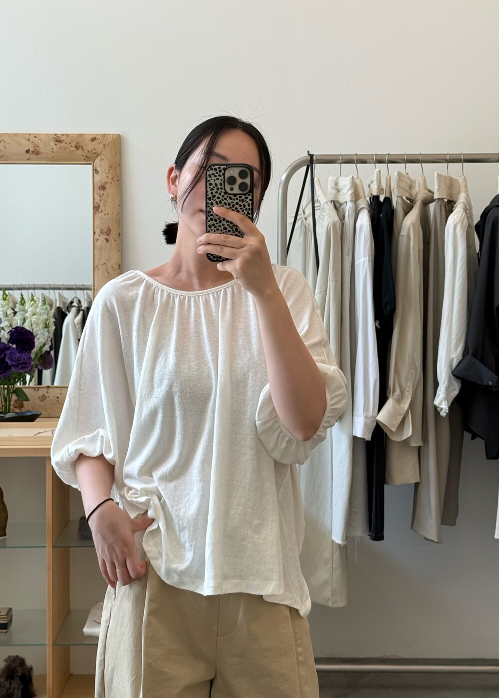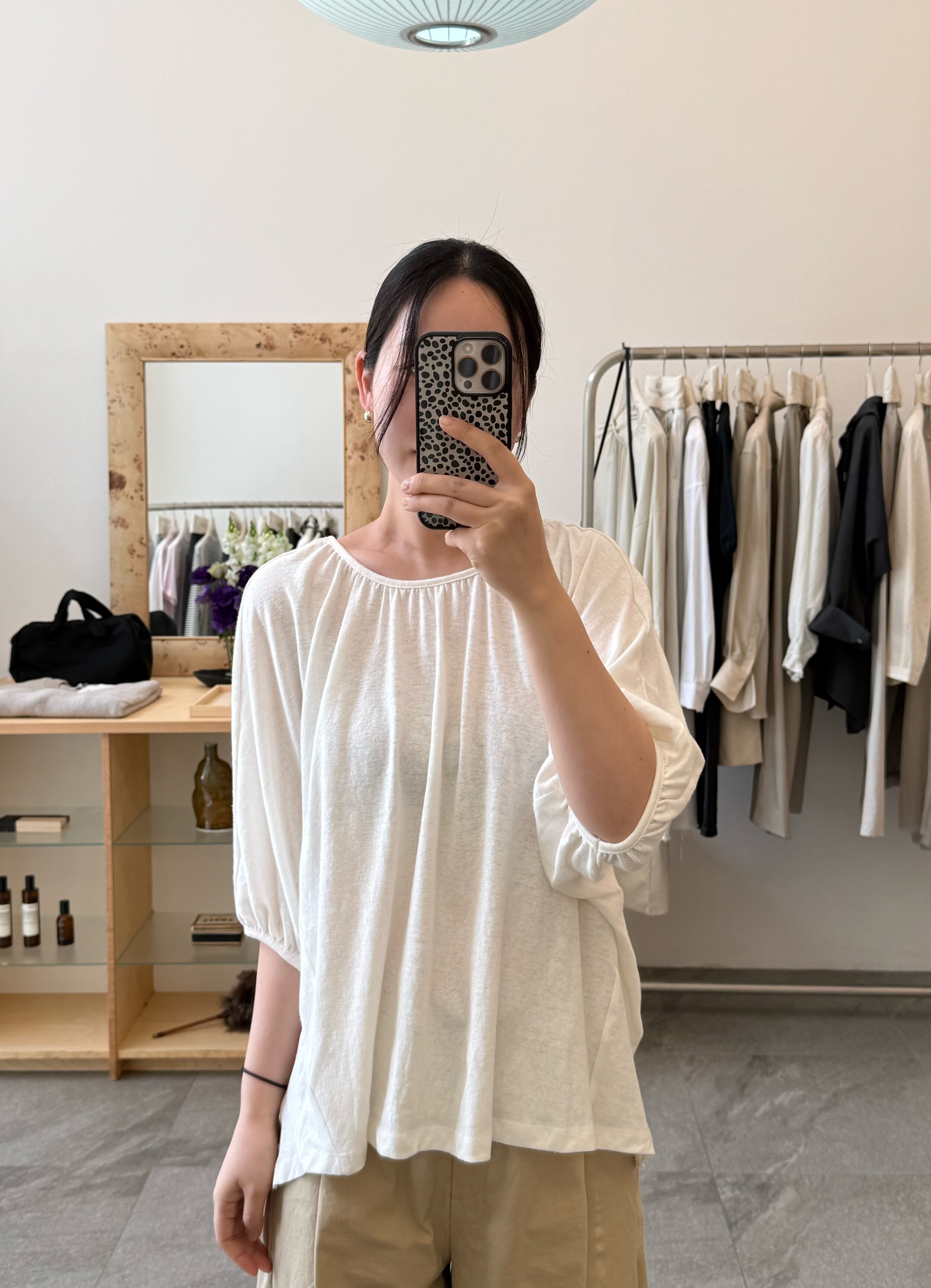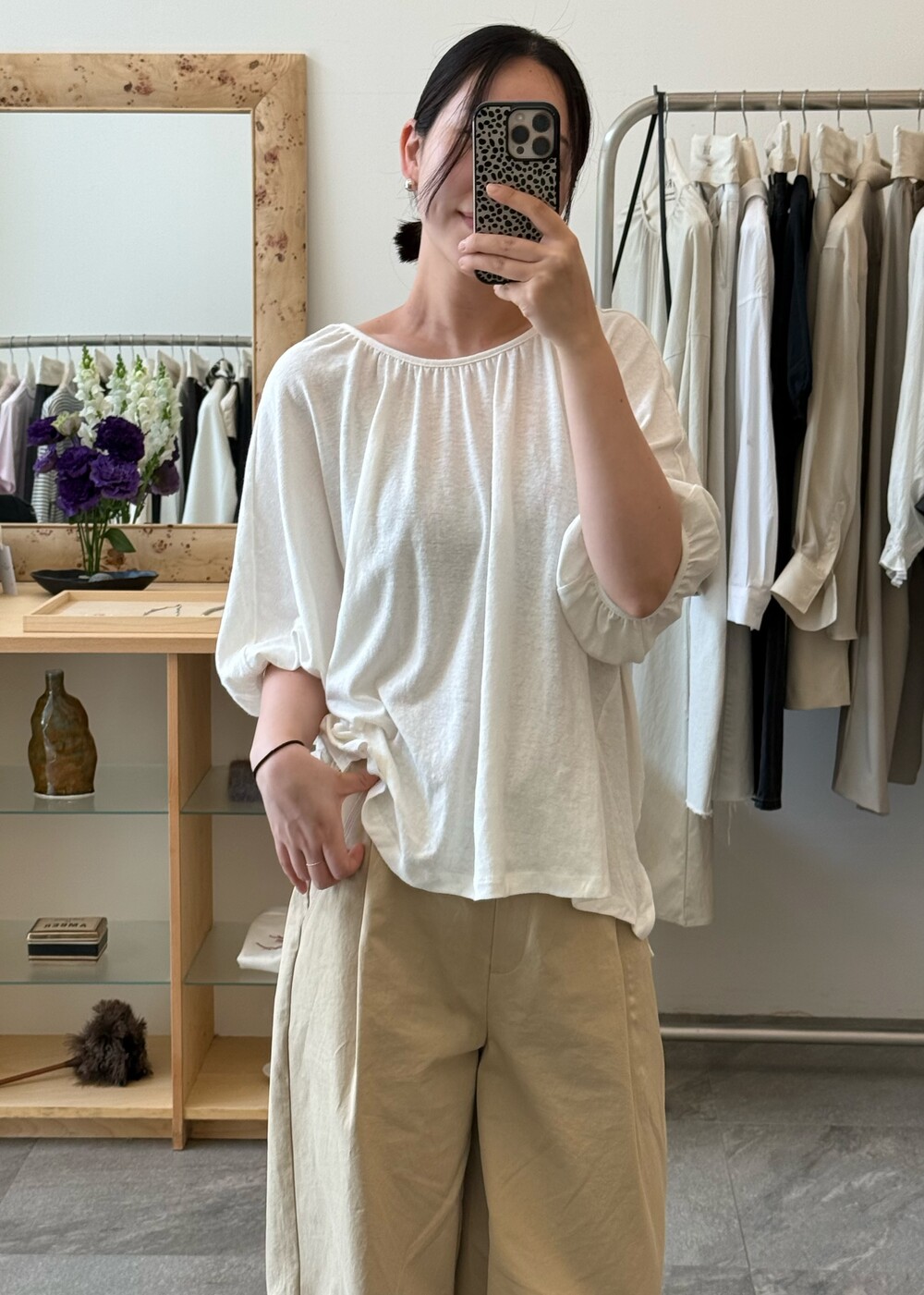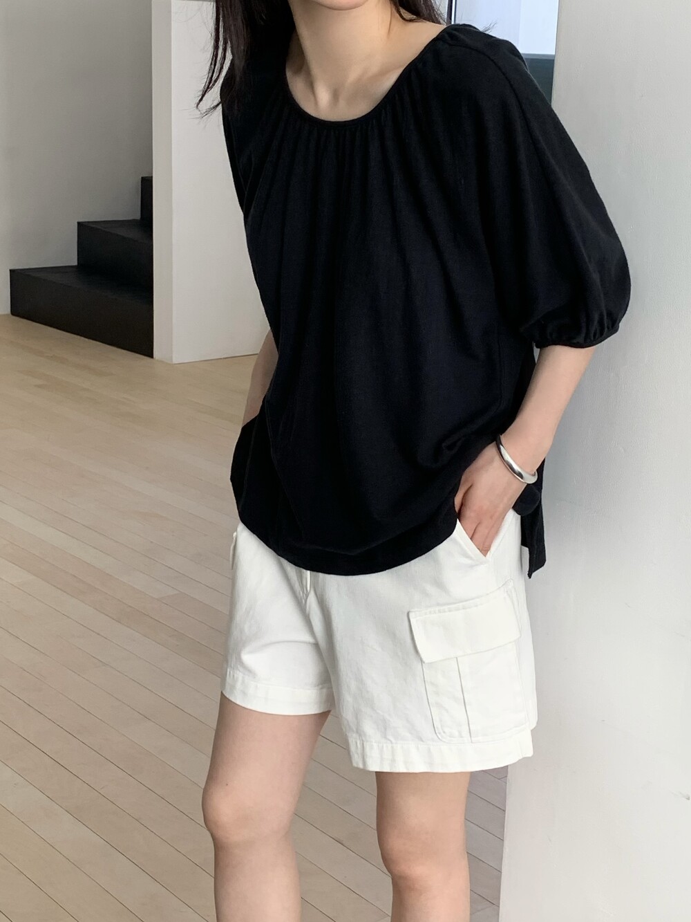 넥라인에 잔잔하게 잡힌 셔링 디테일이 얼굴선을 부드럽게 만들어주고,