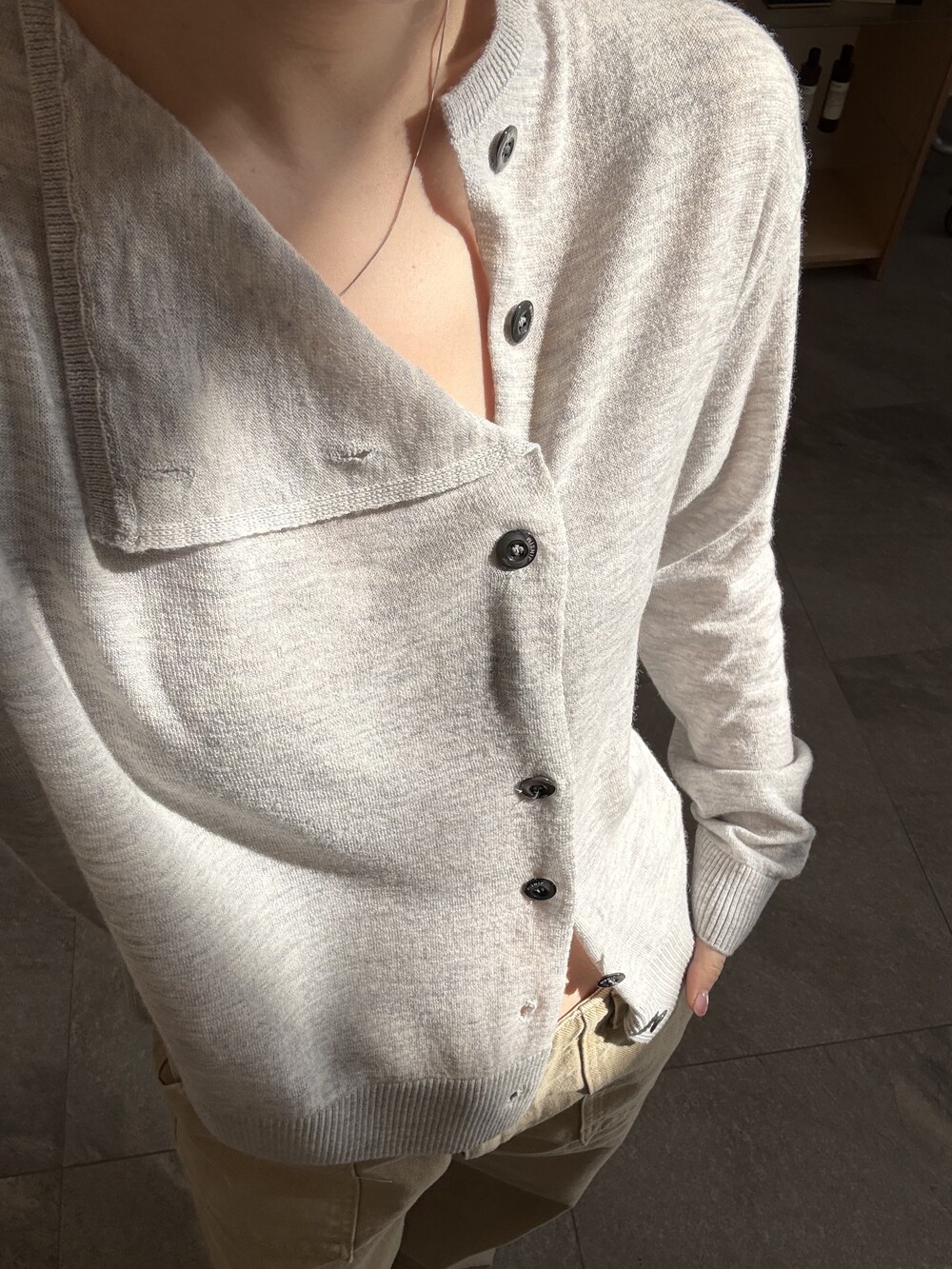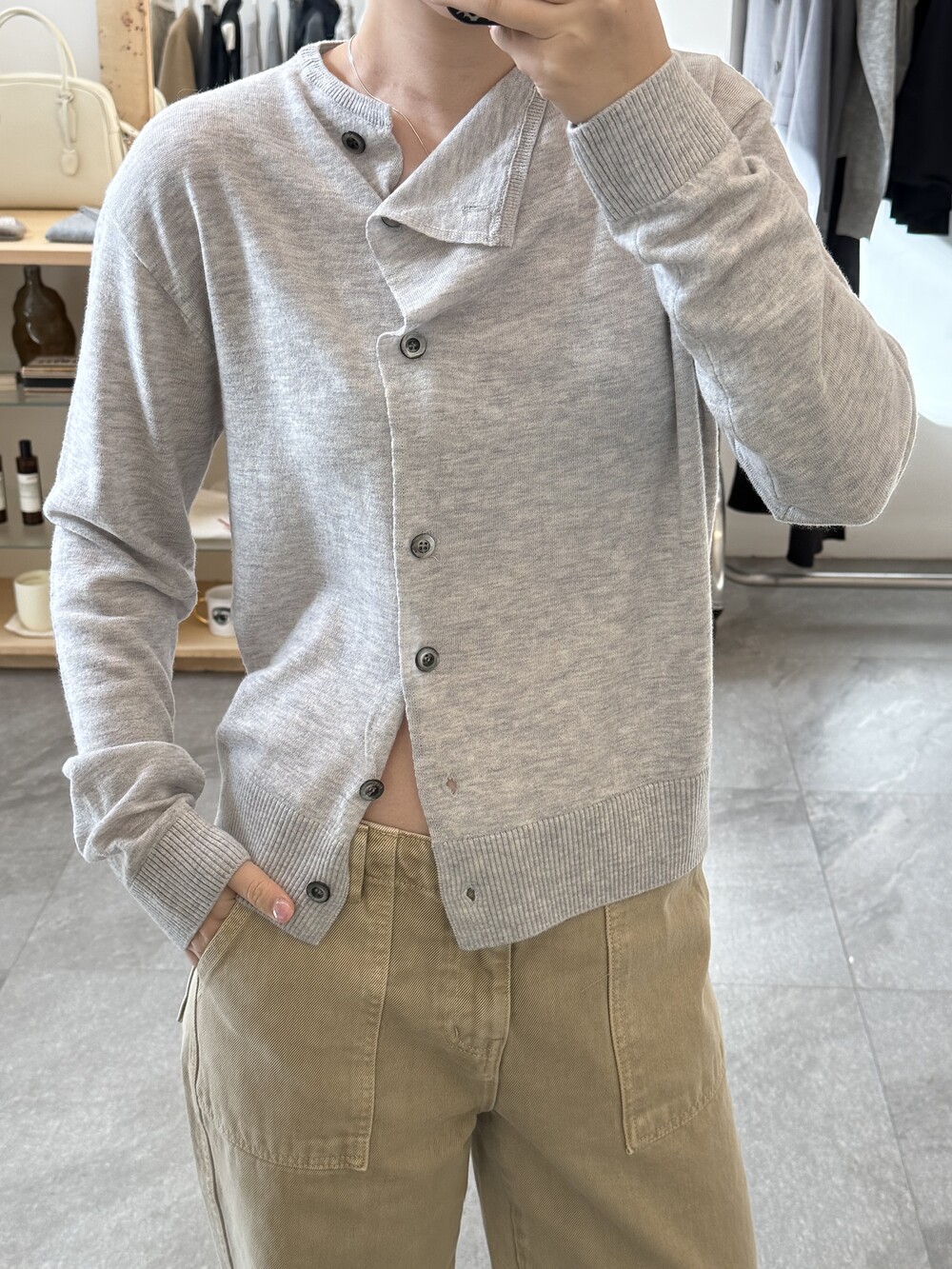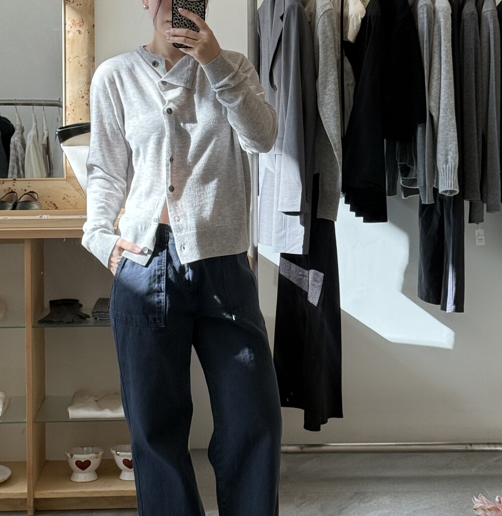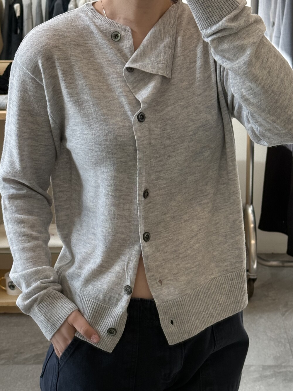넥 라인이 사선으로 떨어지는 유니크한 디자인이라 단추를 어떻게 채우느냐에 따라 분위기가 달라져요.