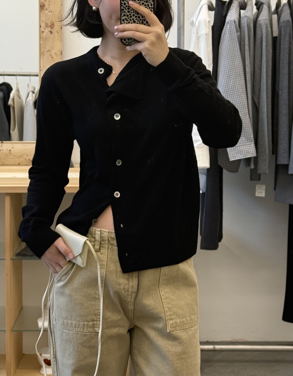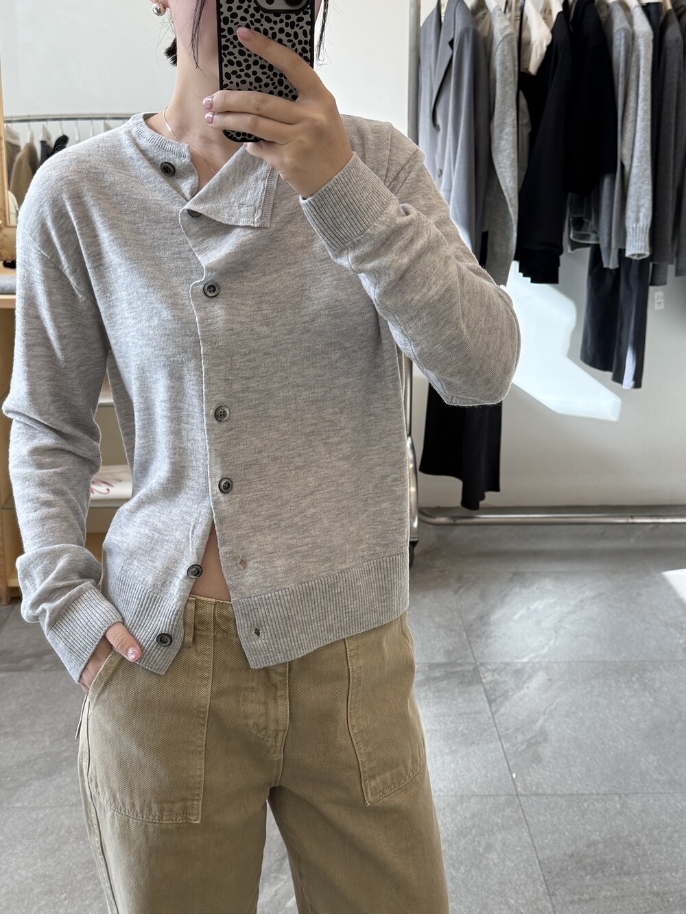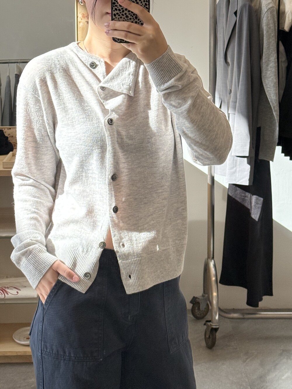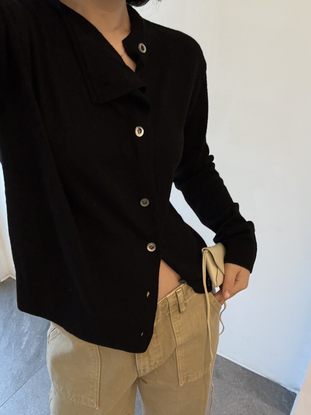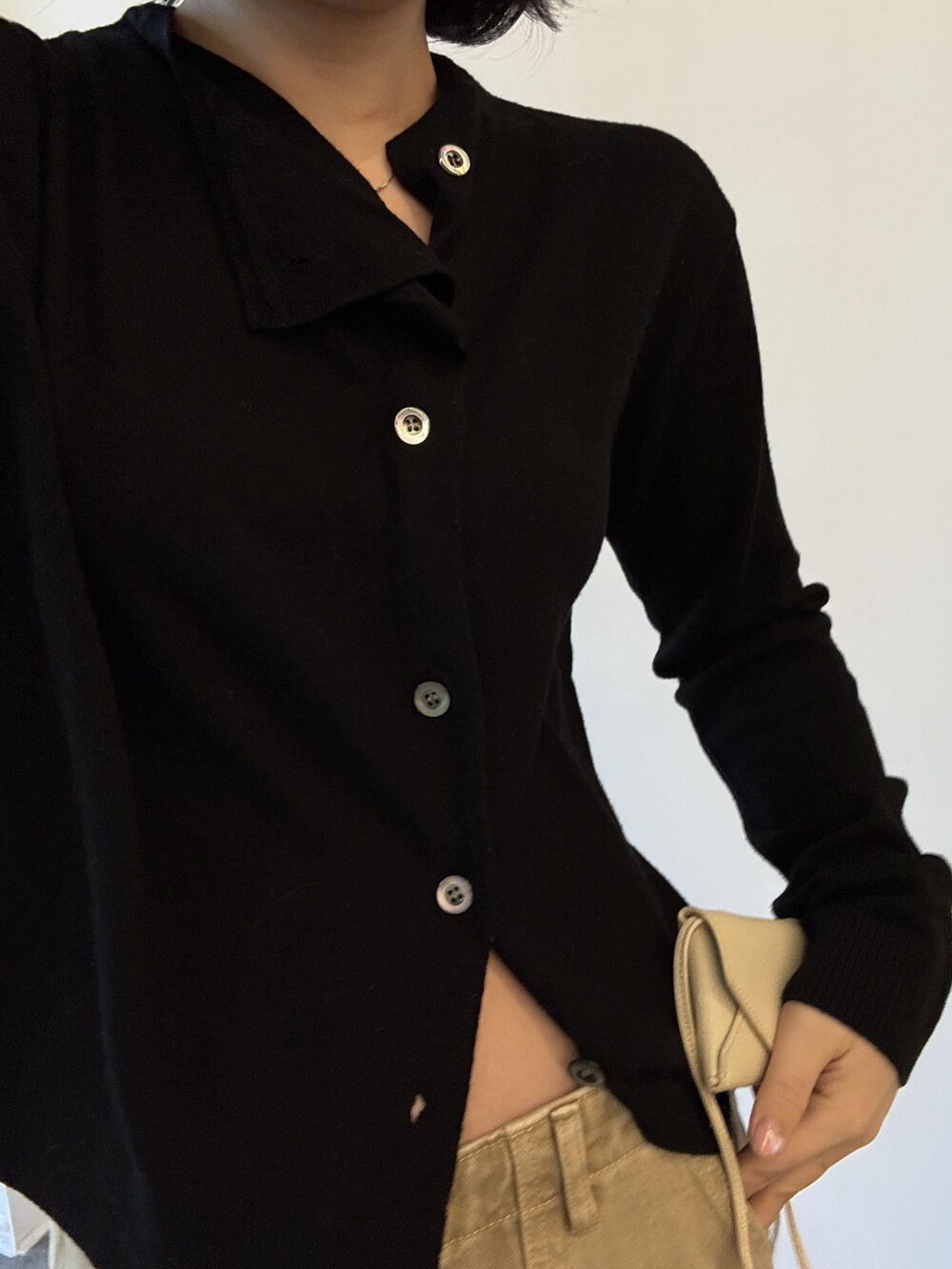 넥 라인이 사선으로 떨어지는 유니크한 디자인이라 단추를 어떻게 채우느냐에 따라 분위기가 달라져요.