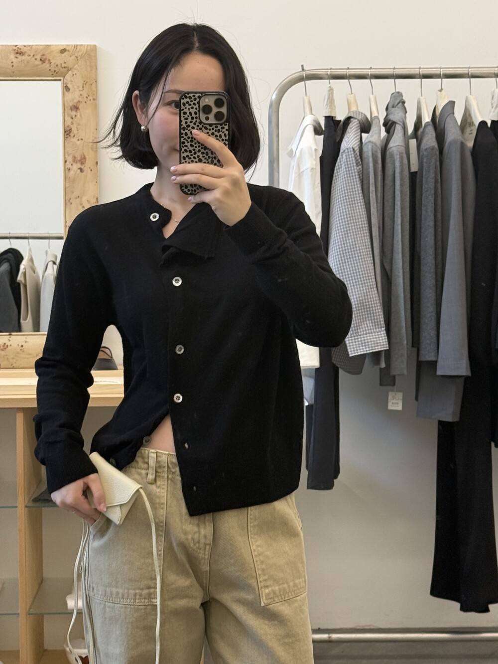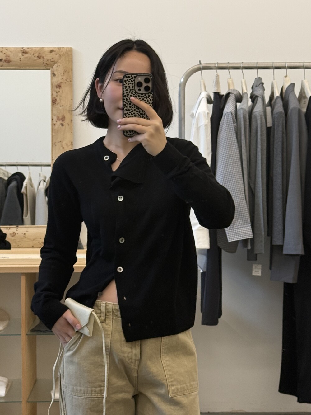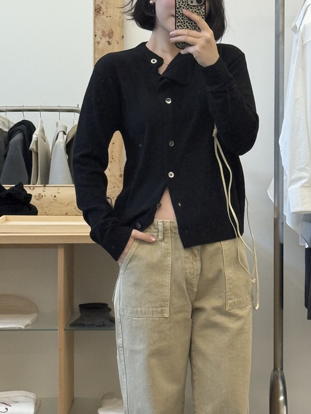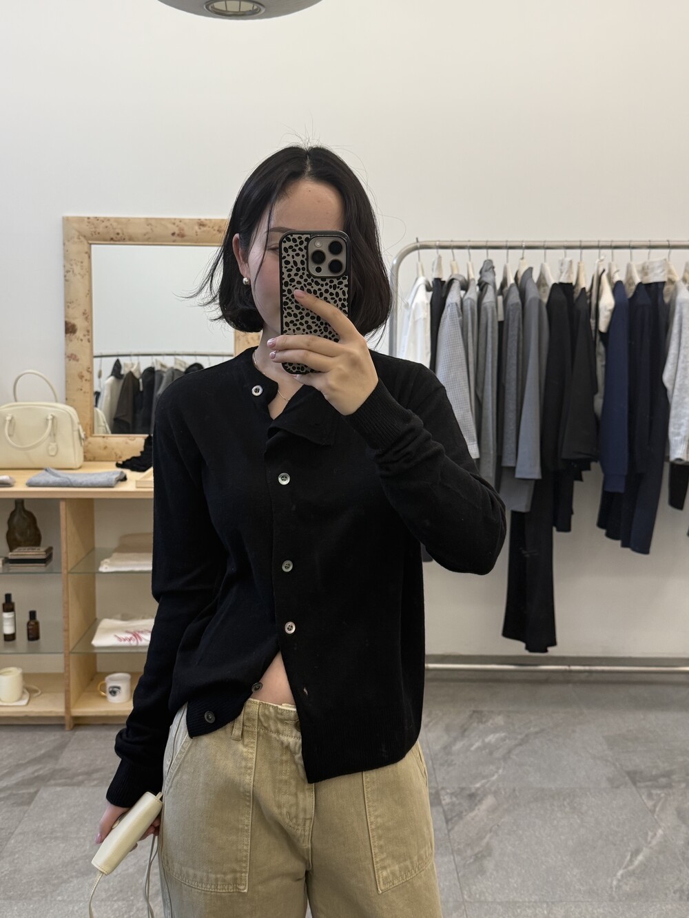넥 라인이 사선으로 떨어지는 유니크한 디자인이라 단추를 어떻게 채우느냐에 따라 분위기가 달라져요.