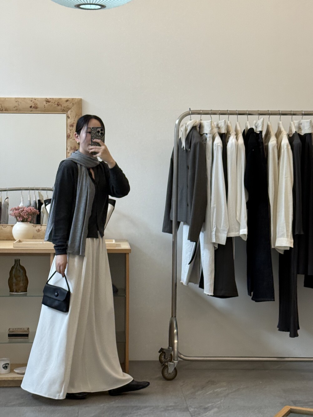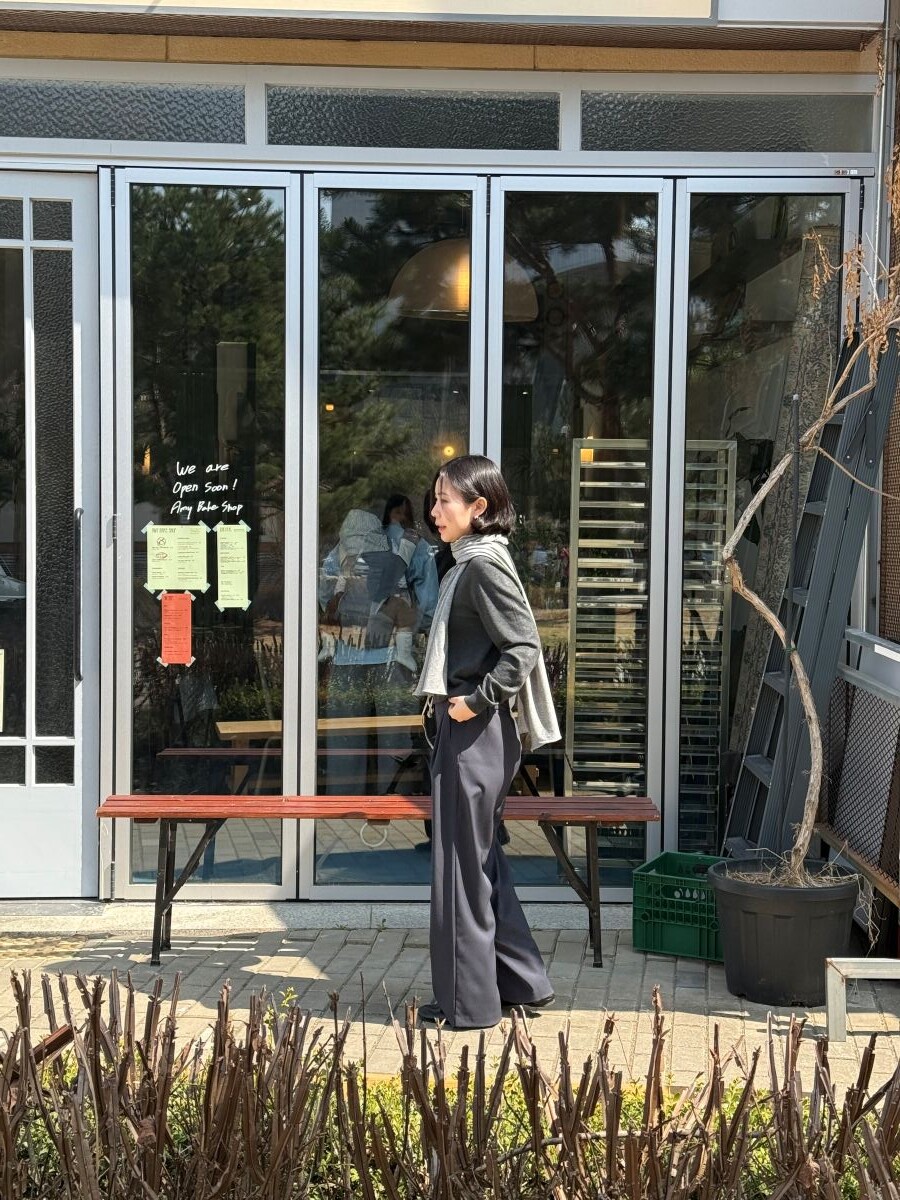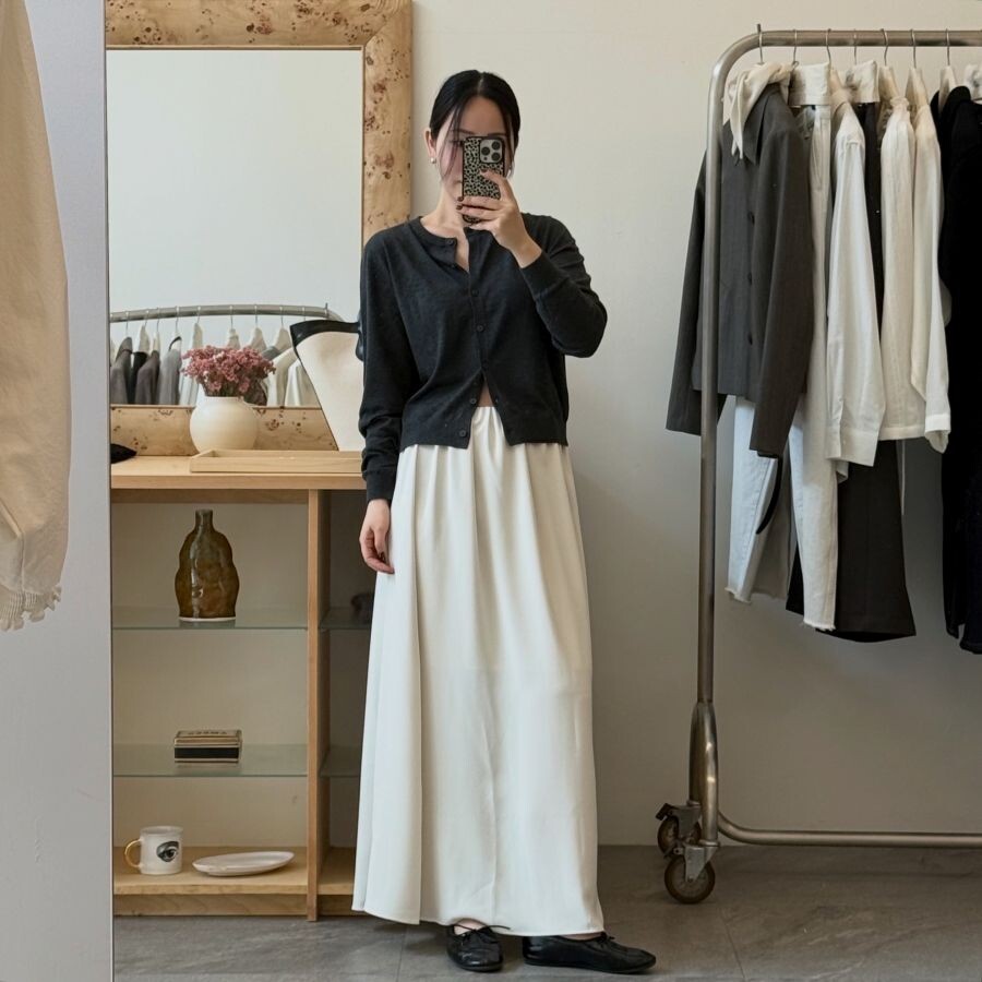 가볍게 흐르는 텍스처가 바디 라인을 따라 자연스럽게 떨어지면서, 입었을 때 한층 더 슬림한 실루엣을 만들어줍니다.