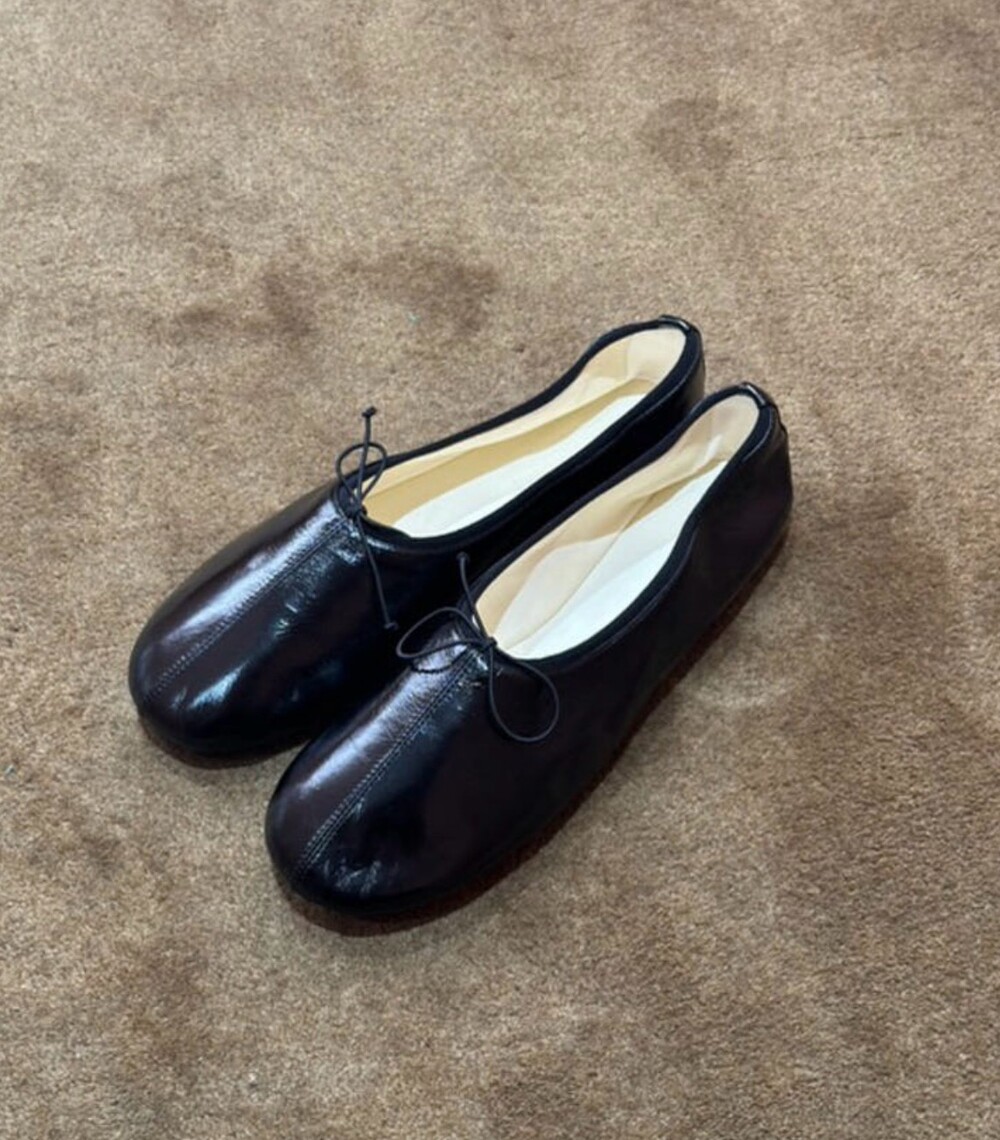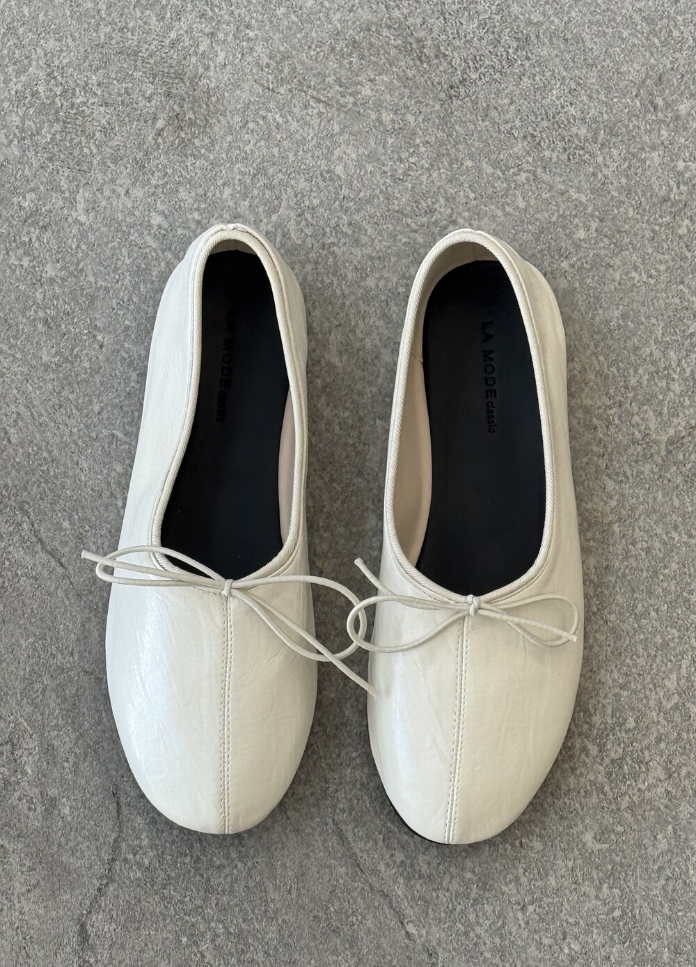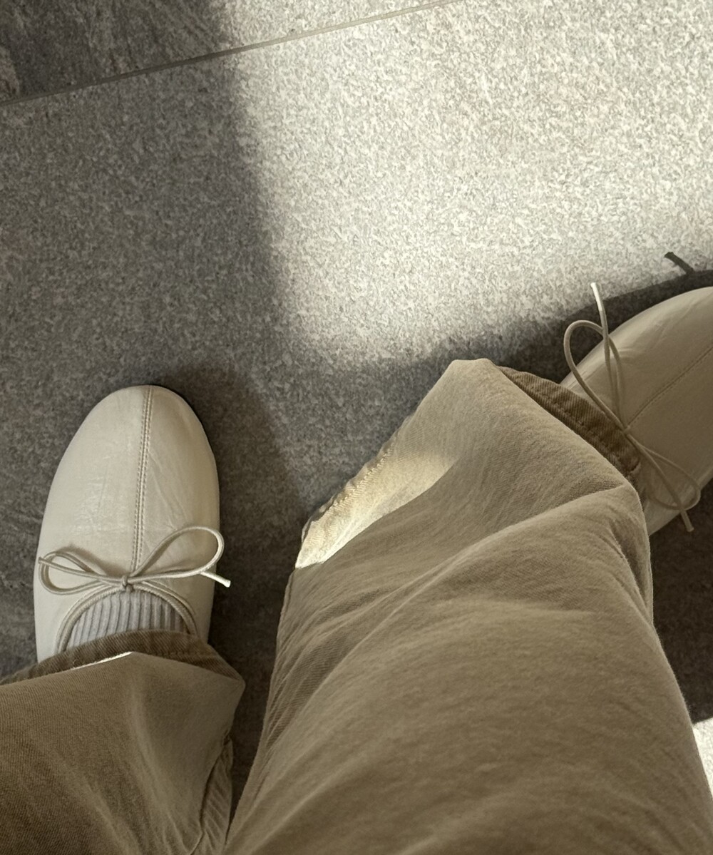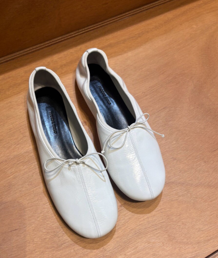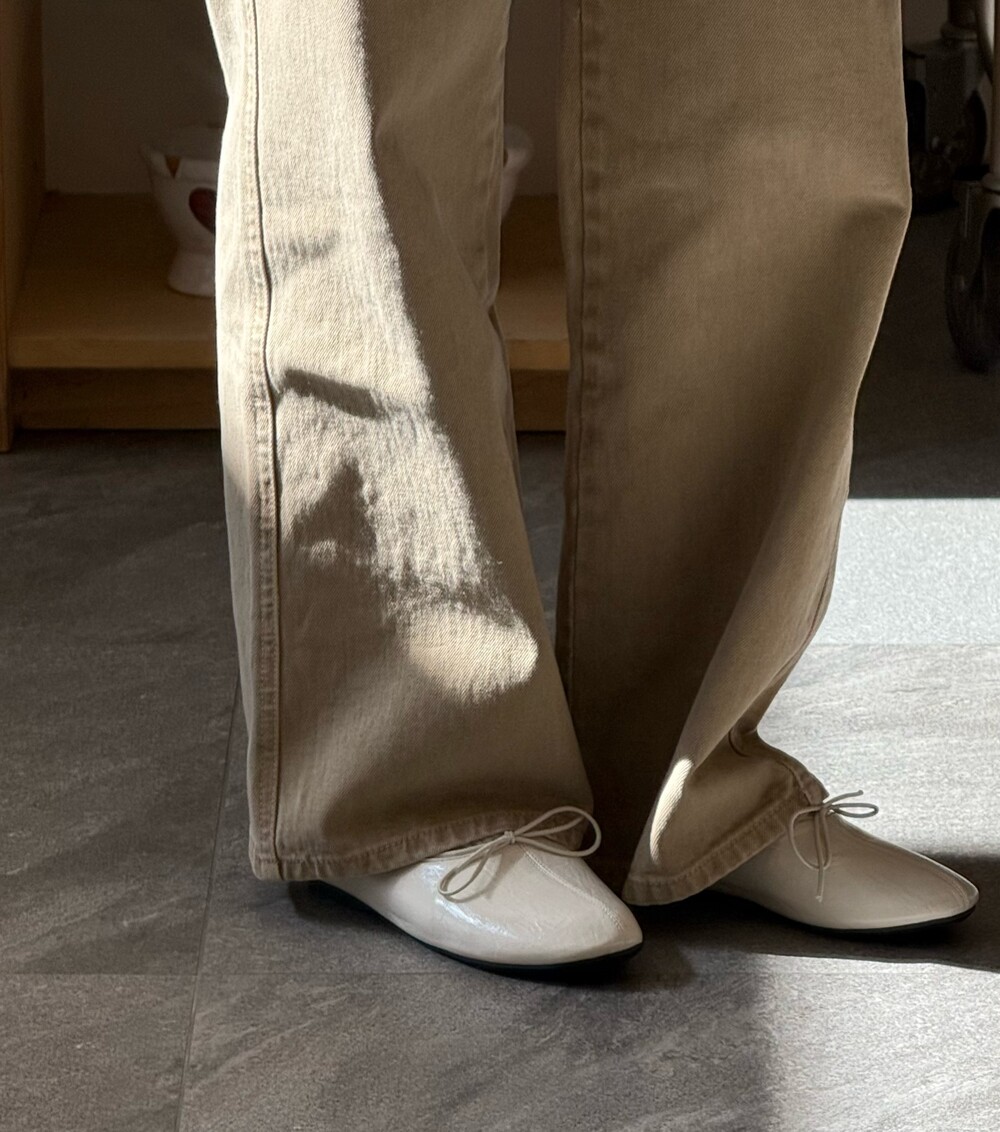 둥글게 떨어지는 토 쉐입에 얇은 리본 디테일을 더해 단정하면서도 여성스러운 인상을 주고, 은은한 광이 감도는 크림 컬러가 발등을 부드럽게 정리해줍니다.