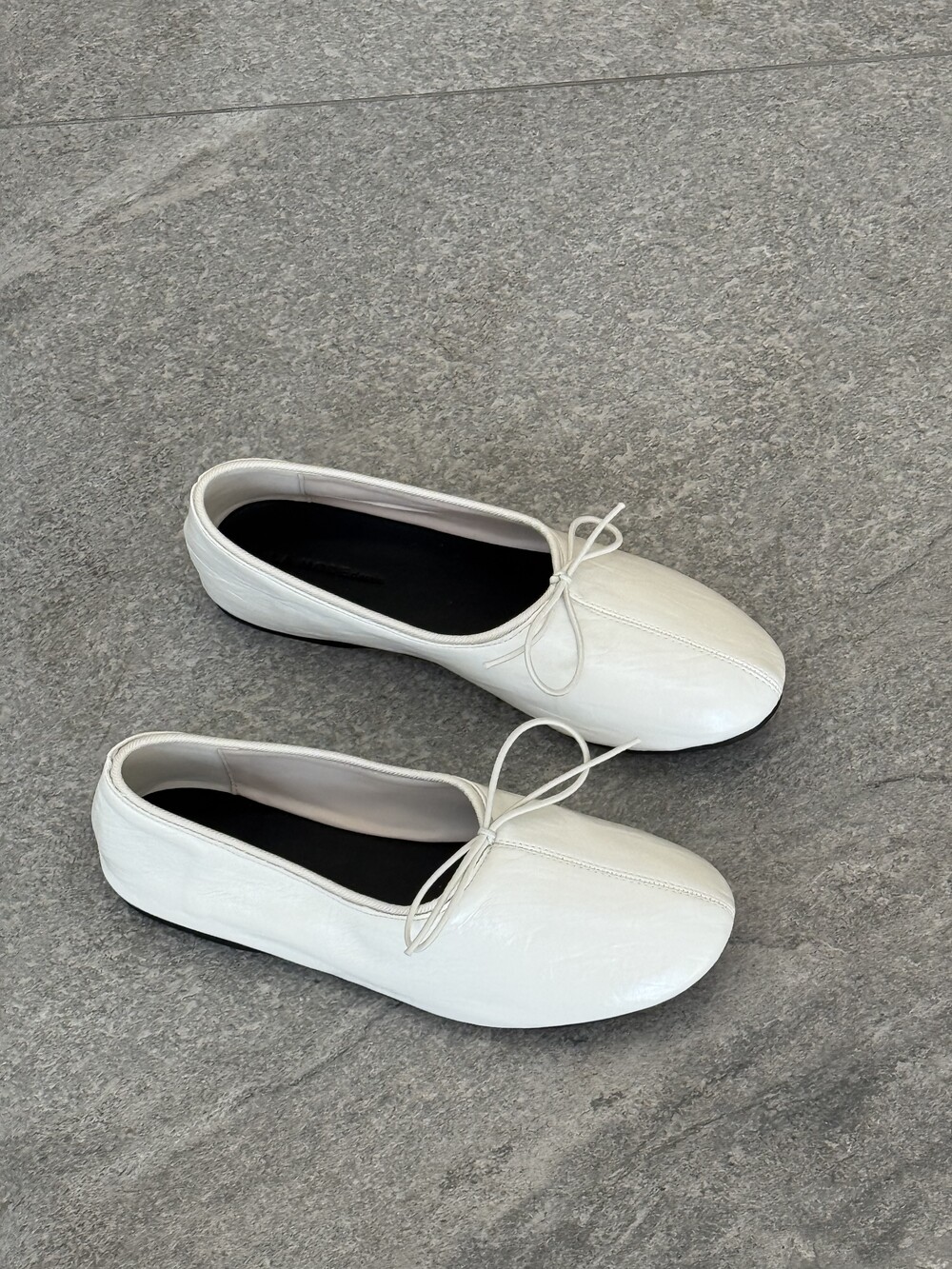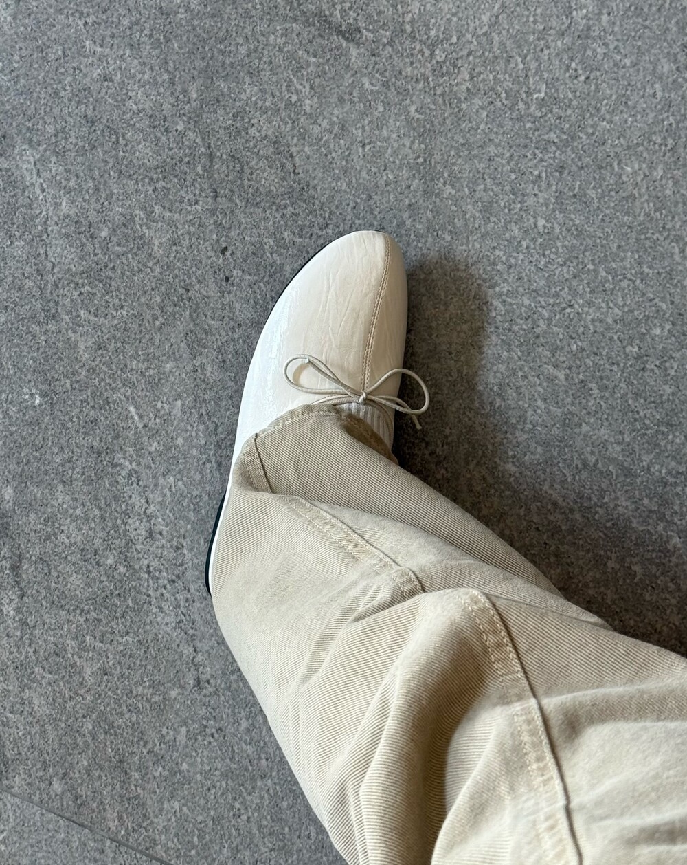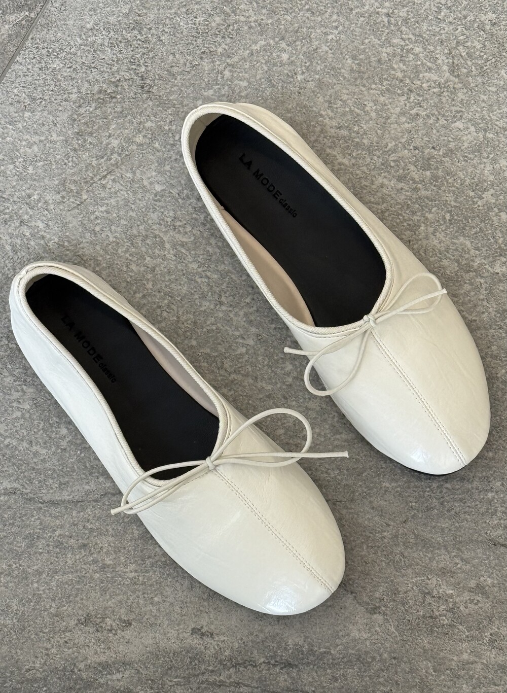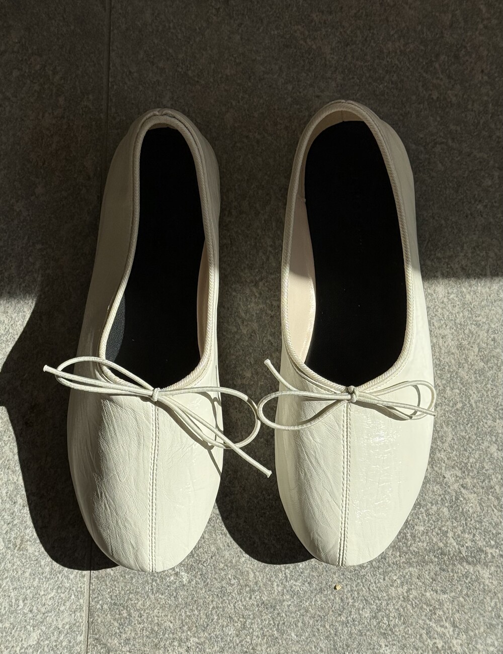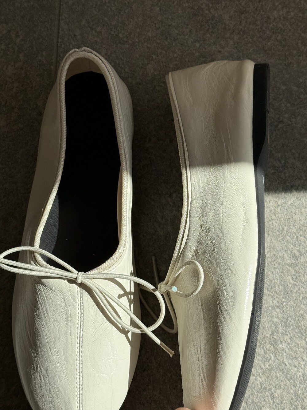 둥글게 떨어지는 토 쉐입에 얇은 리본 디테일을 더해 단정하면서도 여성스러운 인상을 주고, 은은한 광이 감도는 크림 컬러가 발등을 부드럽게 정리해줍니다.