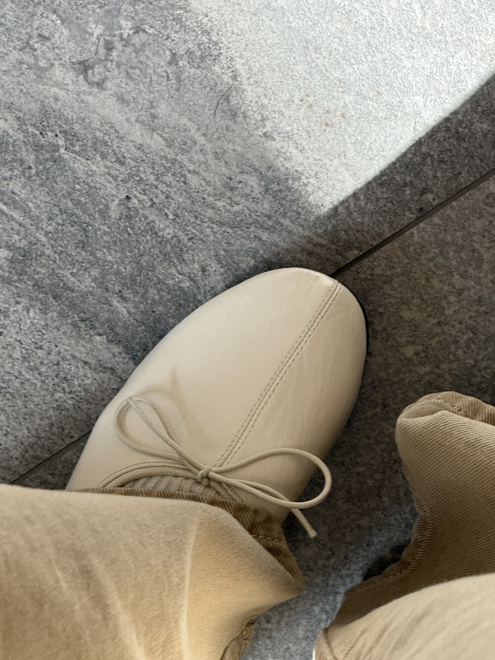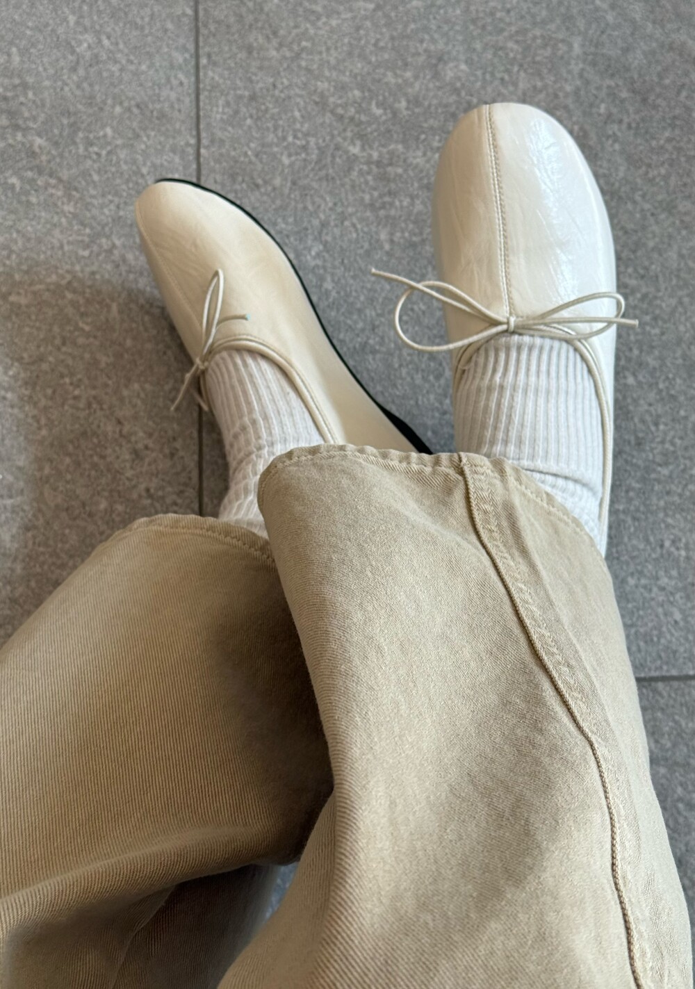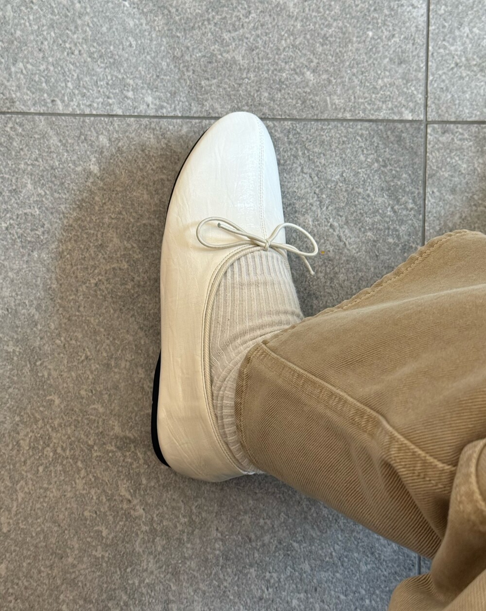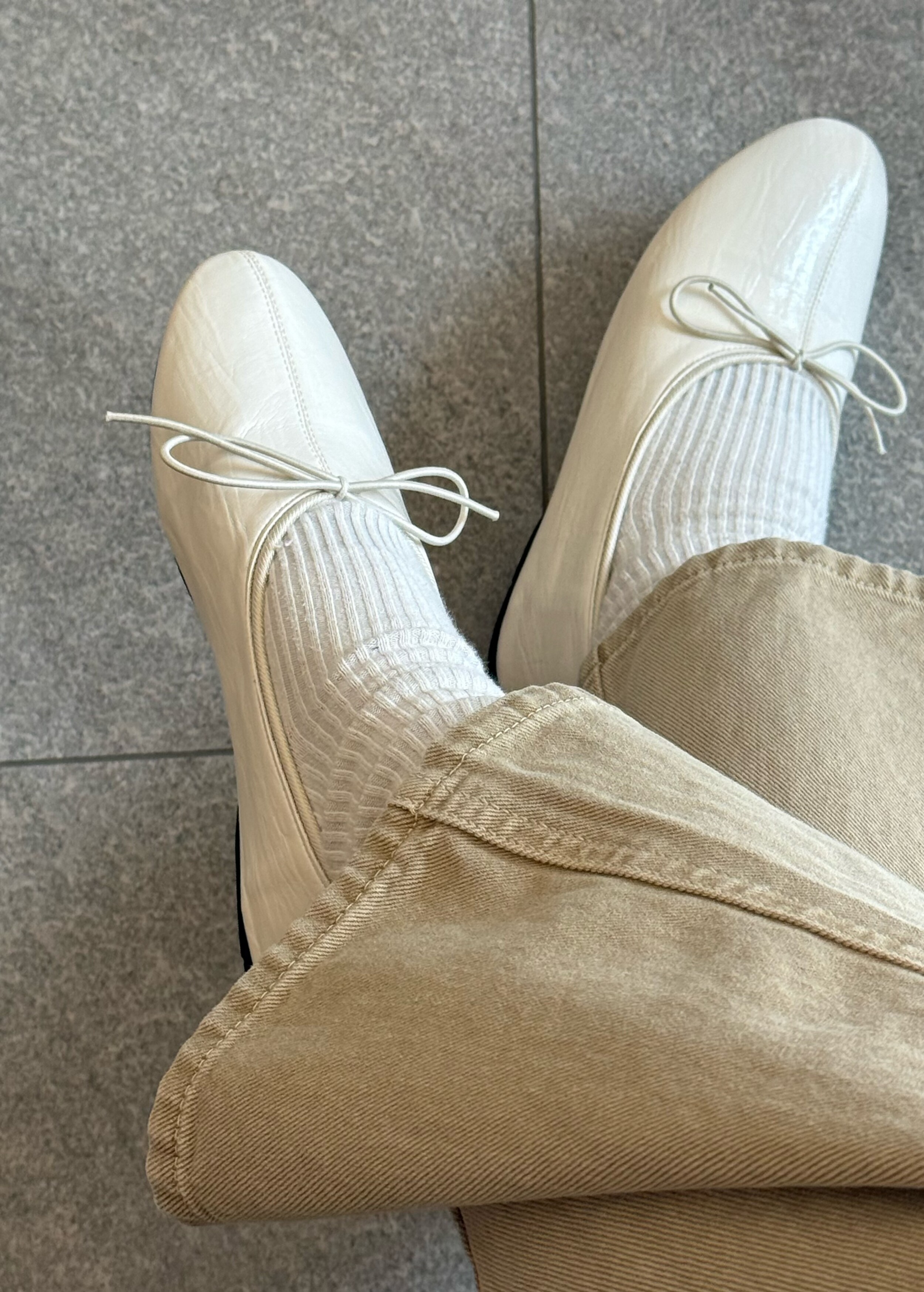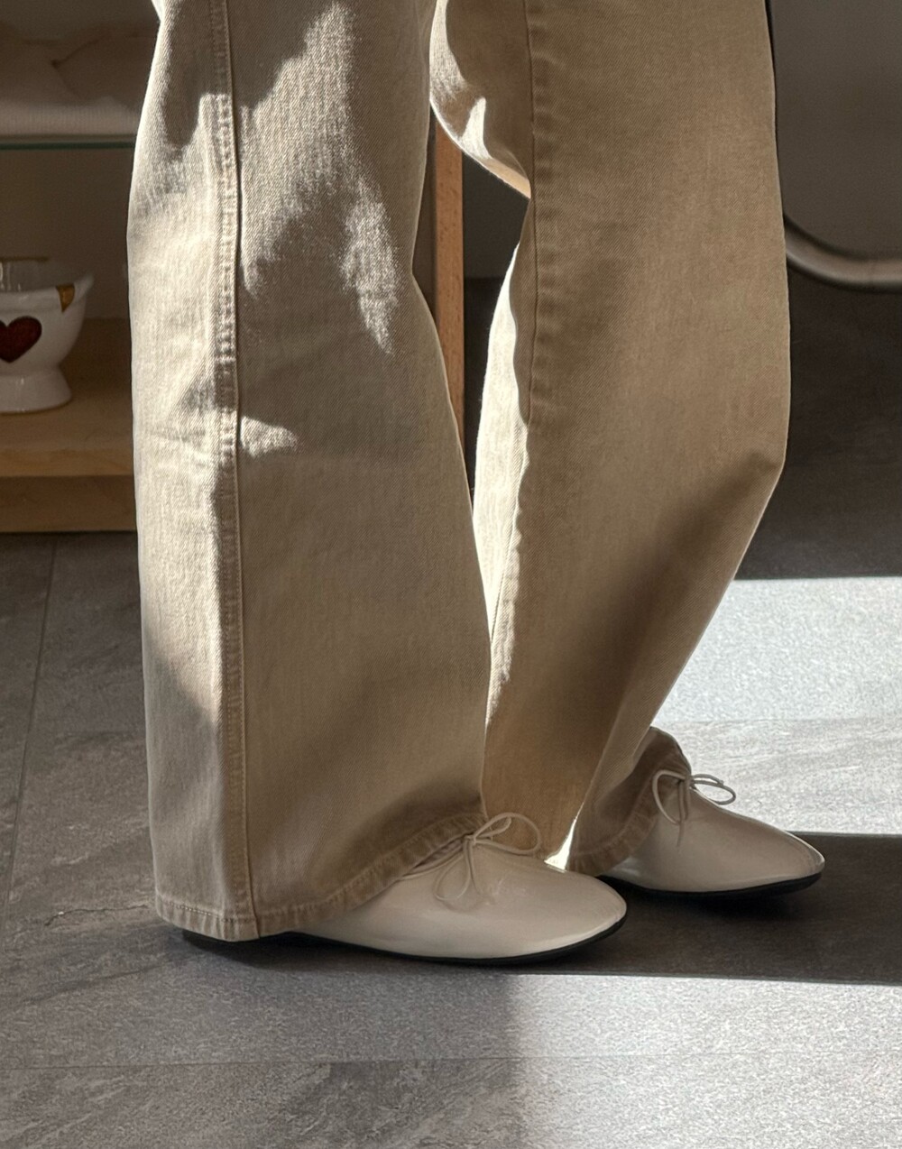 둥글게 떨어지는 토 쉐입에 얇은 리본 디테일을 더해 단정하면서도 여성스러운 인상을 주고, 은은한 광이 감도는 크림 컬러가 발등을 부드럽게 정리해줍니다.