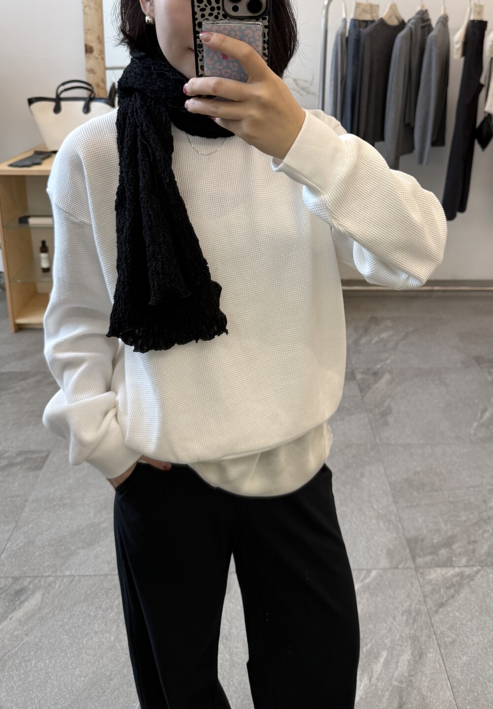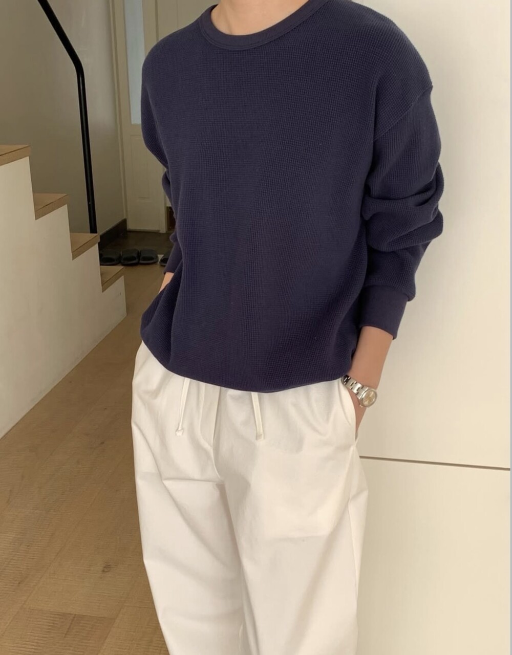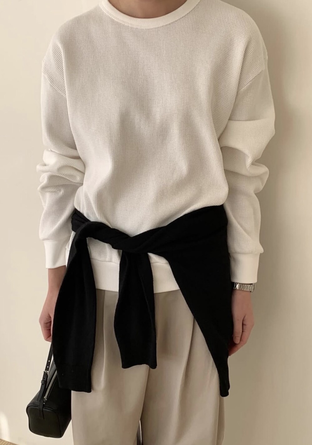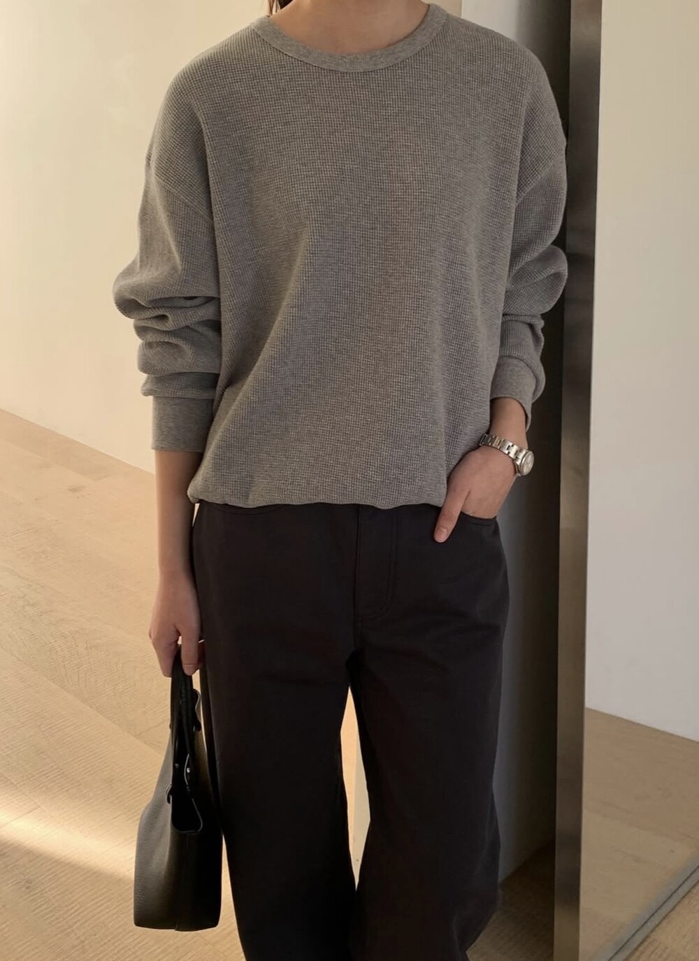잔잔한 텍스처 덕분에 단독으로 입어도 밋밋하지 않고, 아우터 안에 이너로 매치해도 자연스럽게 존재감이 느껴져요.