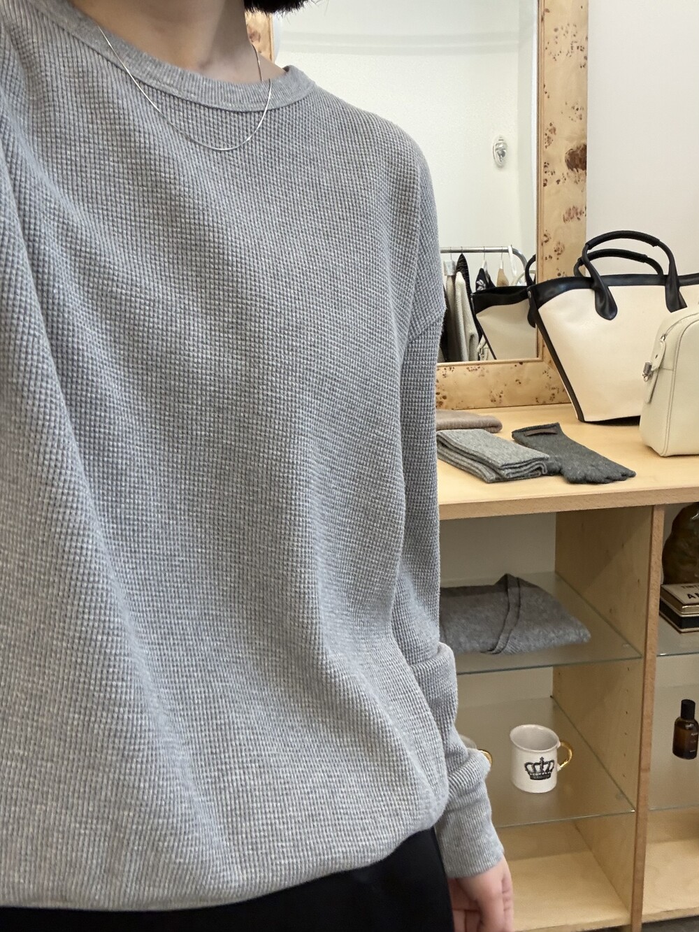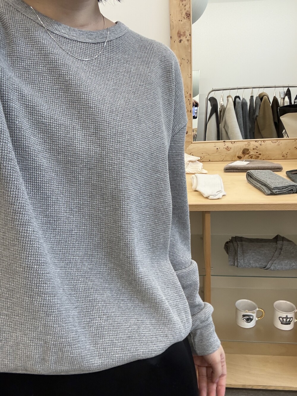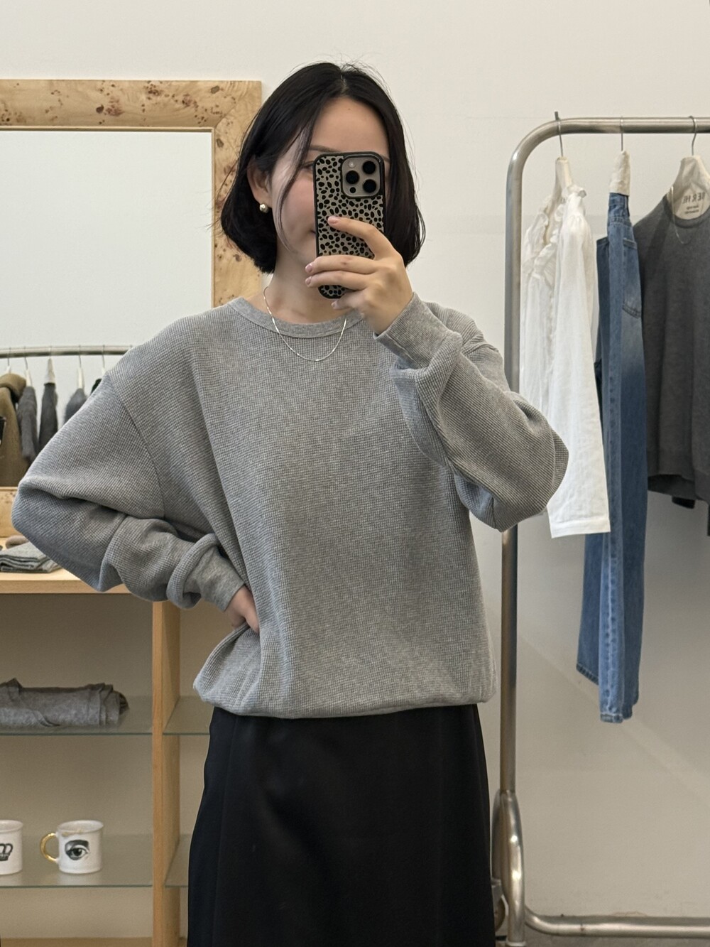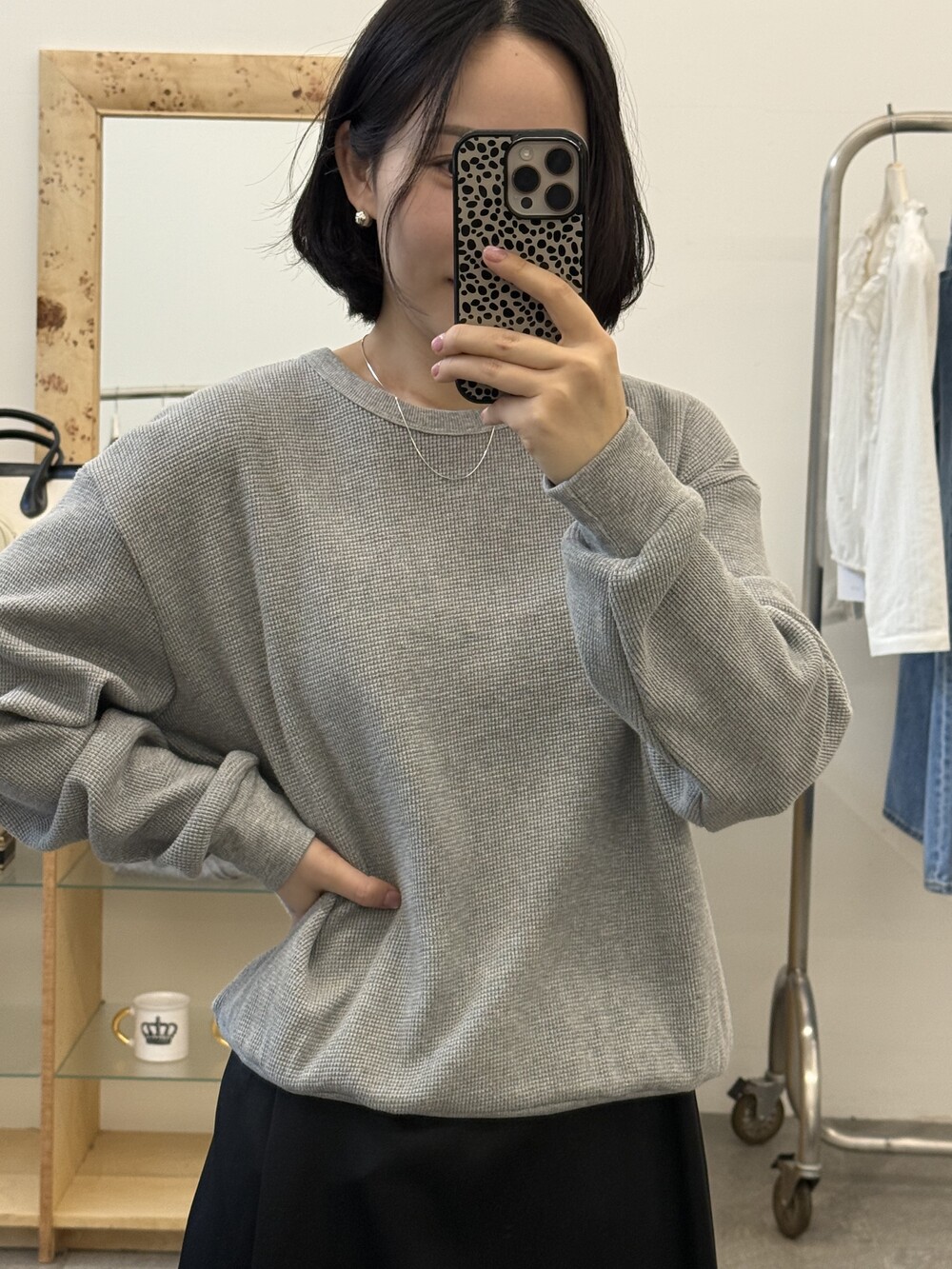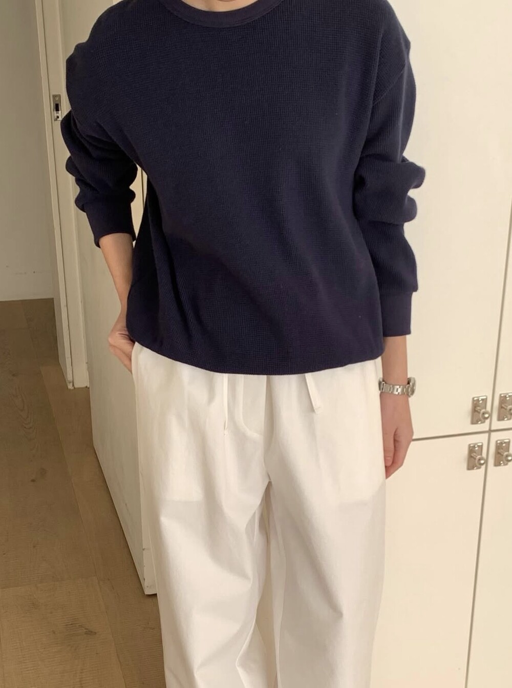 잔잔한 텍스처 덕분에 단독으로 입어도 밋밋하지 않고, 아우터 안에 이너로 매치해도 자연스럽게 존재감이 느껴져요.