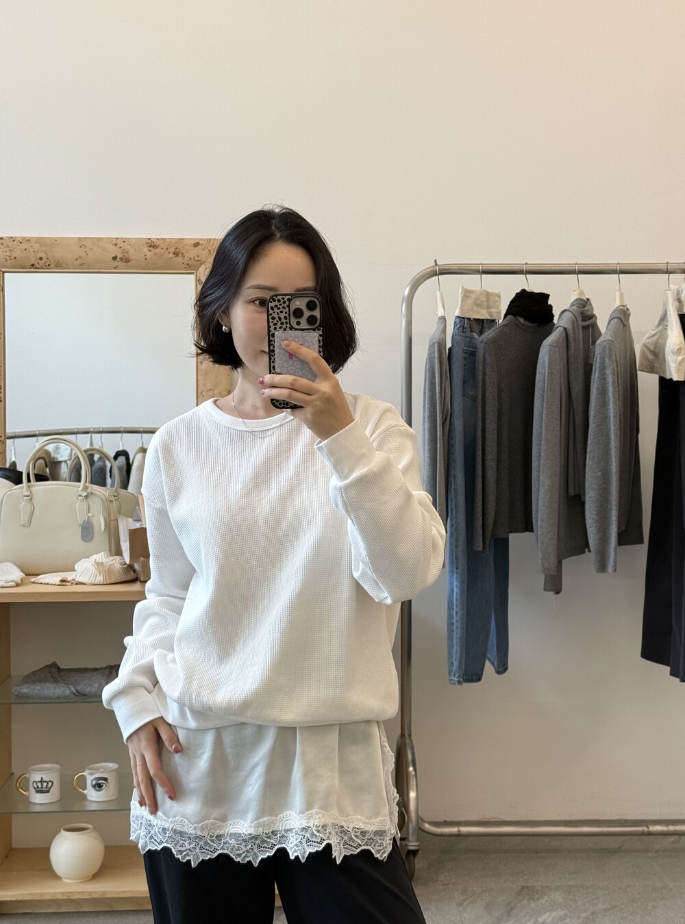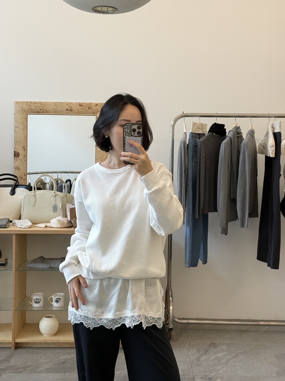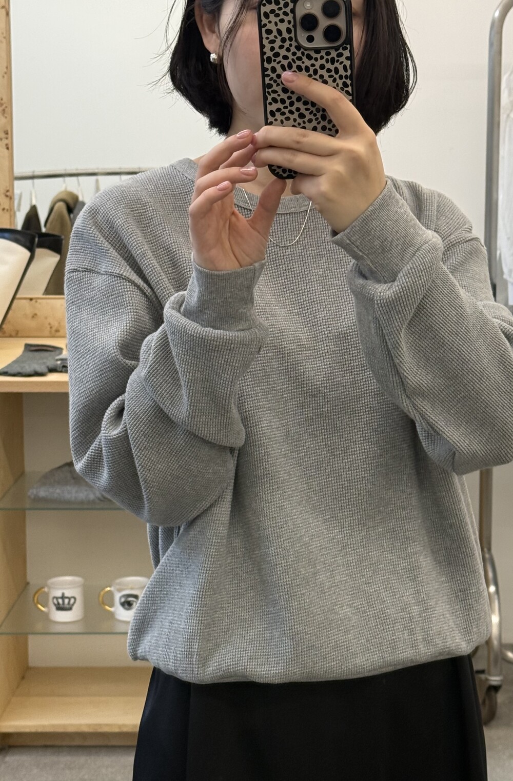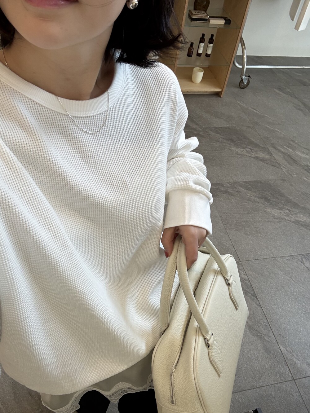 잔잔한 텍스처 덕분에 단독으로 입어도 밋밋하지 않고, 아우터 안에 이너로 매치해도 자연스럽게 존재감이 느껴져요.
