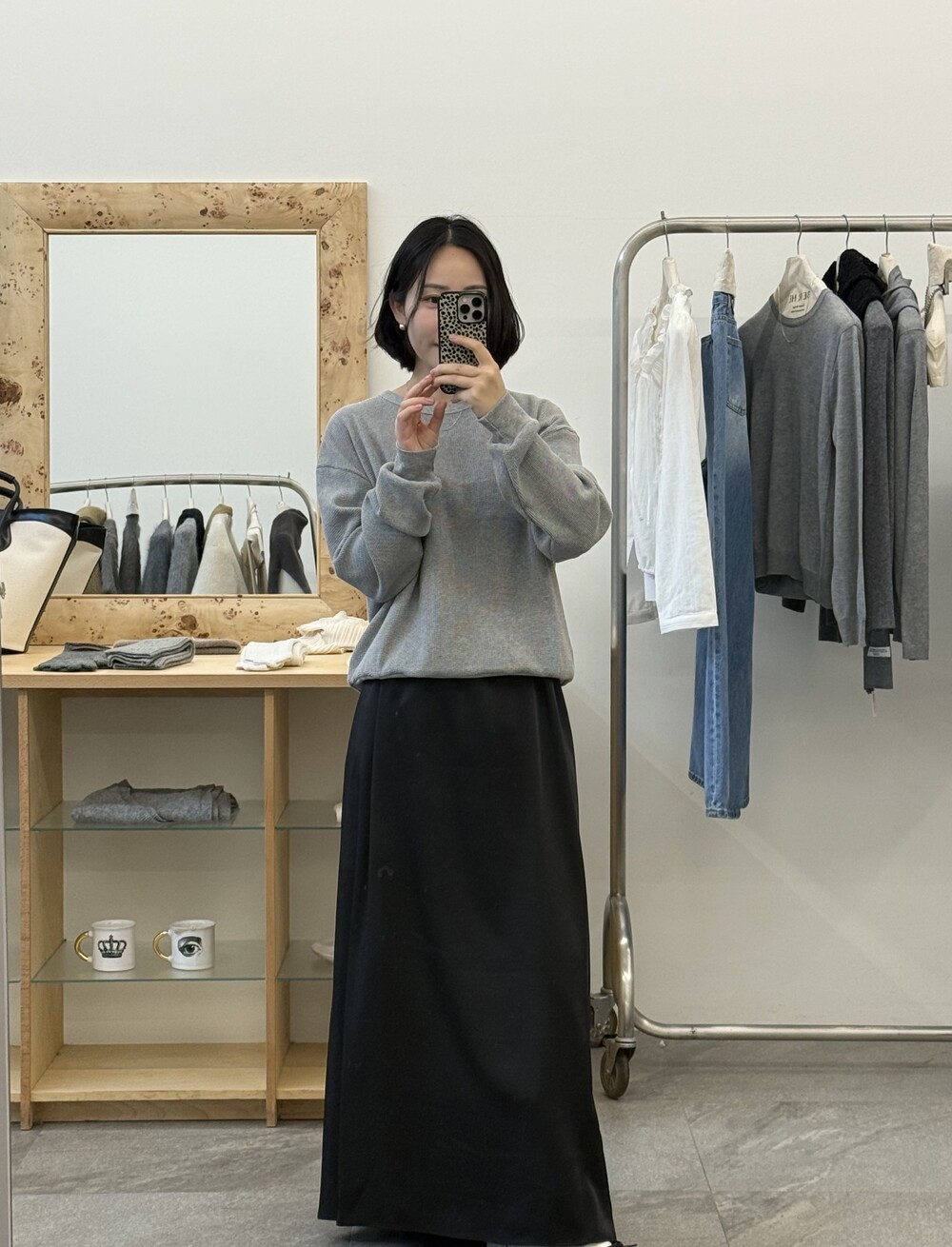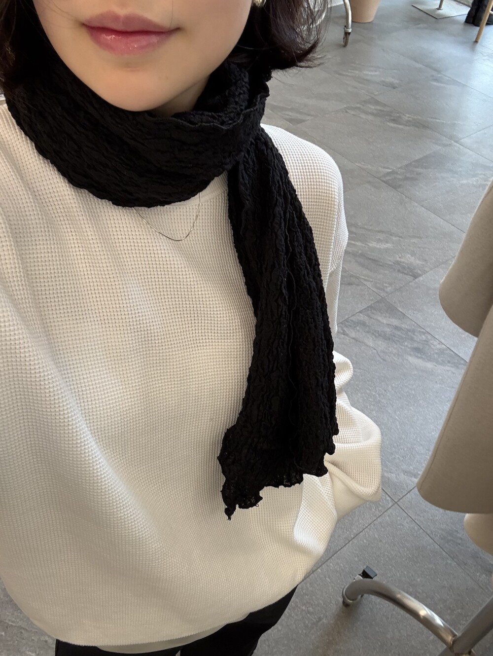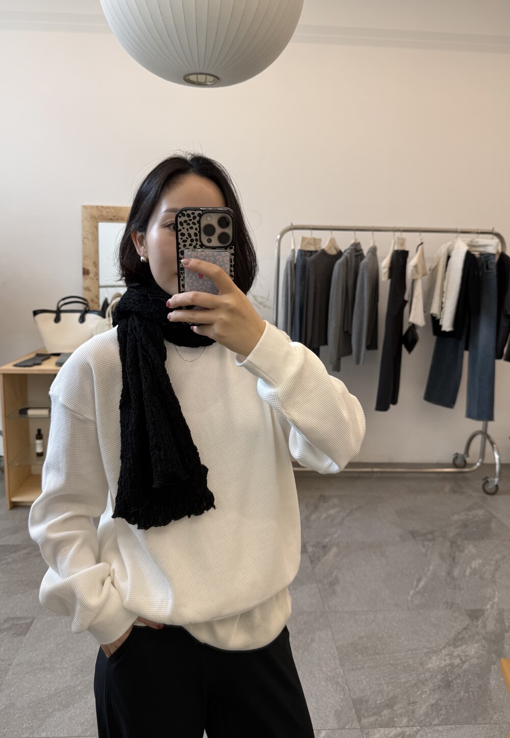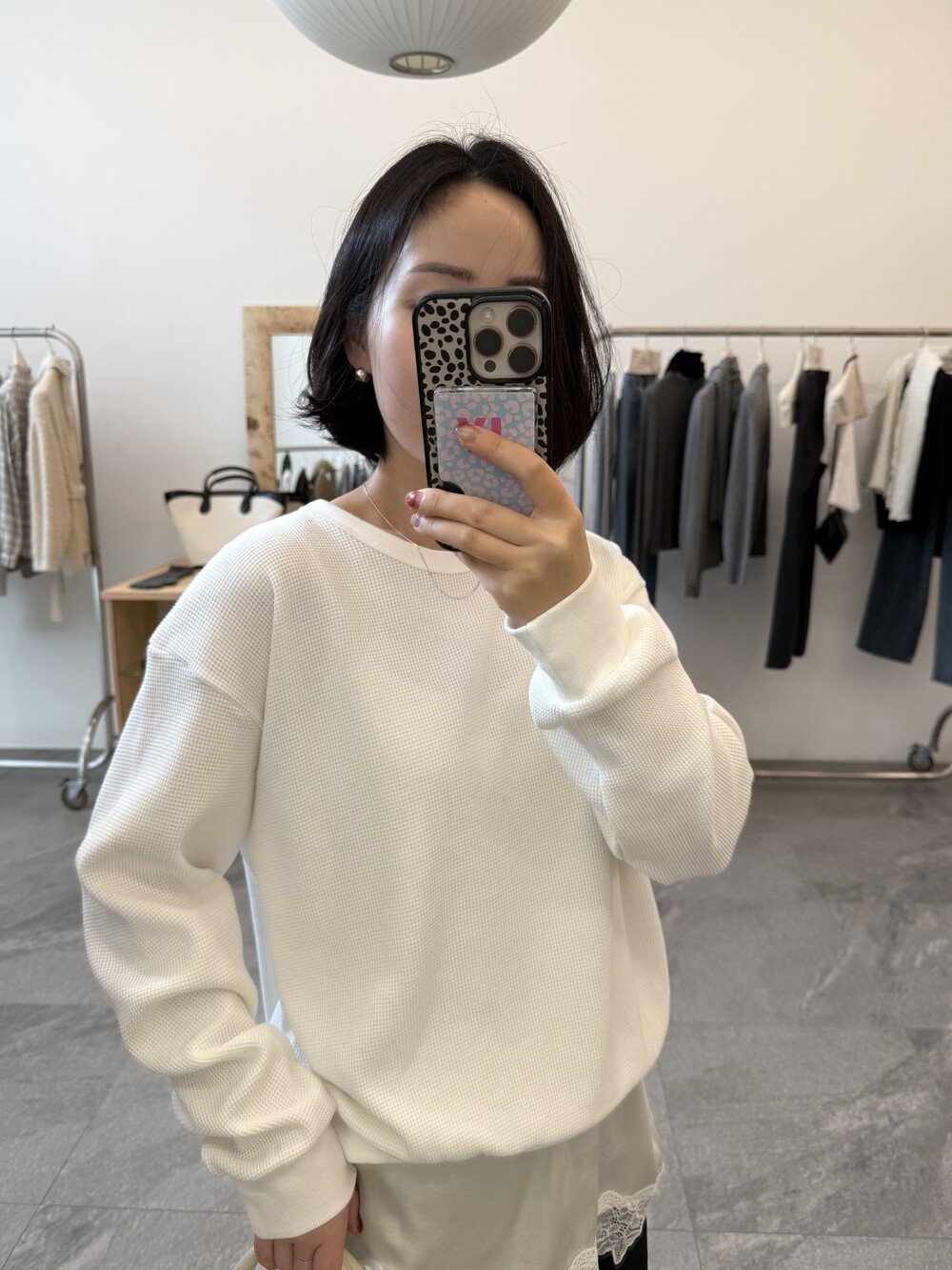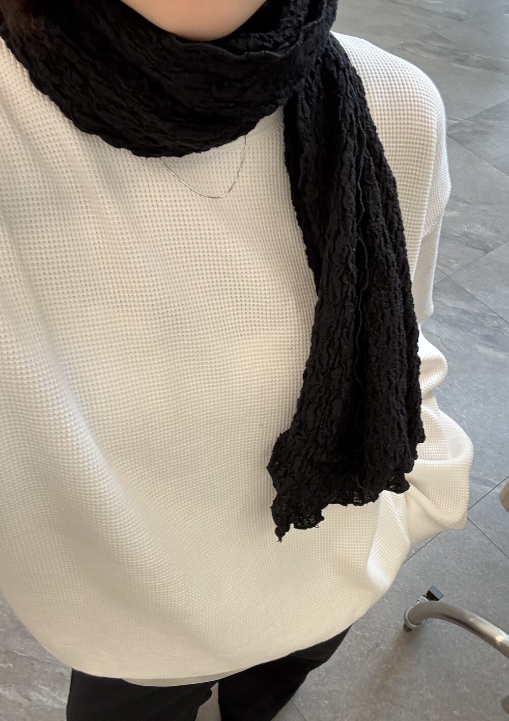 잔잔한 텍스처 덕분에 단독으로 입어도 밋밋하지 않고, 아우터 안에 이너로 매치해도 자연스럽게 존재감이 느껴져요.