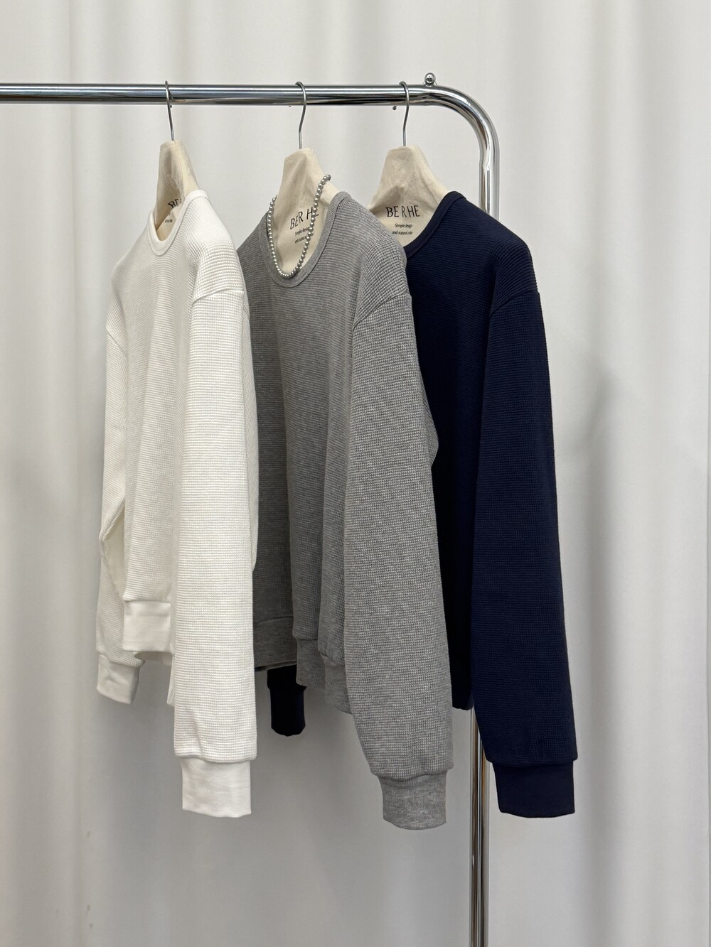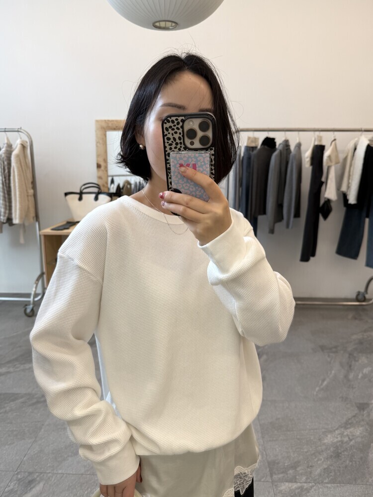 와플 조직 특유의 입체감이 은은하게 살아있는 맨투맨입니다.