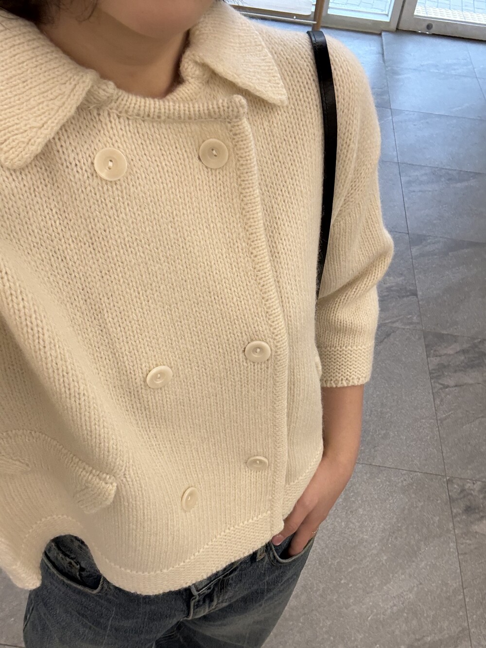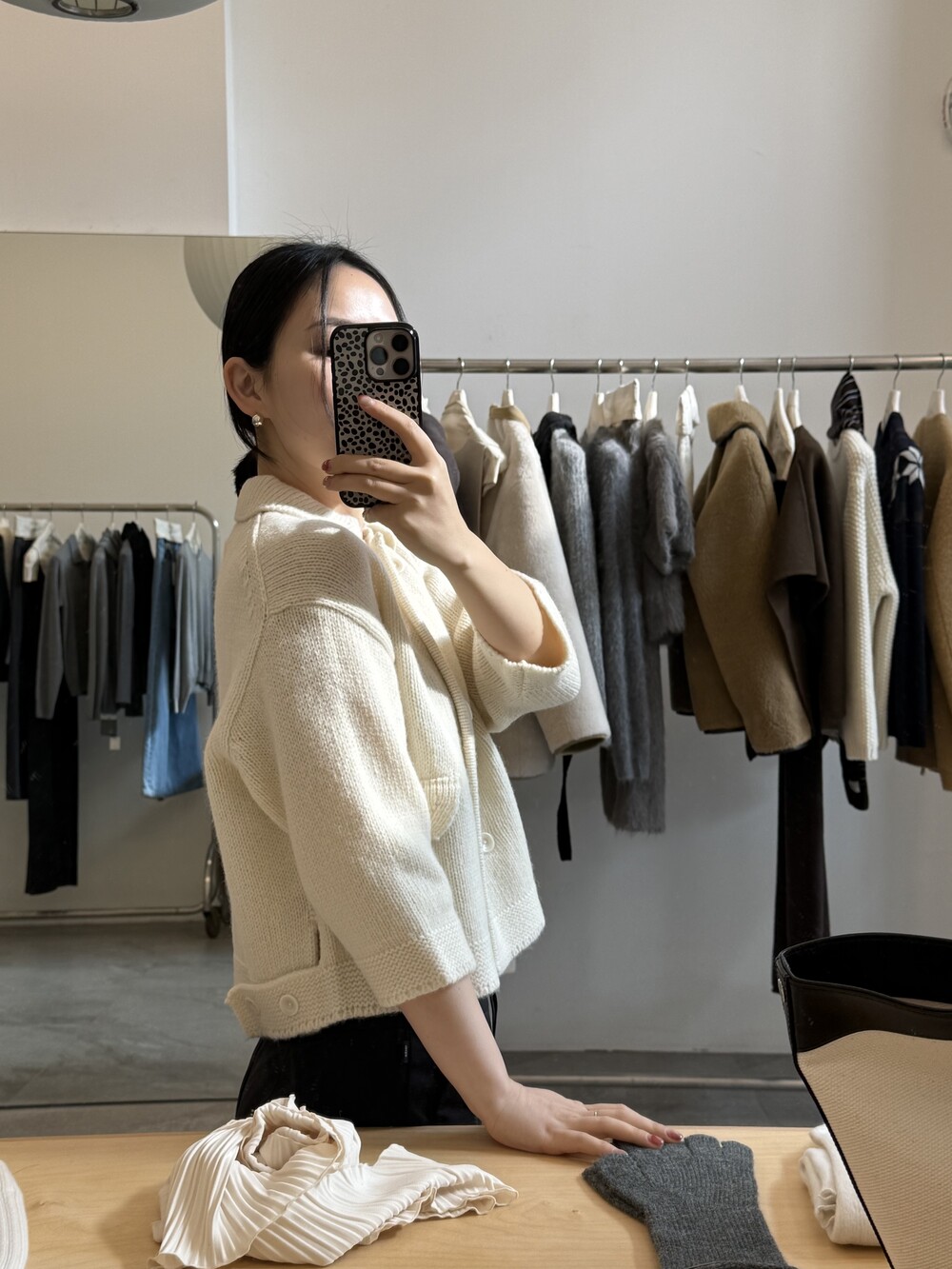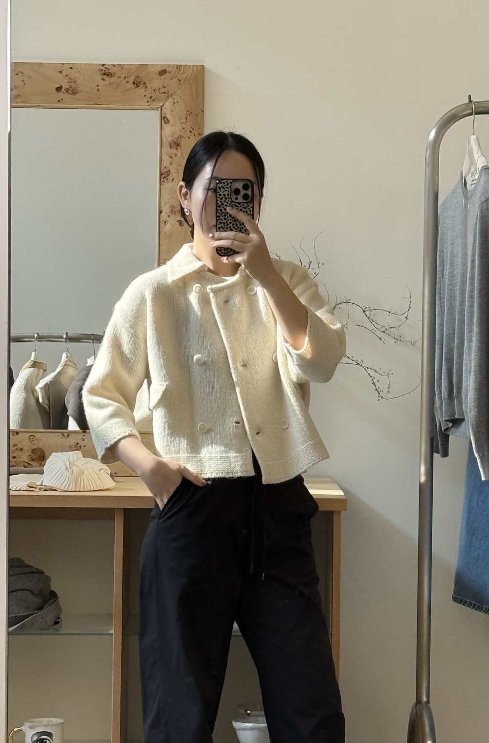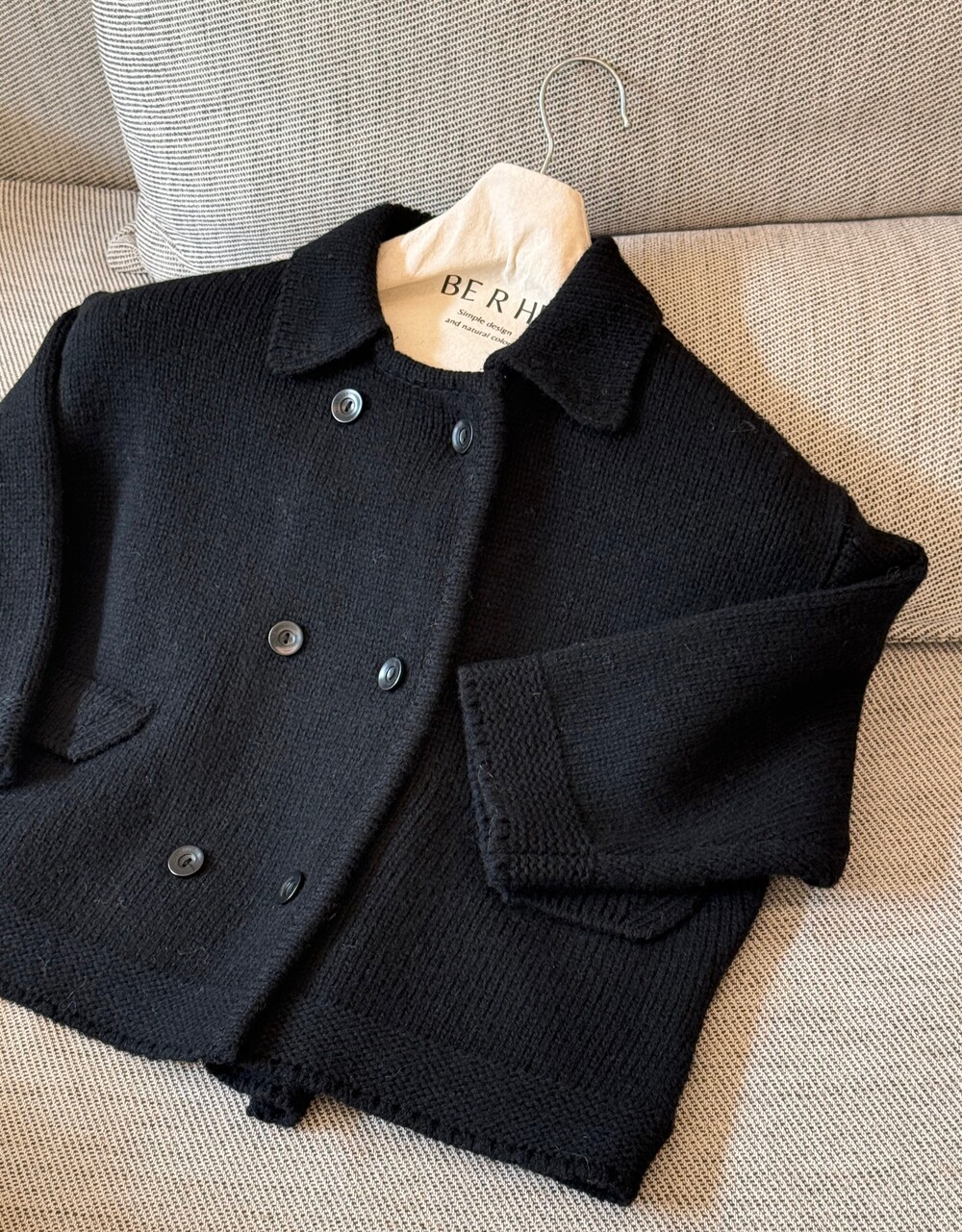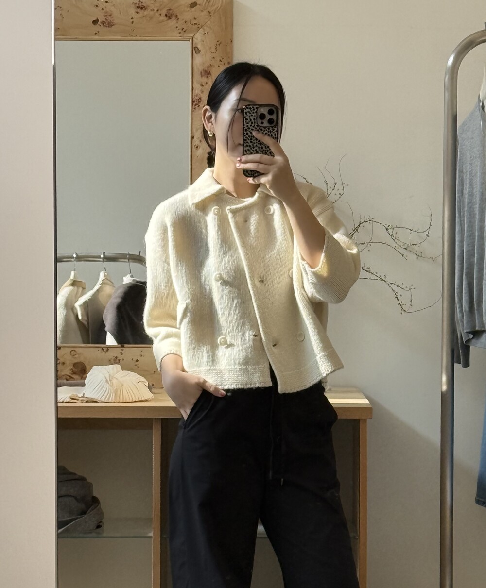 밑단은 탄탄하게 마감해 실루엣이 무너지지 않도록 잡아주었고, 주머니 포켓과 소매 끝단은 니트 조직을 정리해 단정하게 마무리했어요.