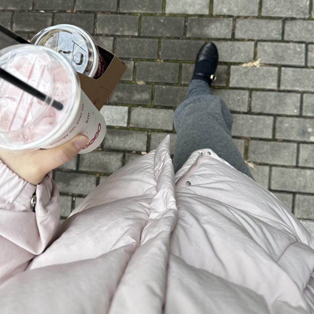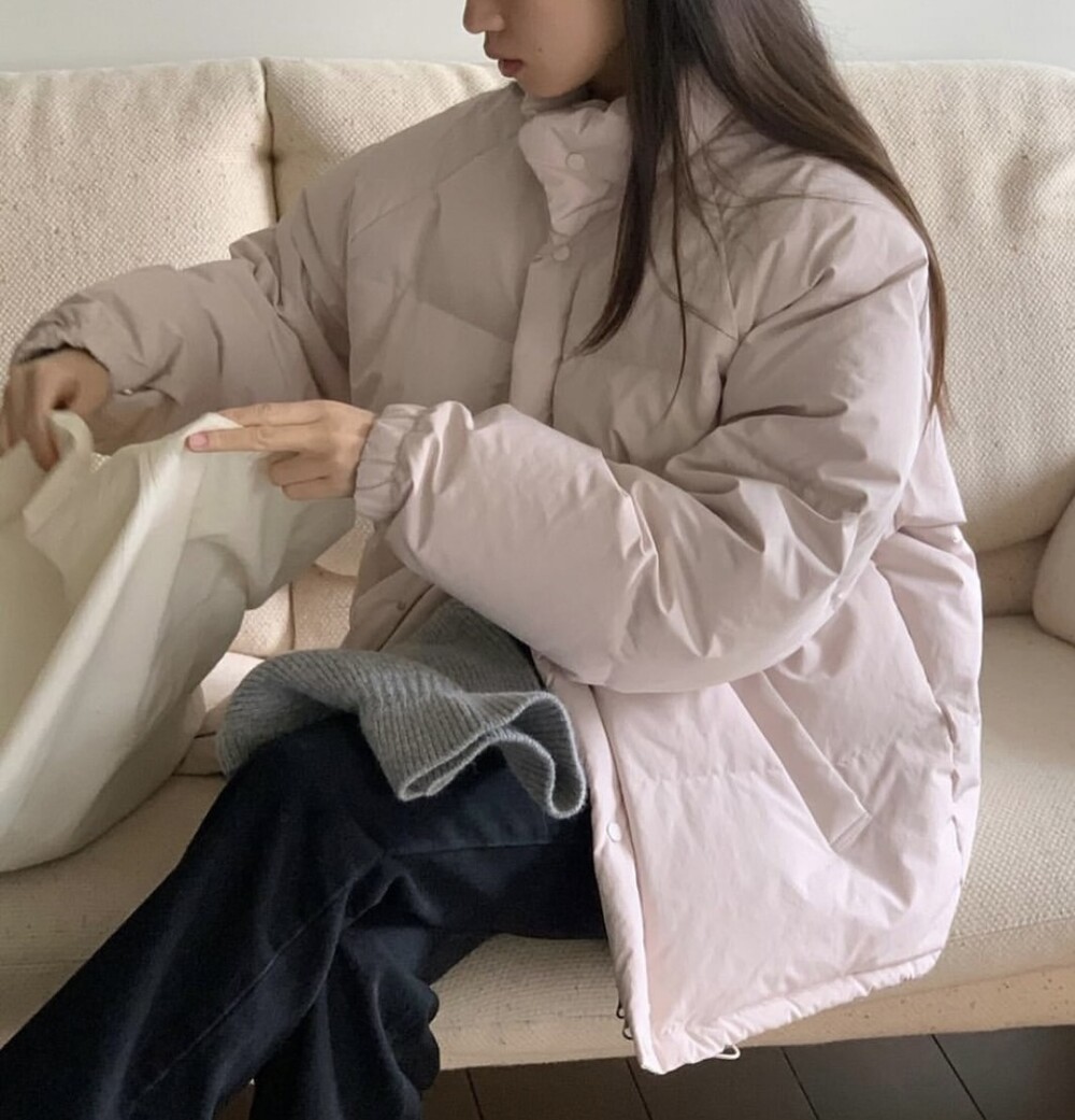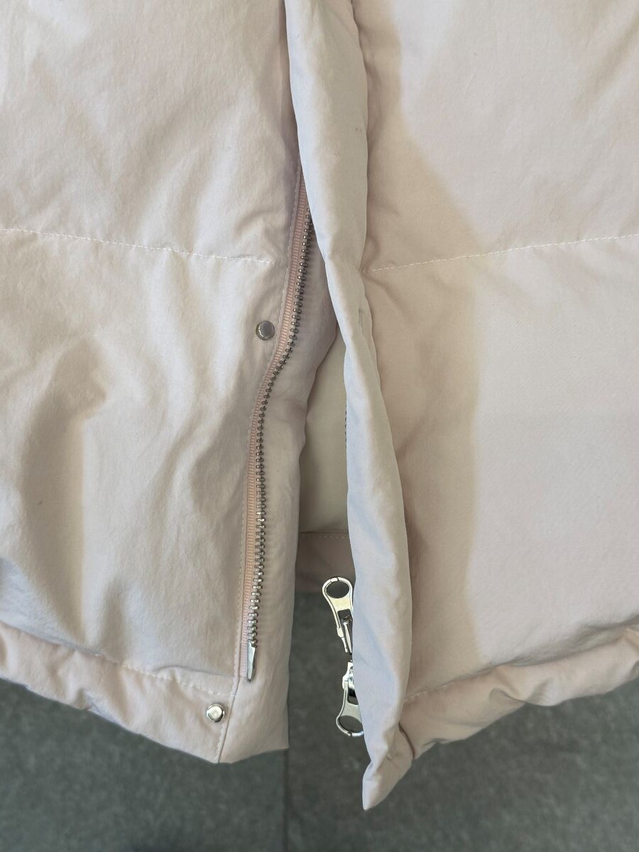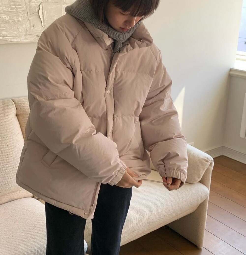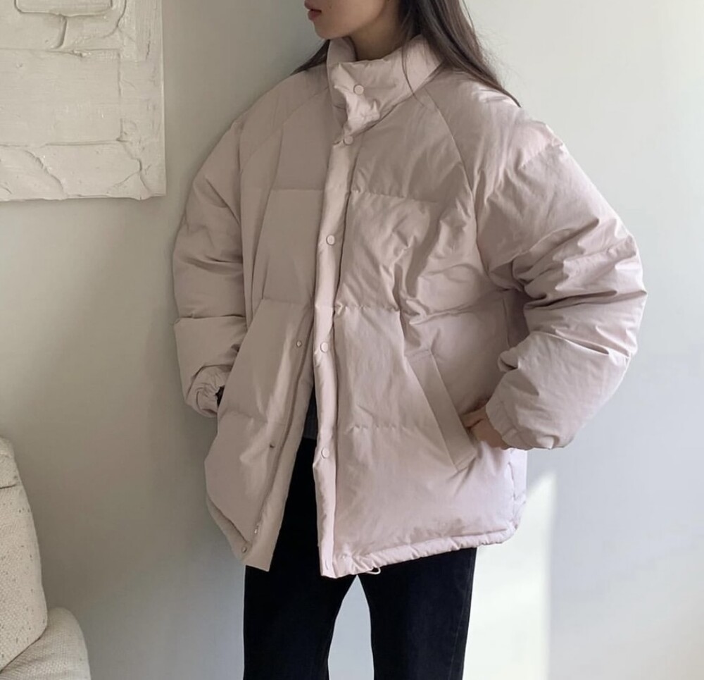 아이보리 컬러가 많이 믹스 된 딸기 우유 빛 패딩입니다.