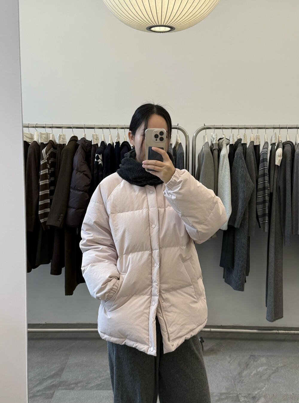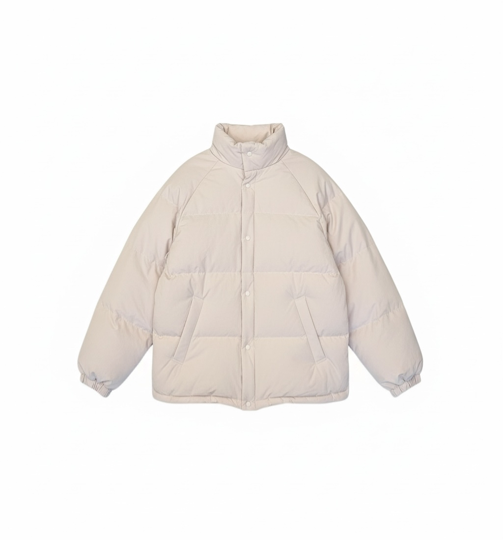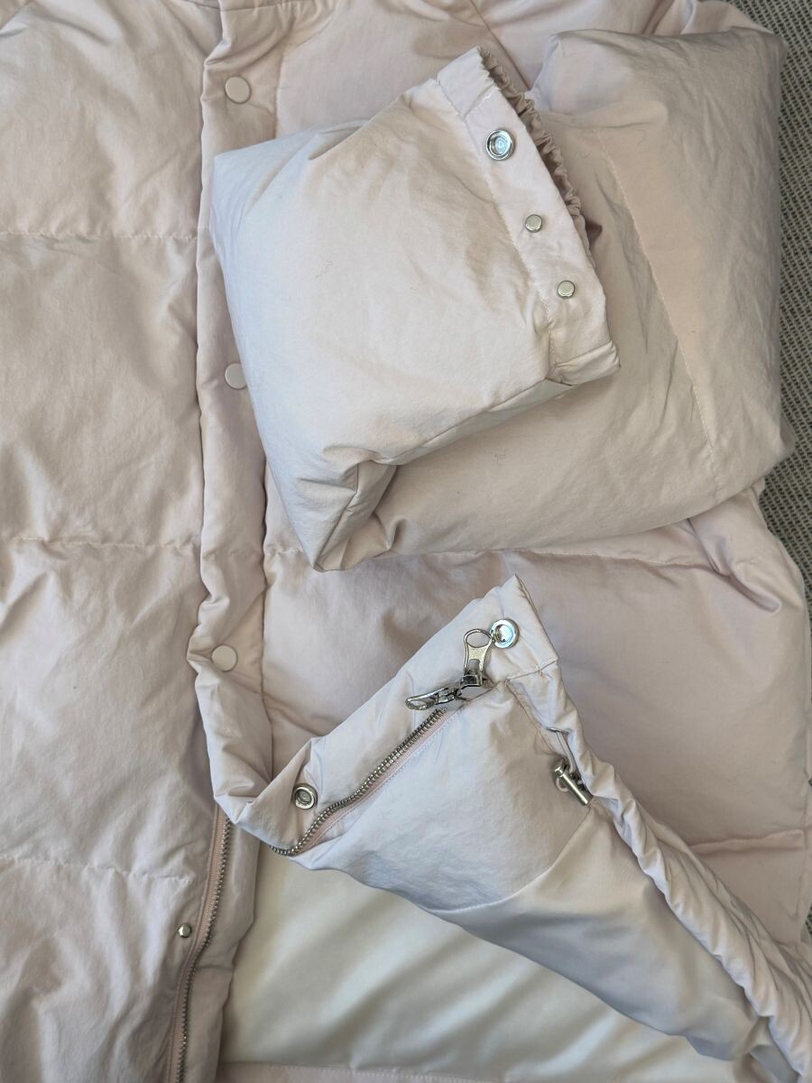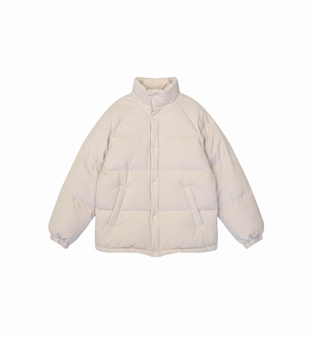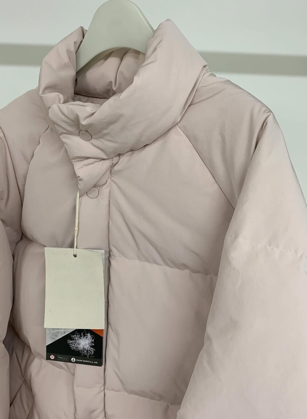 아이보리 컬러가 많이 믹스 된 딸기 우유 빛 패딩입니다.