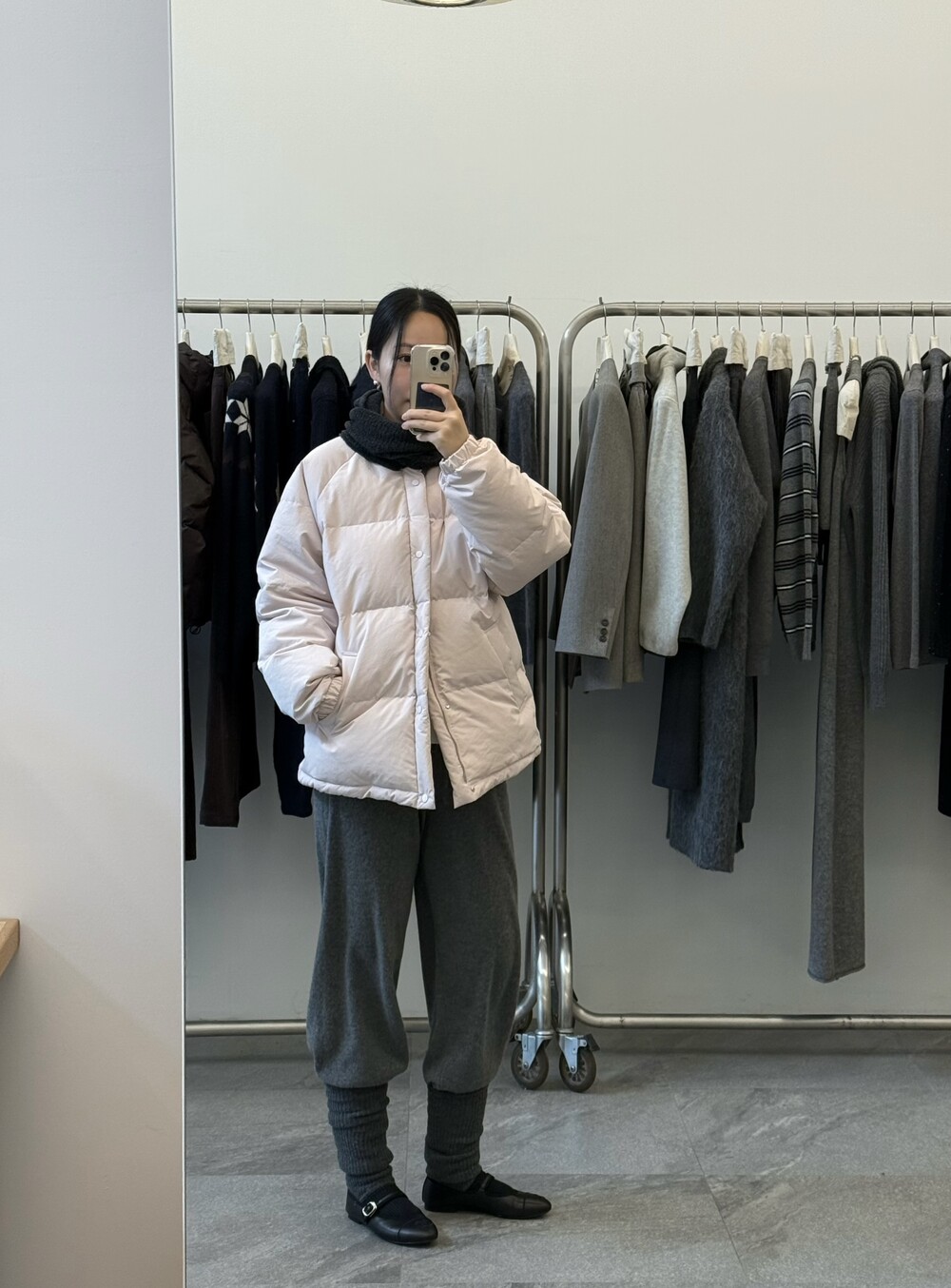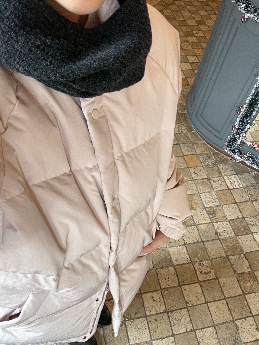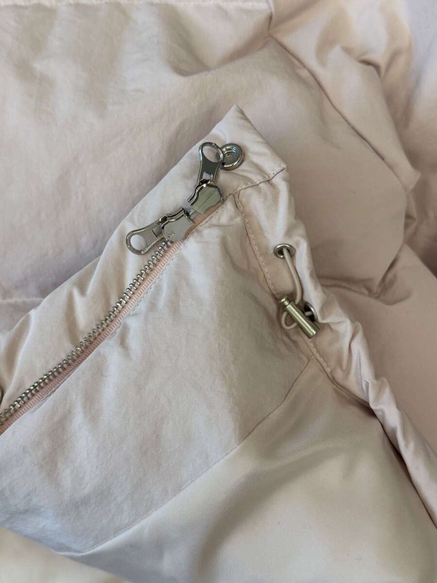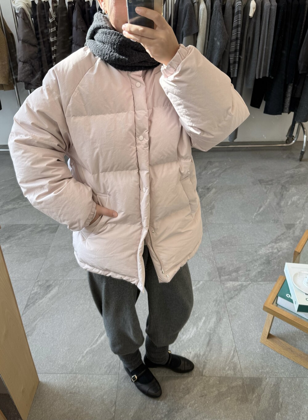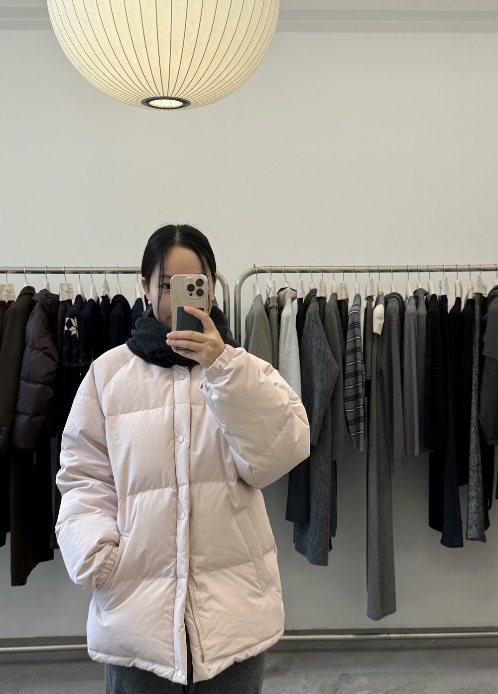아이보리 컬러가 많이 믹스 된 딸기 우유 빛 패딩입니다.