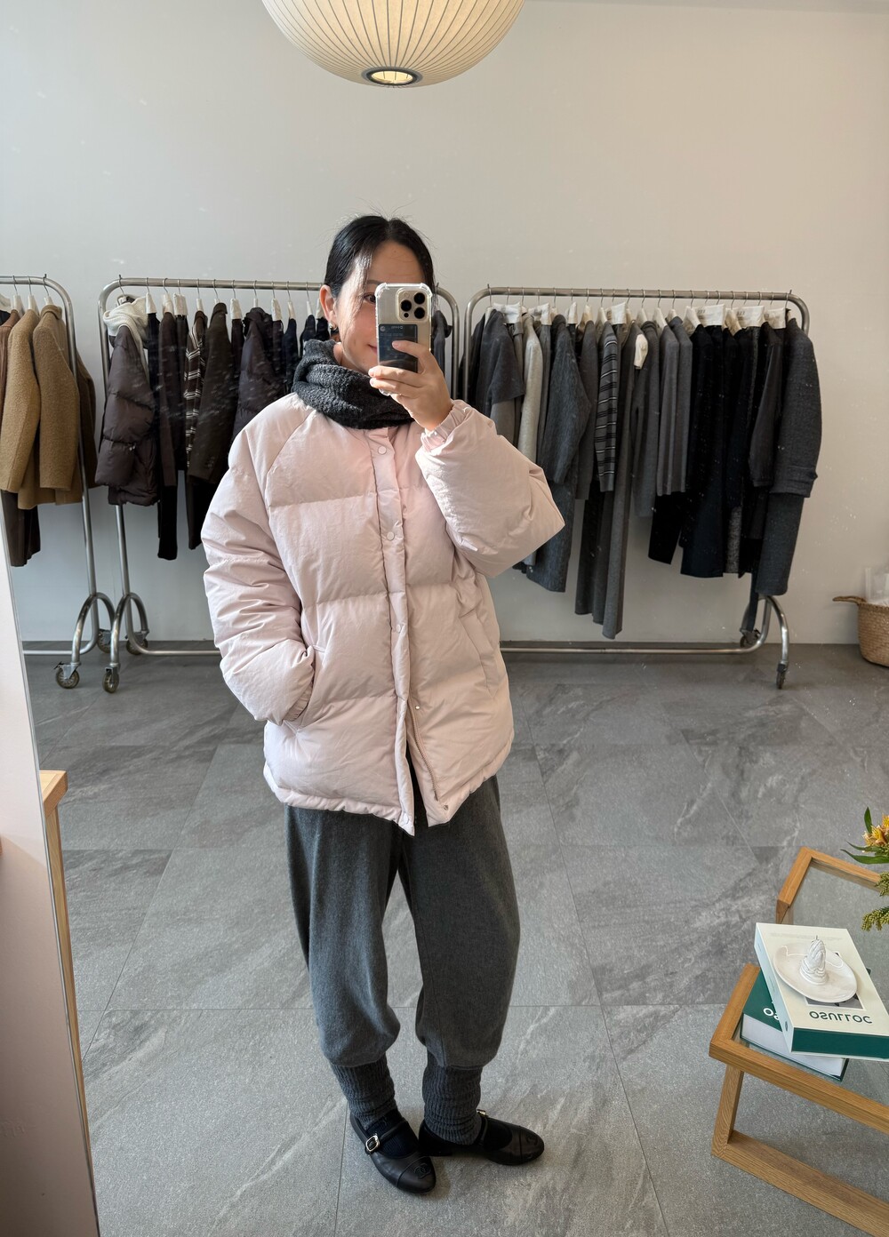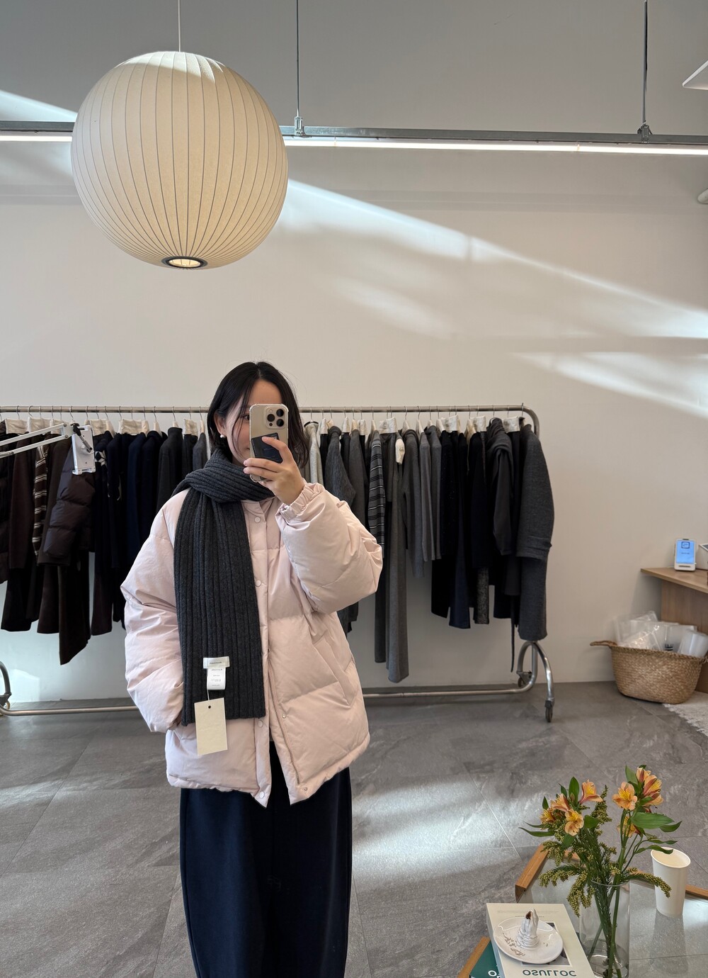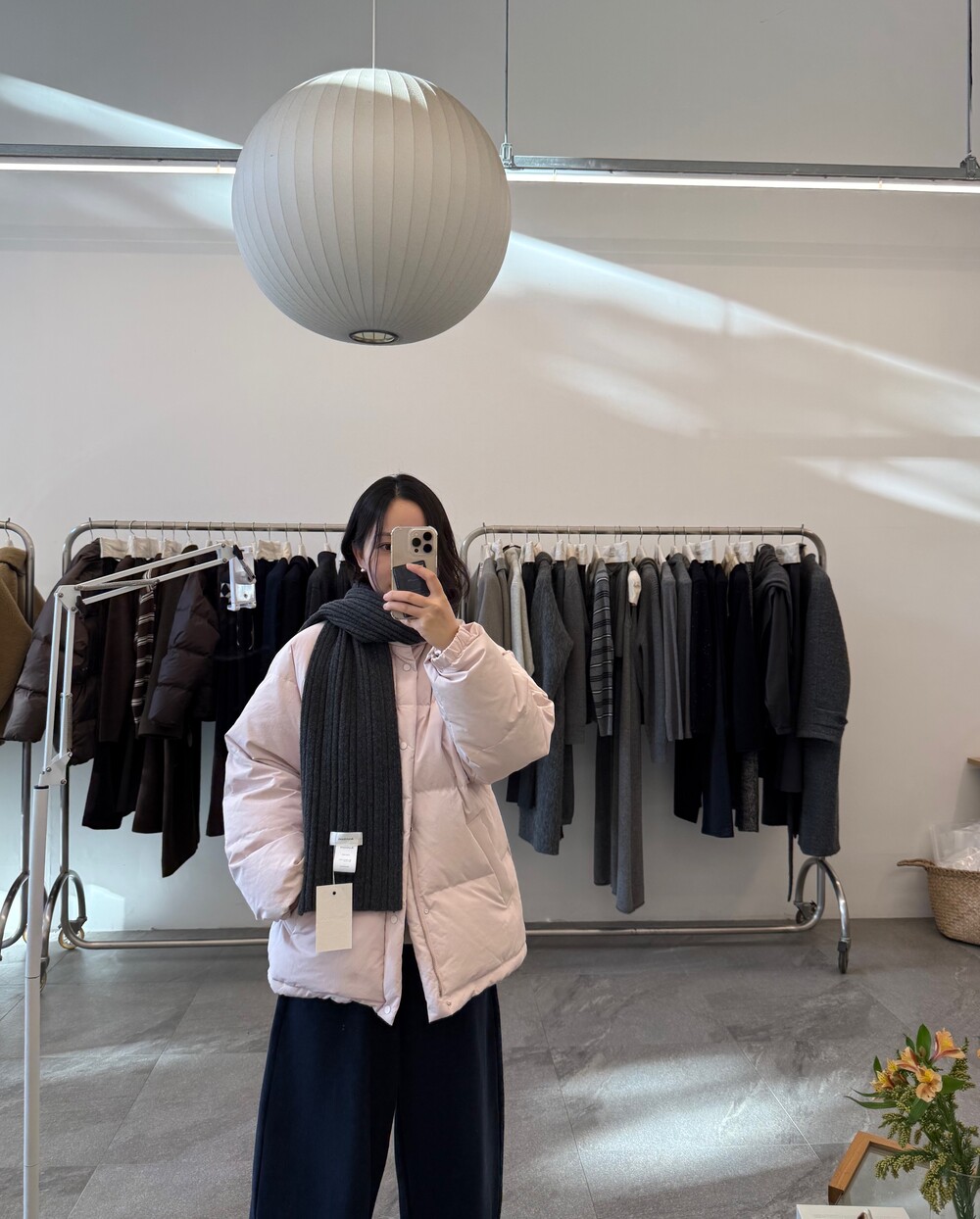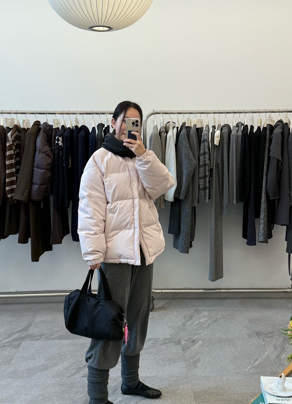 아이보리 컬러가 많이 믹스 된 딸기 우유 빛 패딩입니다.