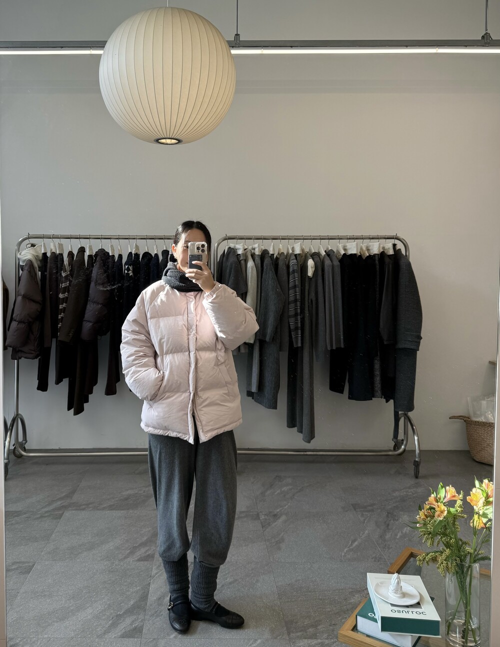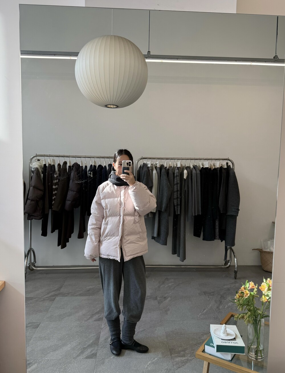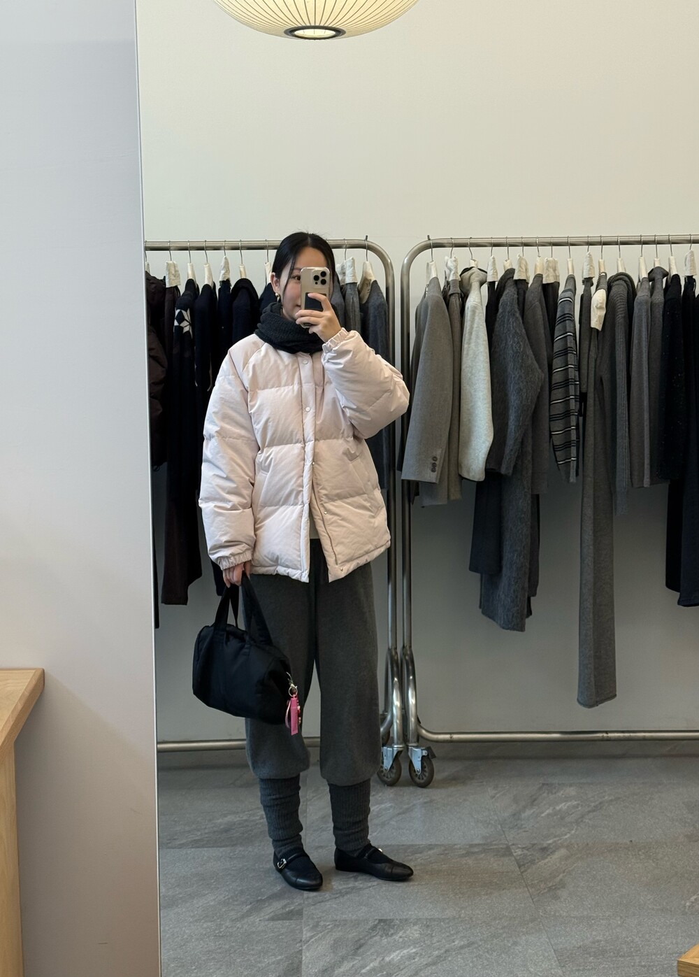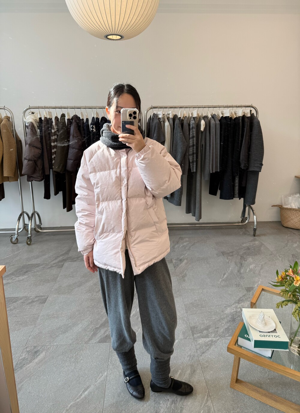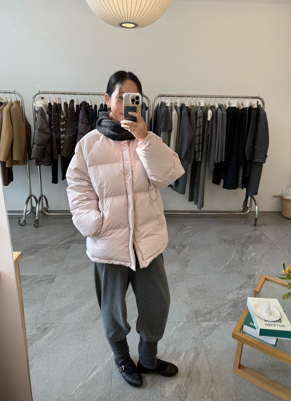 아이보리 컬러가 많이 믹스 된 딸기 우유 빛 패딩입니다.