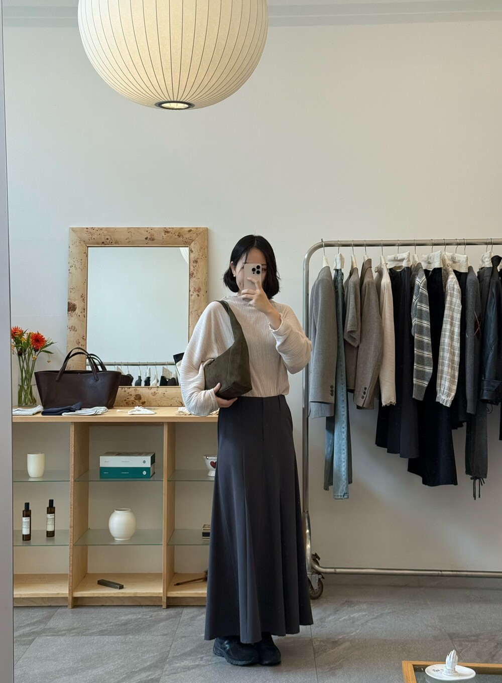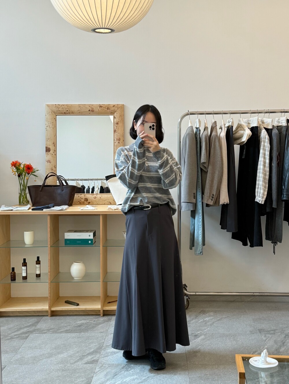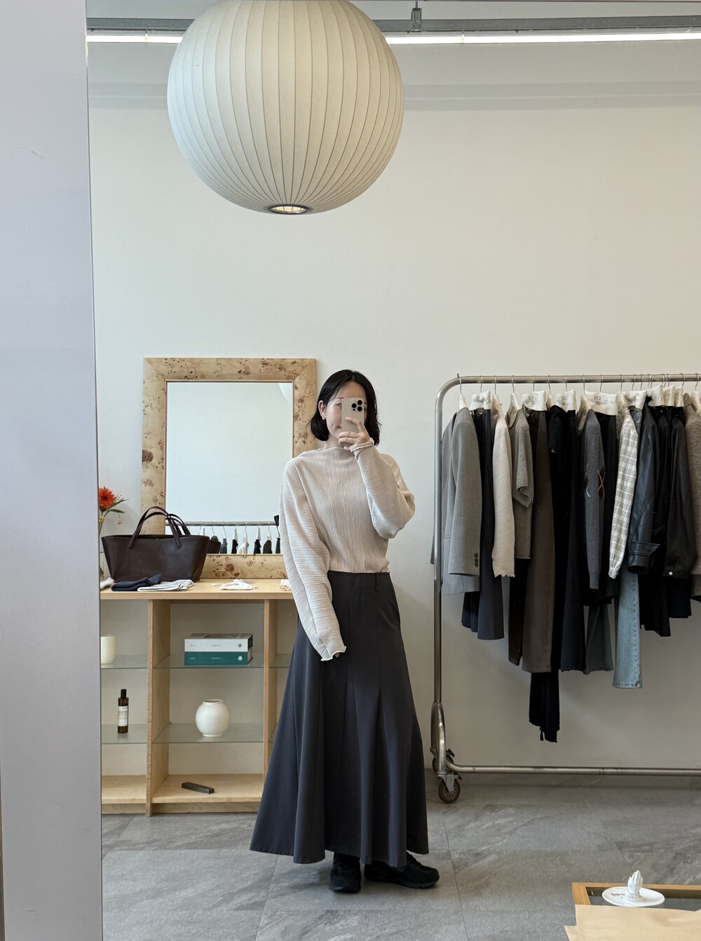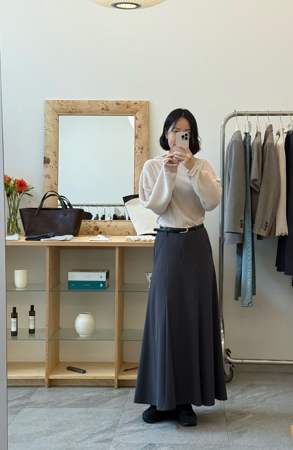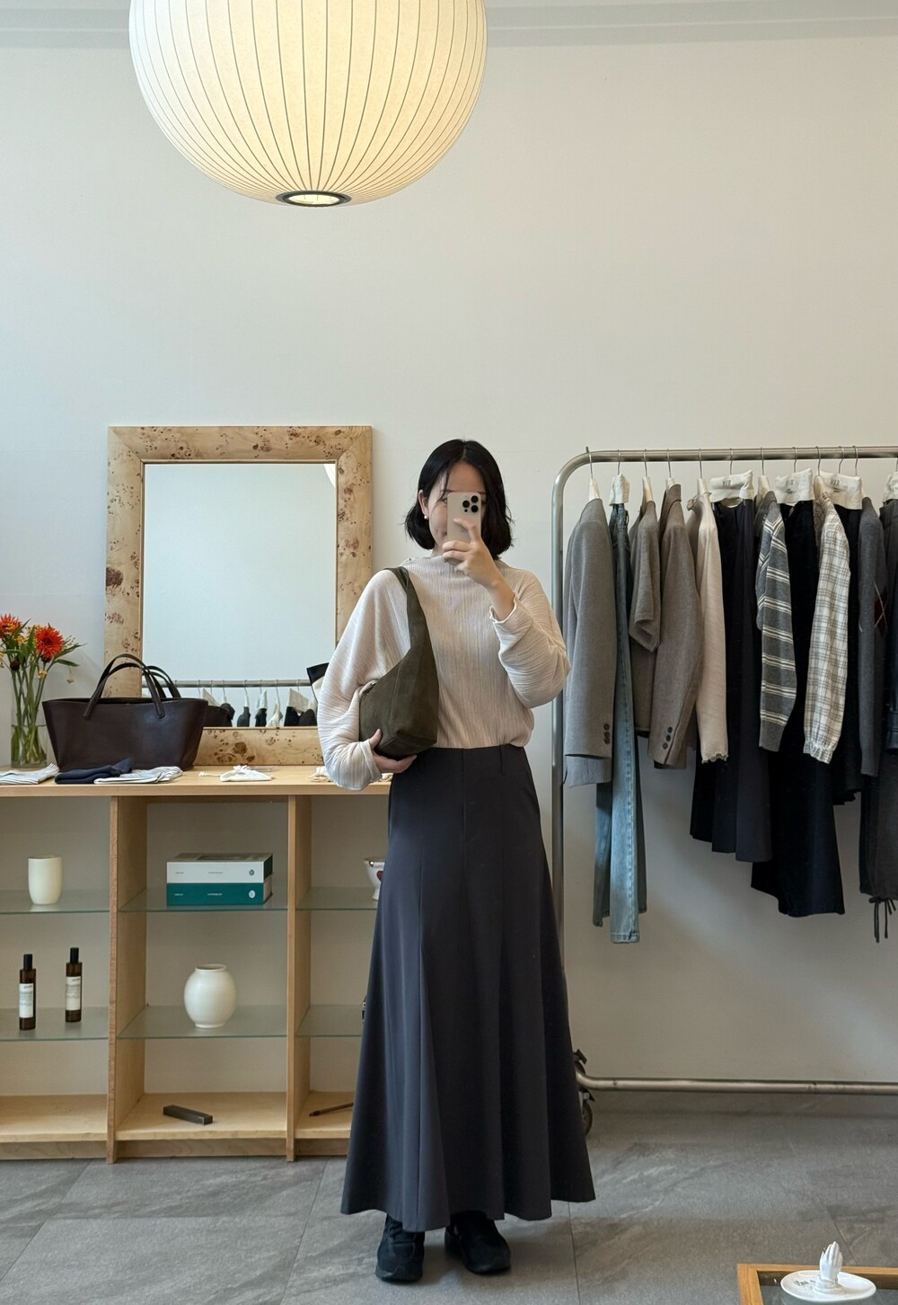 *에이 라인 플레어 디자인이지만 원단이 가볍고 입체감 있는 박음 디자인으로 슬림한 아웃핏을 선사합니다.