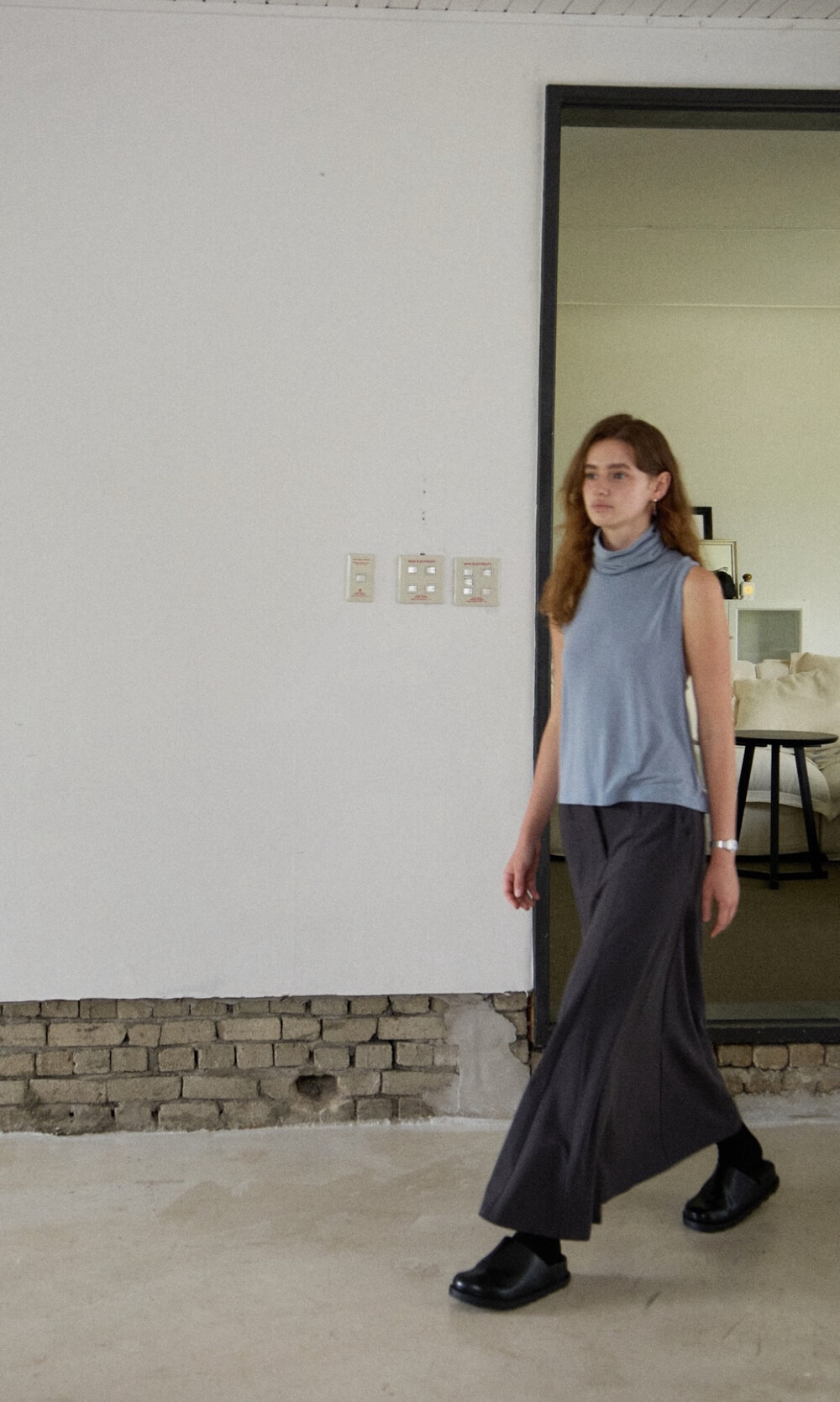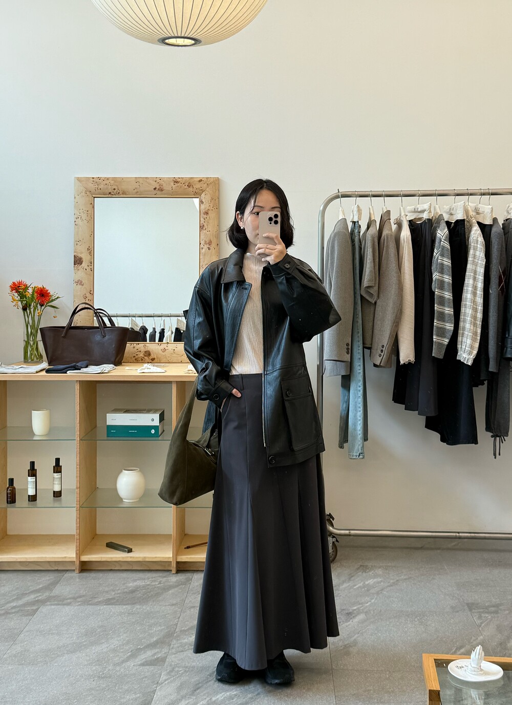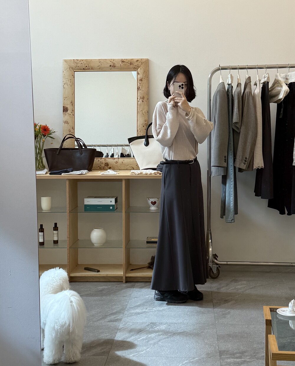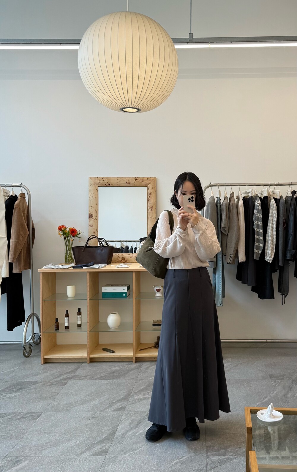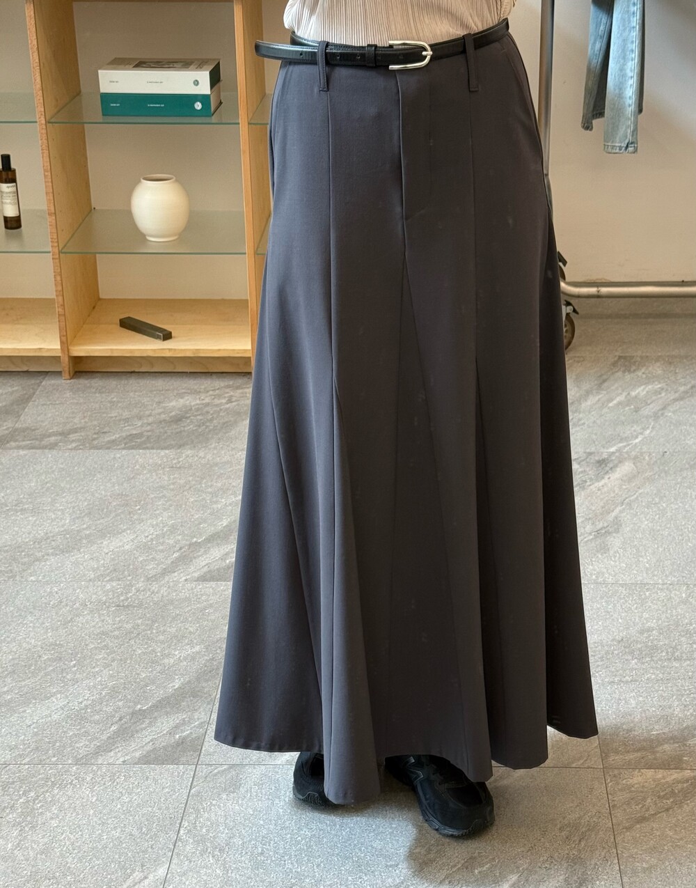 *에이 라인 플레어 디자인이지만 원단이 가볍고 입체감 있는 박음 디자인으로 슬림한 아웃핏을 선사합니다.