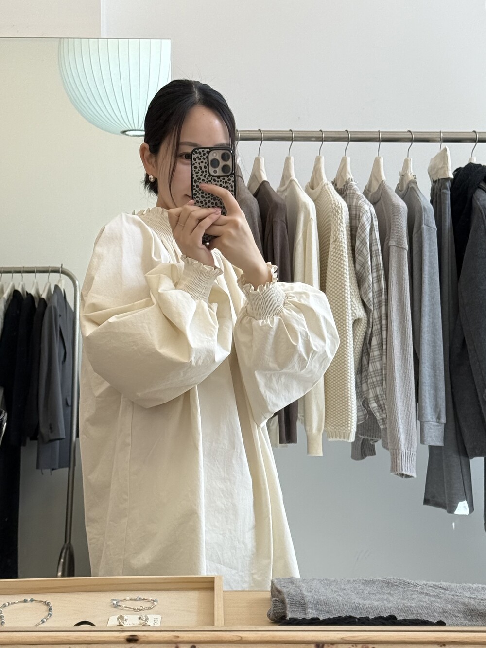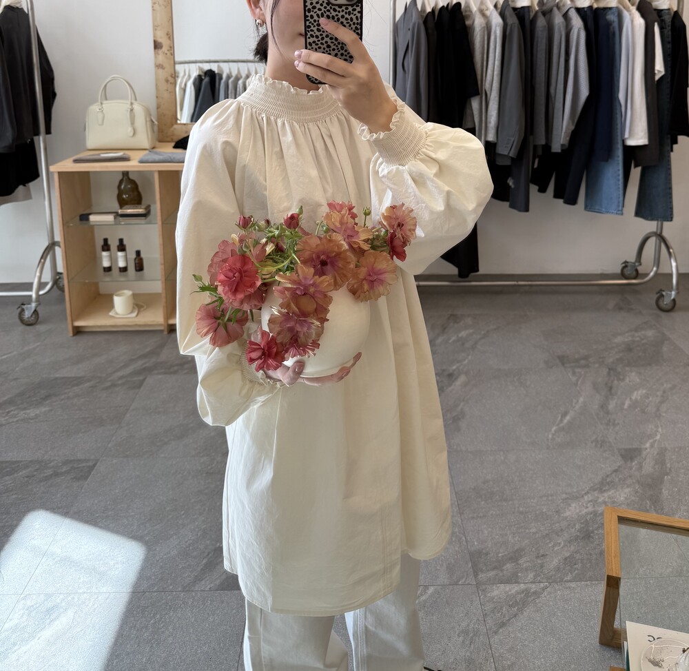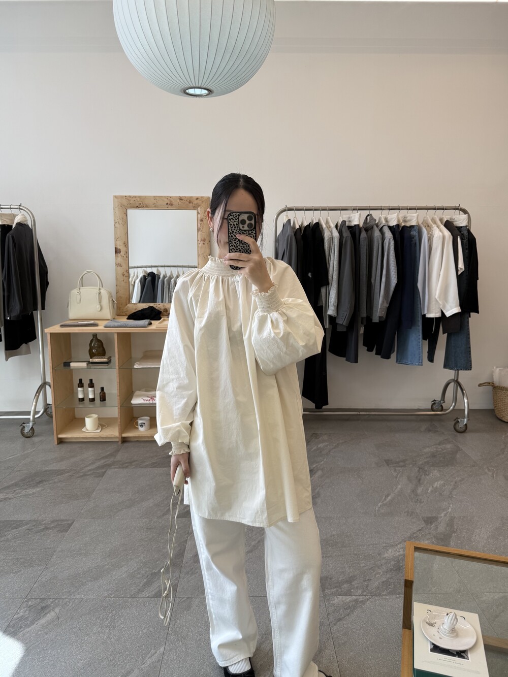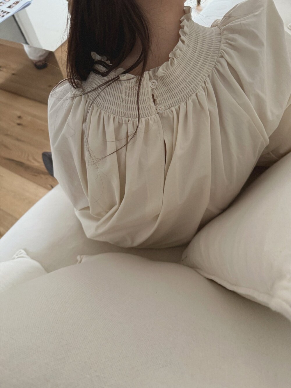 목을 감싸는 스모크 밴딩과 잔잔한 프릴 마감이 얼굴선을 정리해주고, 어깨 아래로 자연스럽게 떨어지는 셔링이 볼륨을 부드럽게 잡아줍니다.