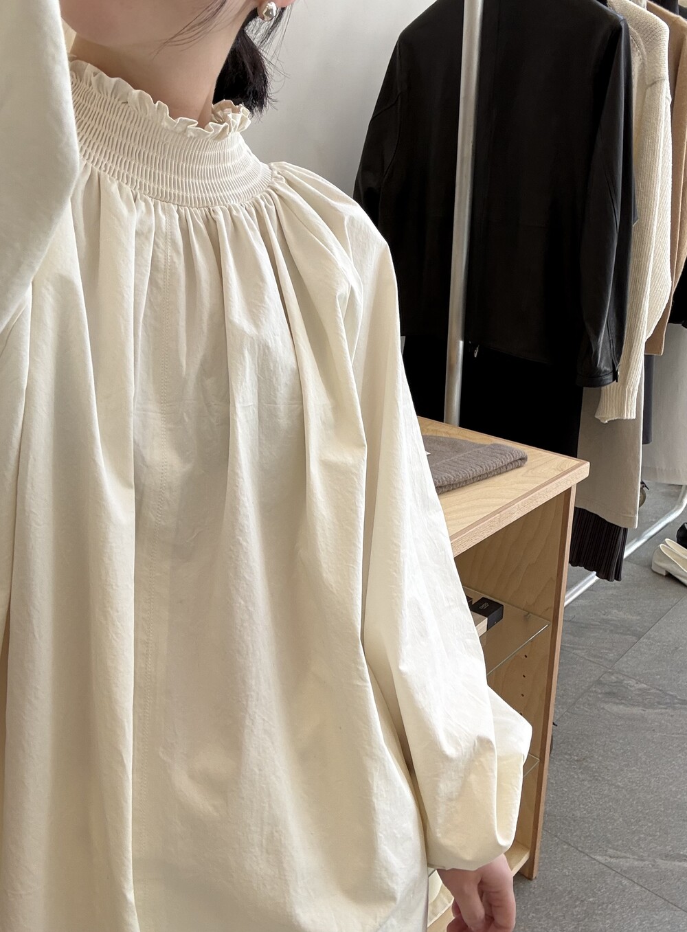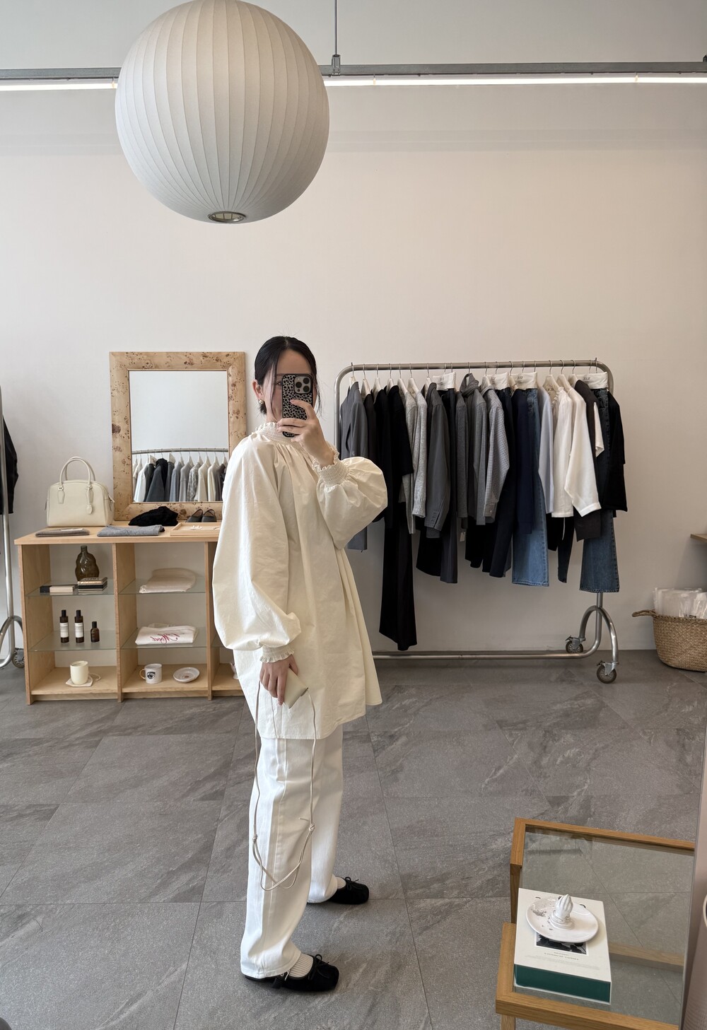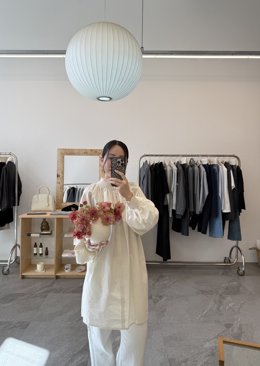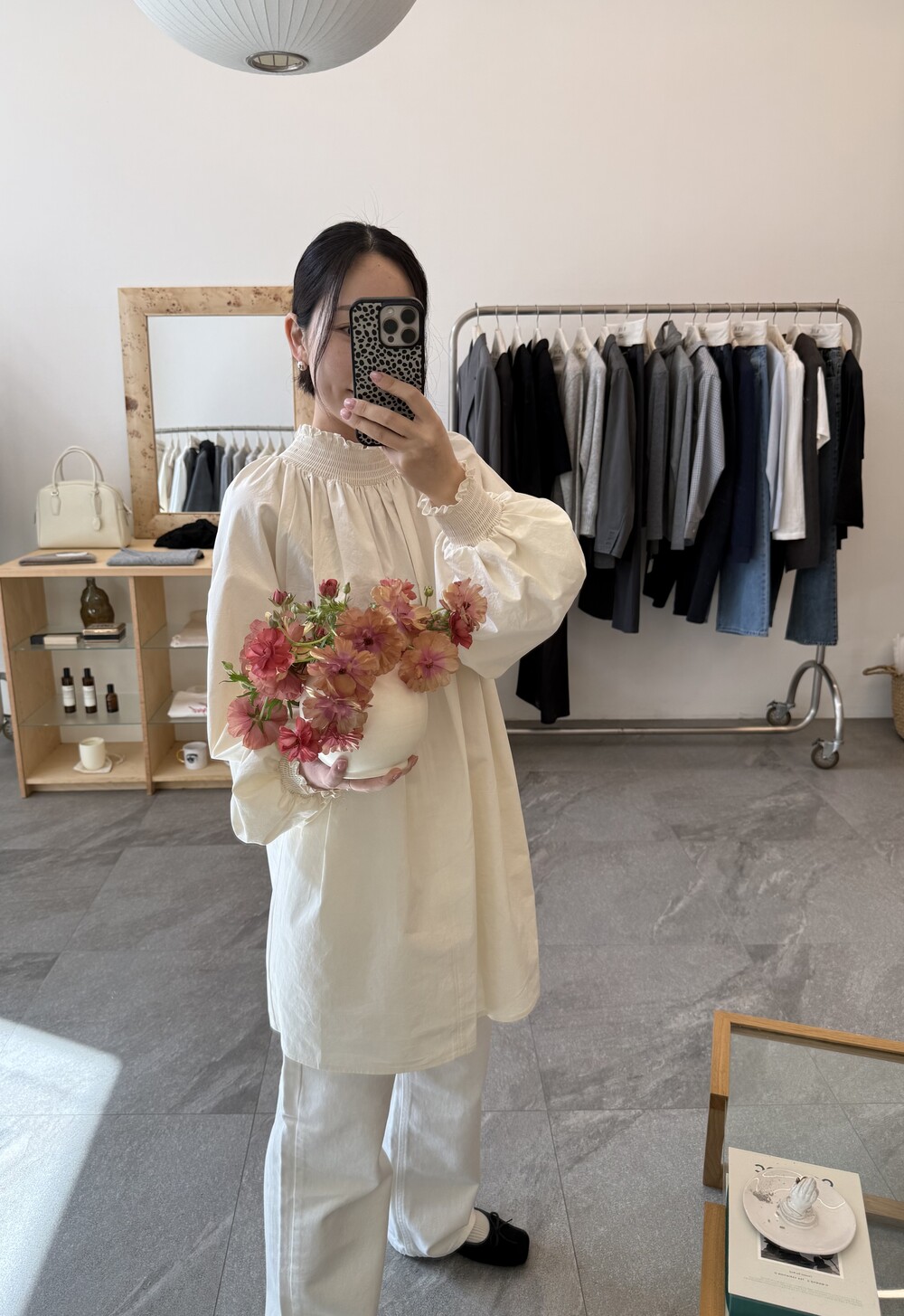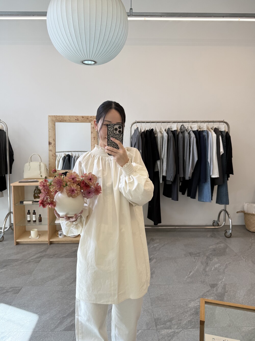 목을 감싸는 스모크 밴딩과 잔잔한 프릴 마감이 얼굴선을 정리해주고, 어깨 아래로 자연스럽게 떨어지는 셔링이 볼륨을 부드럽게 잡아줍니다.