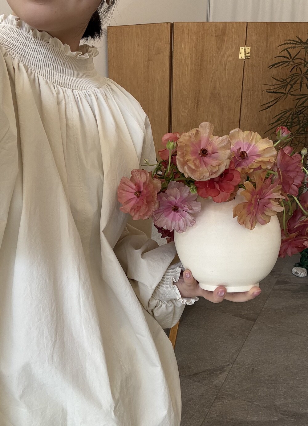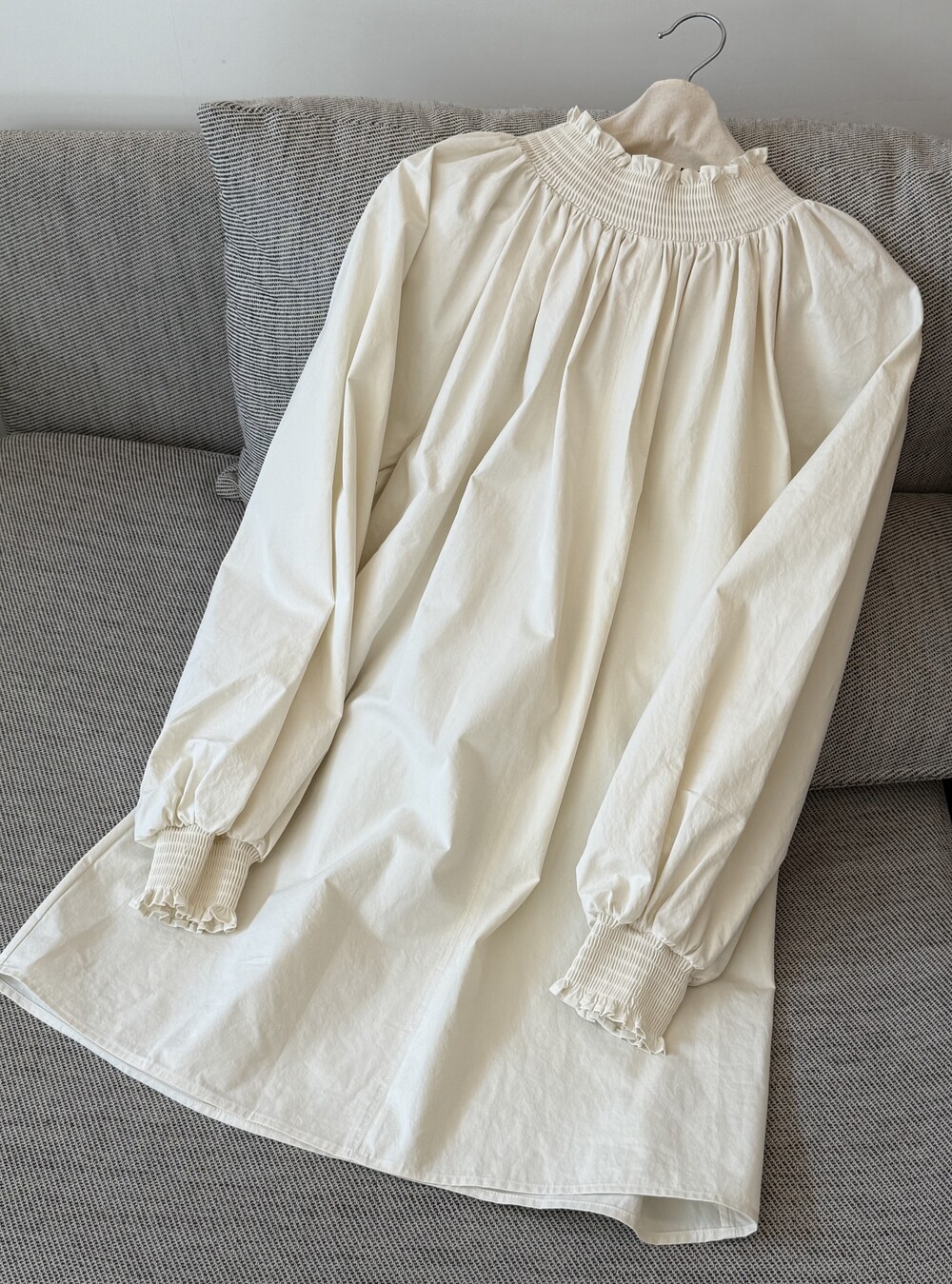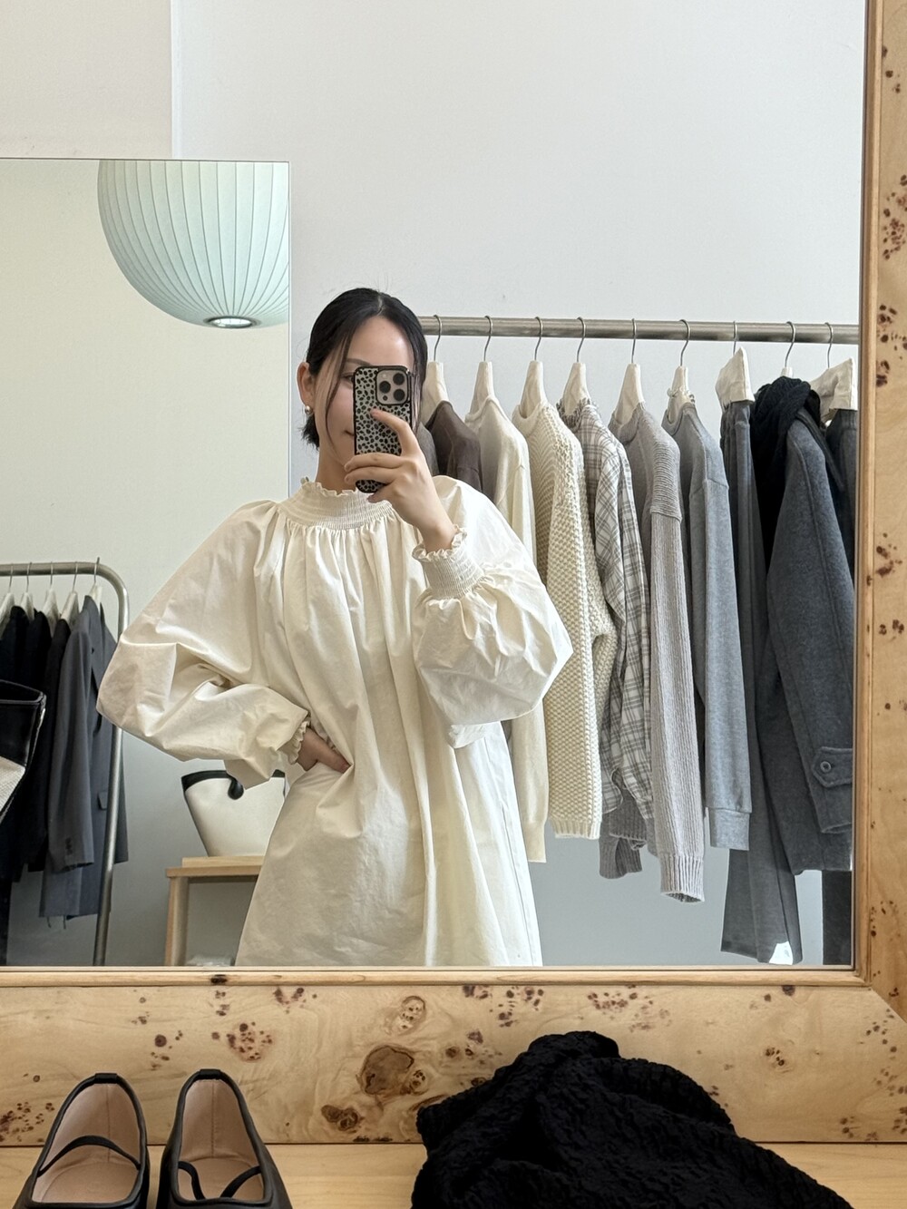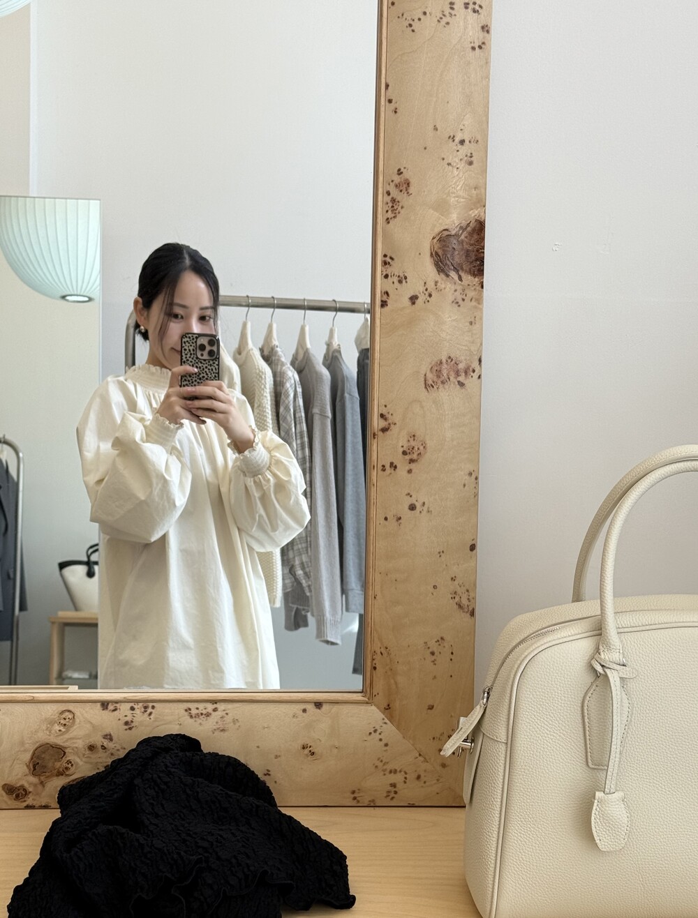 목을 감싸는 스모크 밴딩과 잔잔한 프릴 마감이 얼굴선을 정리해주고, 어깨 아래로 자연스럽게 떨어지는 셔링이 볼륨을 부드럽게 잡아줍니다.