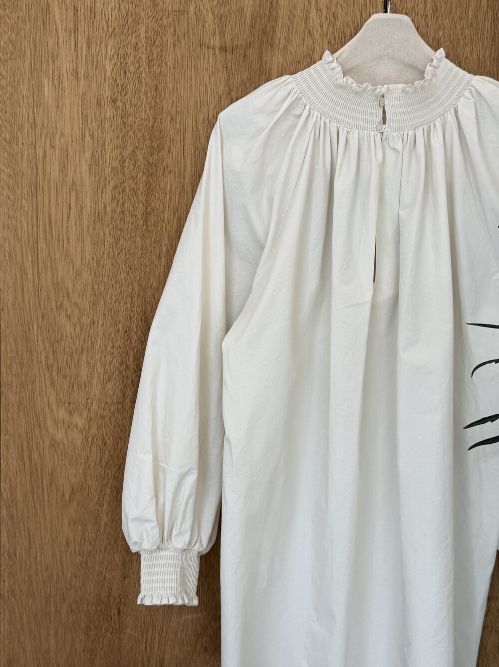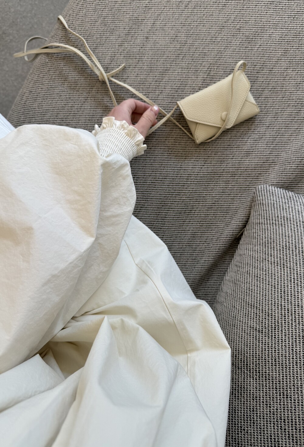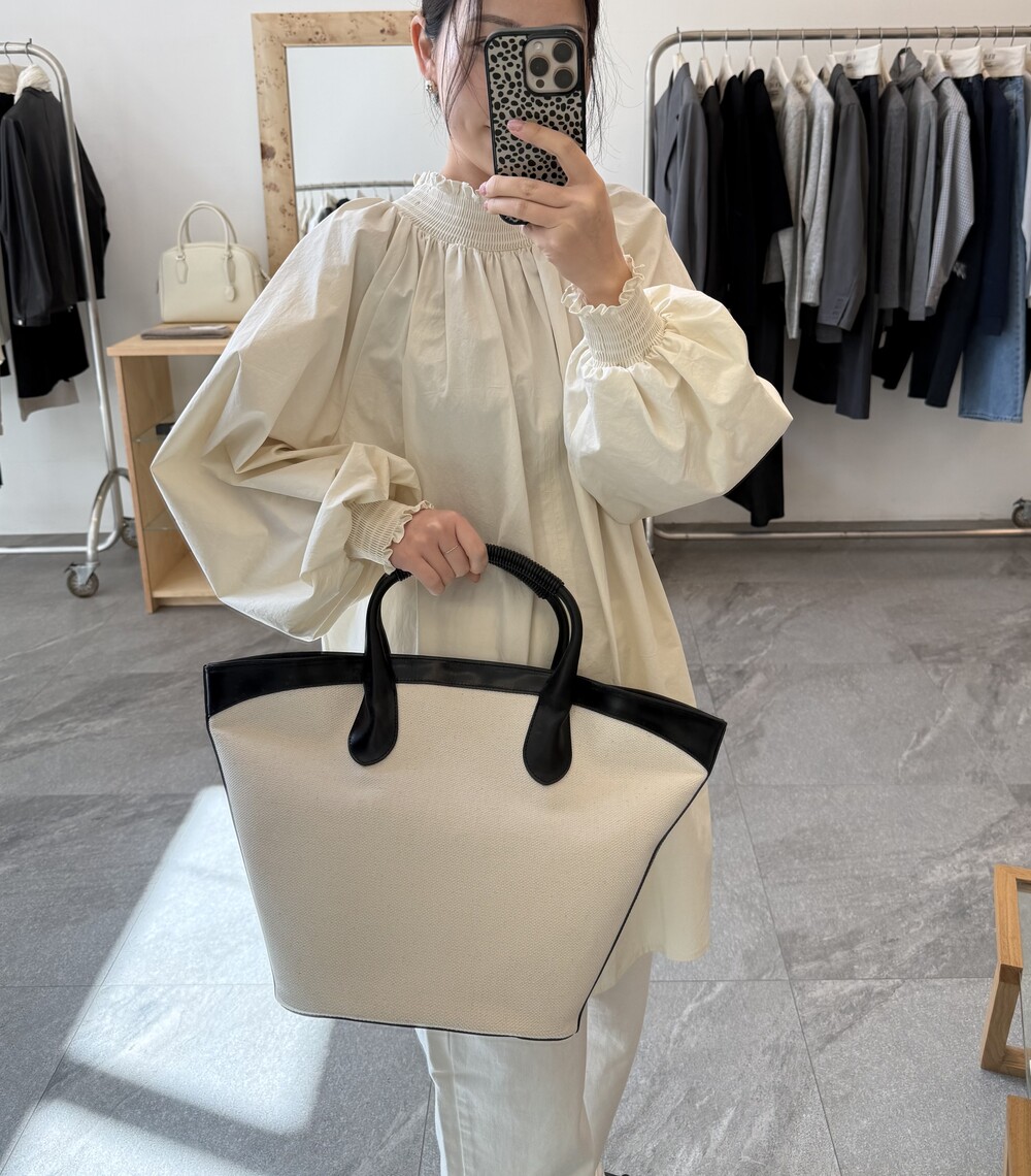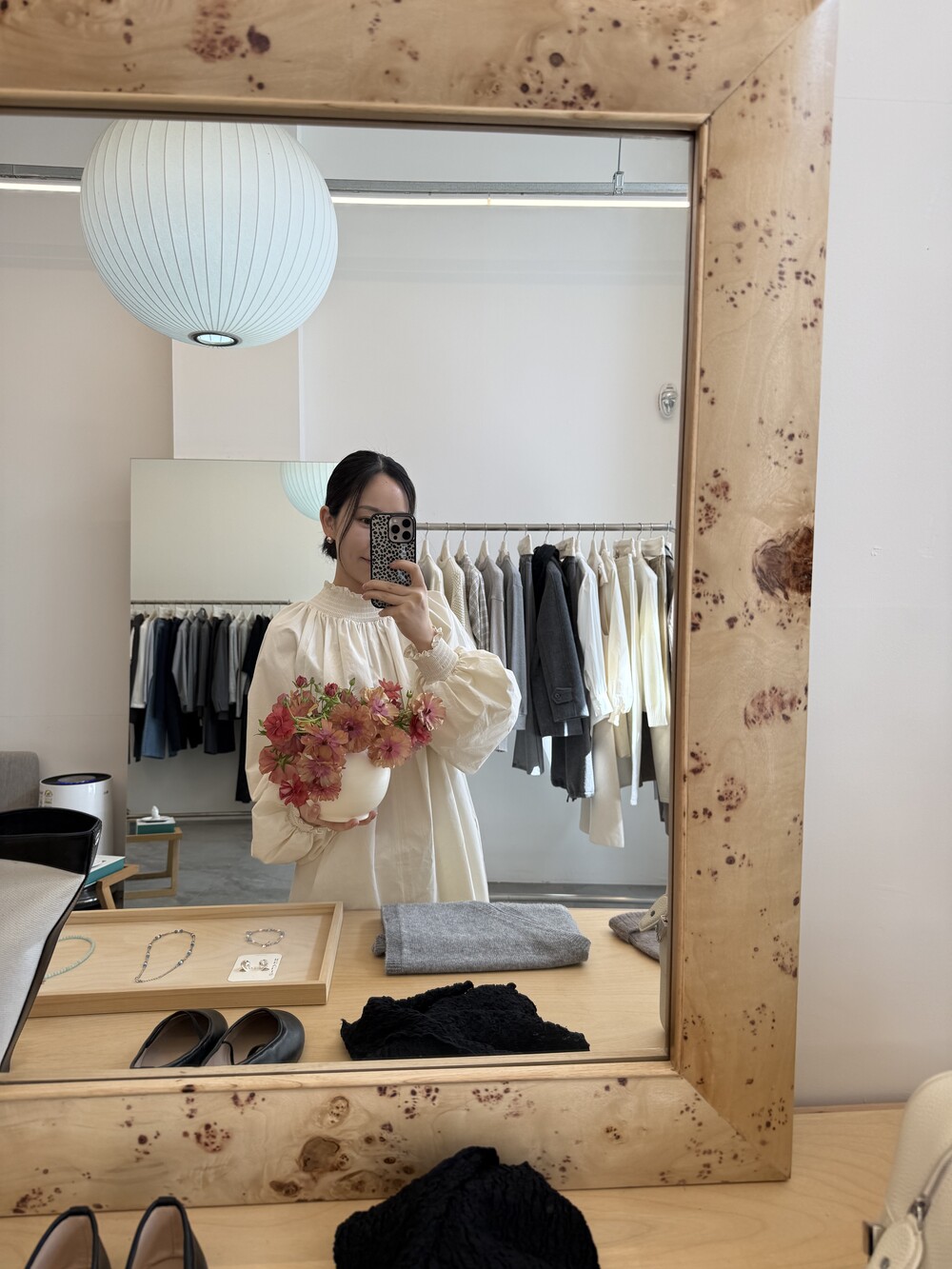 목을 감싸는 스모크 밴딩과 잔잔한 프릴 마감이 얼굴선을 정리해주고, 어깨 아래로 자연스럽게 떨어지는 셔링이 볼륨을 부드럽게 잡아줍니다.