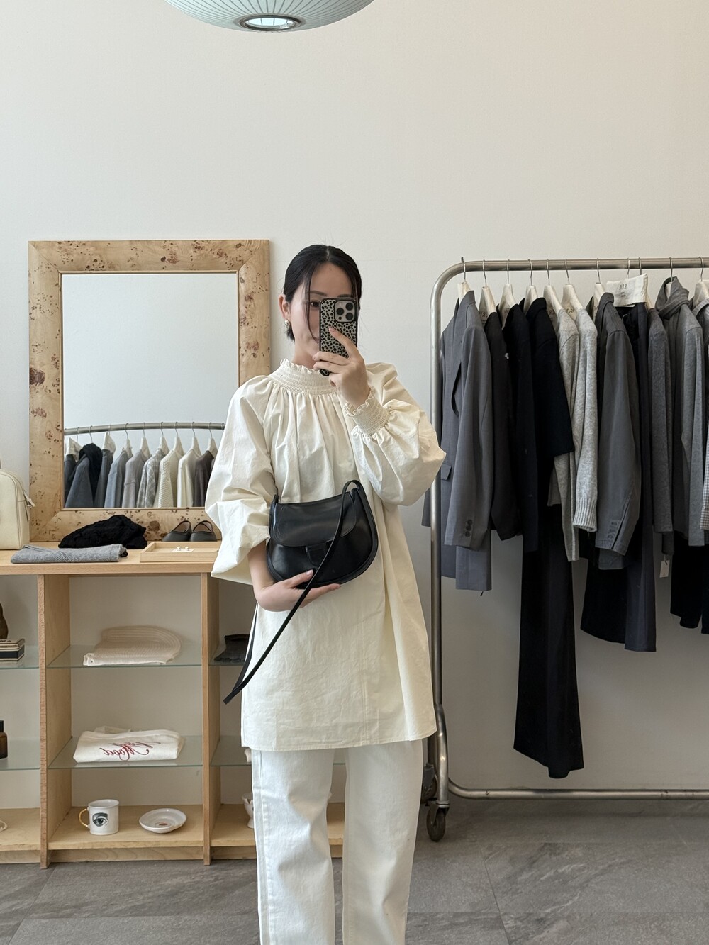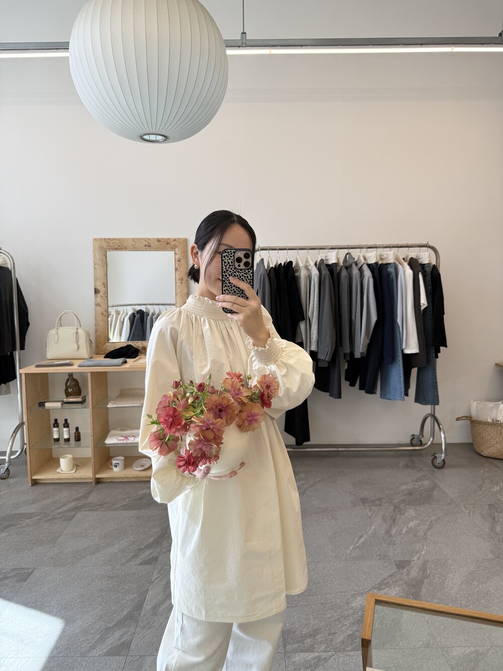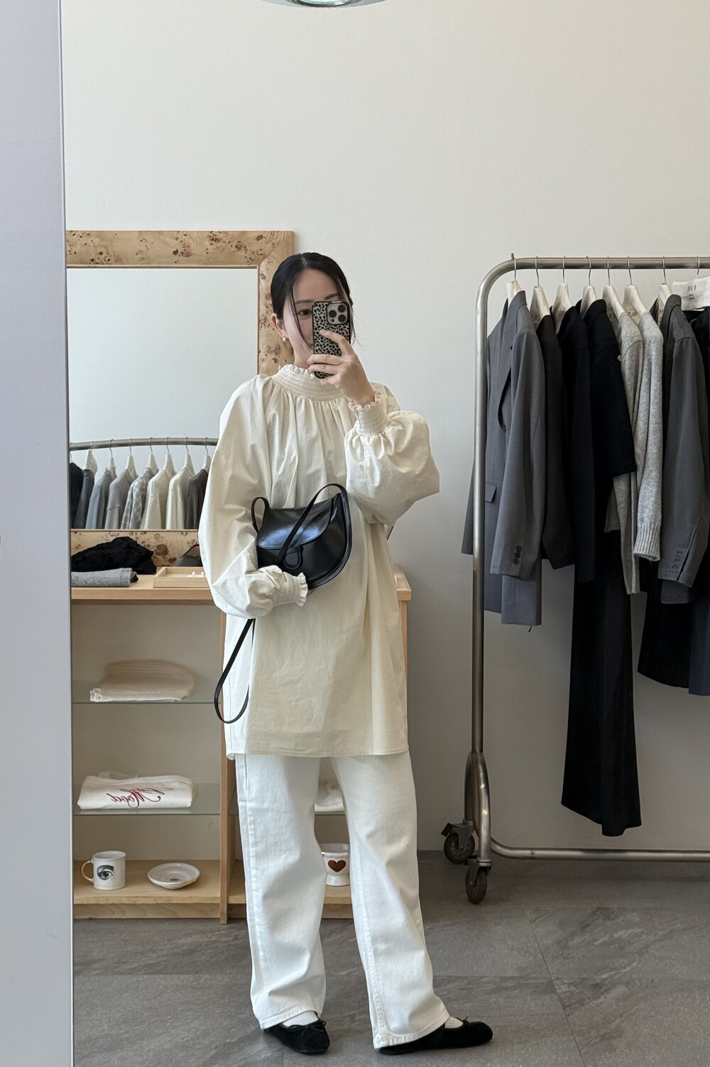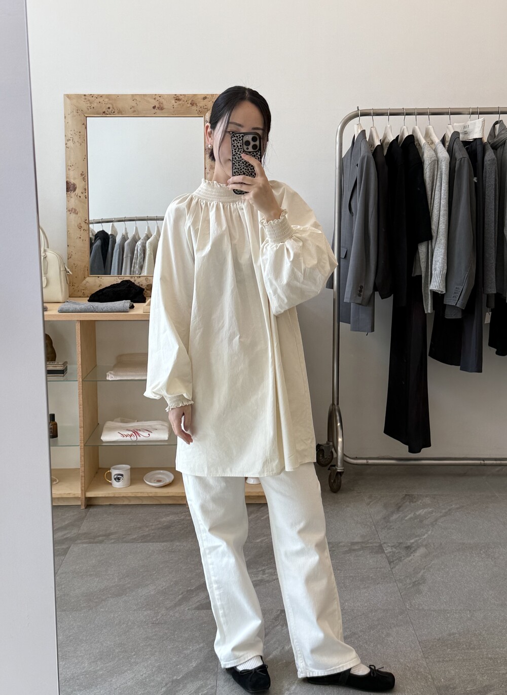 넥 라인과 소매에 촘촘하게 잡힌 셔링 디테일이 분위기를 완성해주는 블라우스예요.