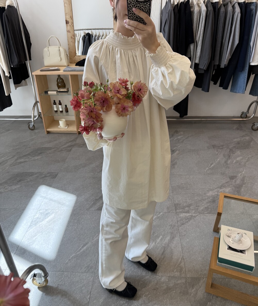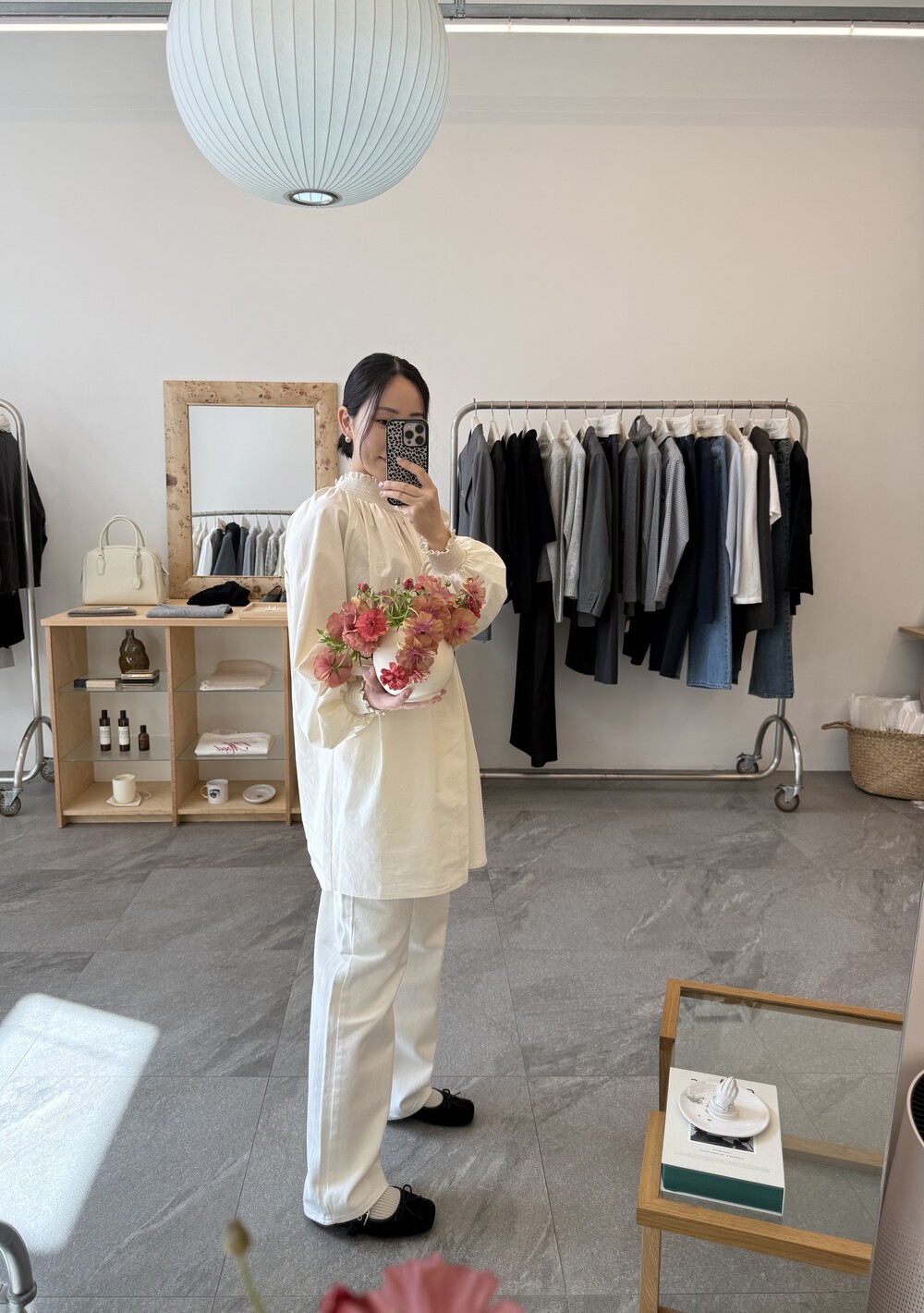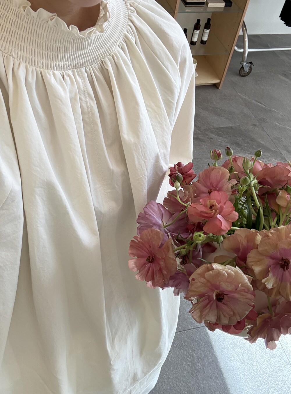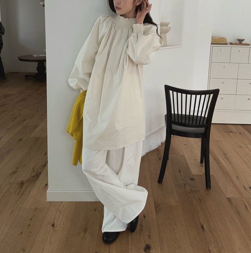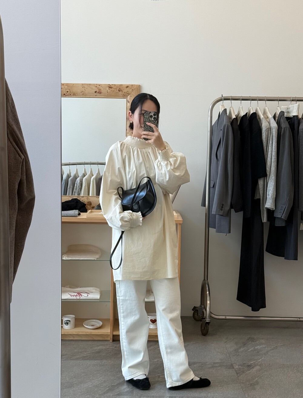넥 라인과 소매에 촘촘하게 잡힌 셔링 디테일이 분위기를 완성해주는 블라우스예요.