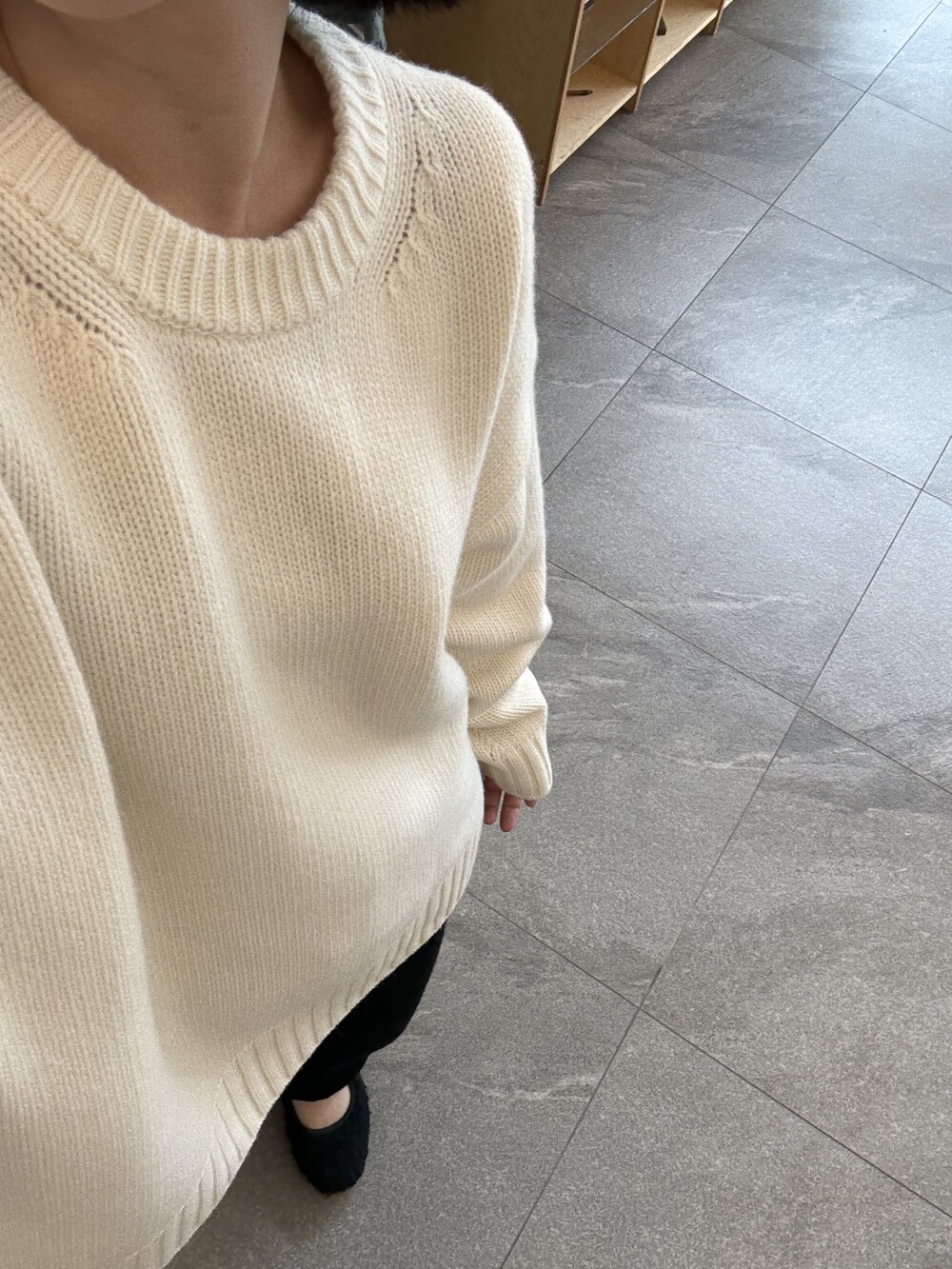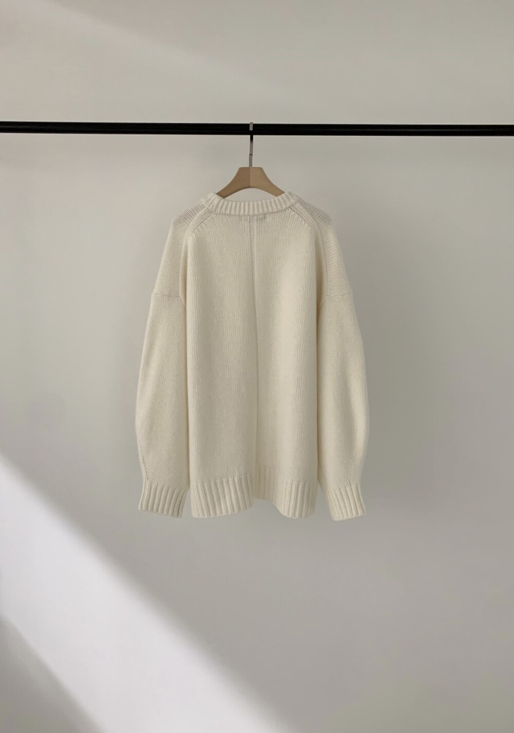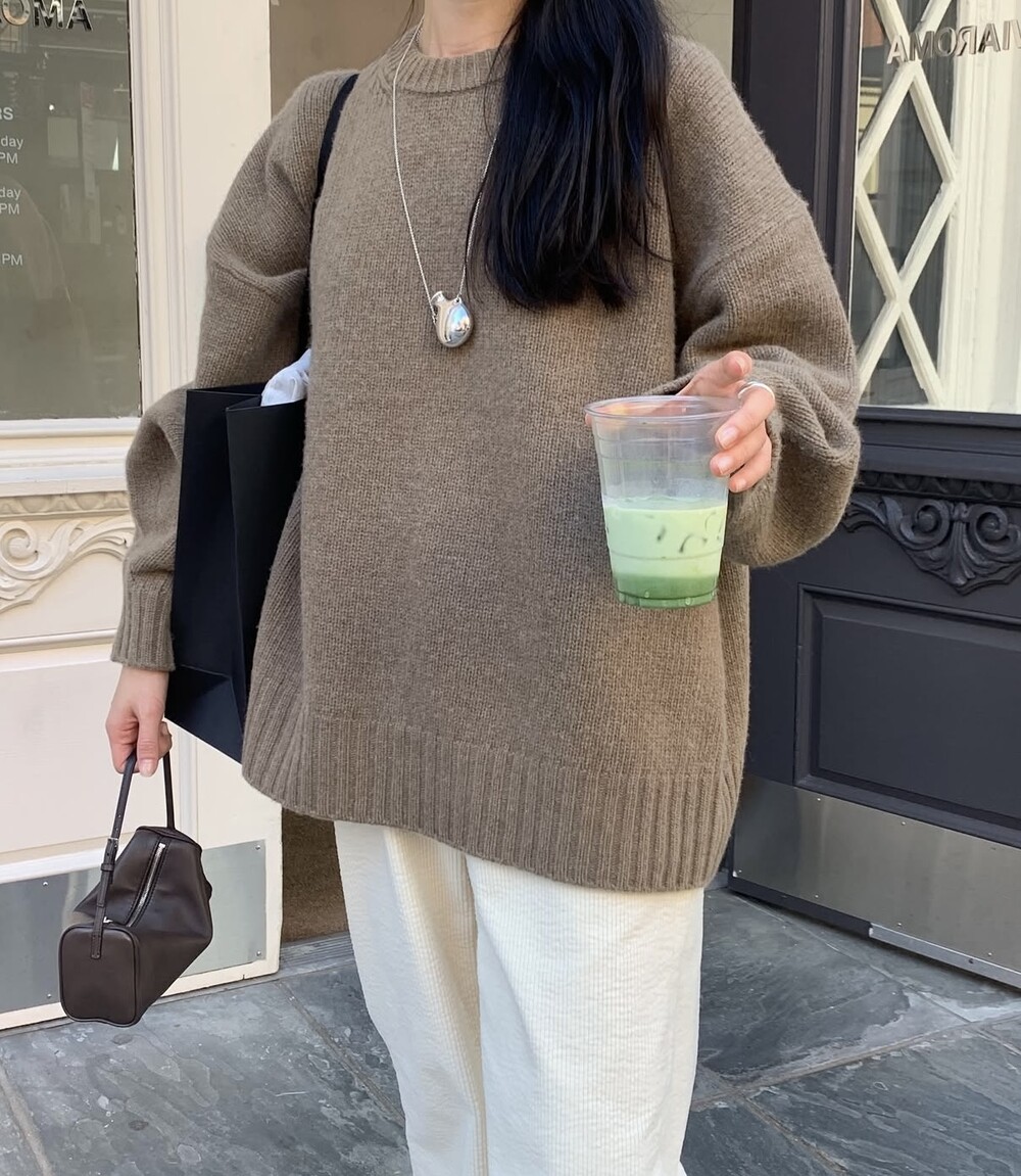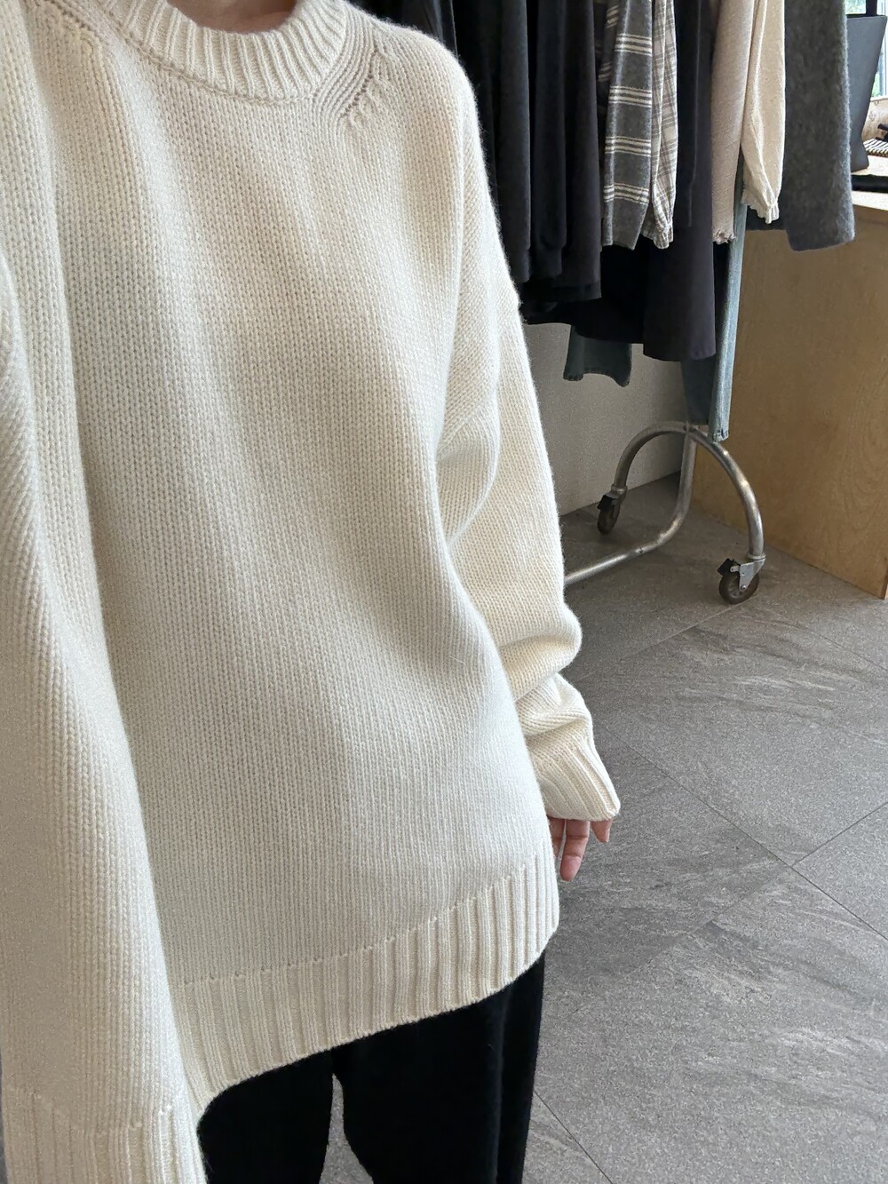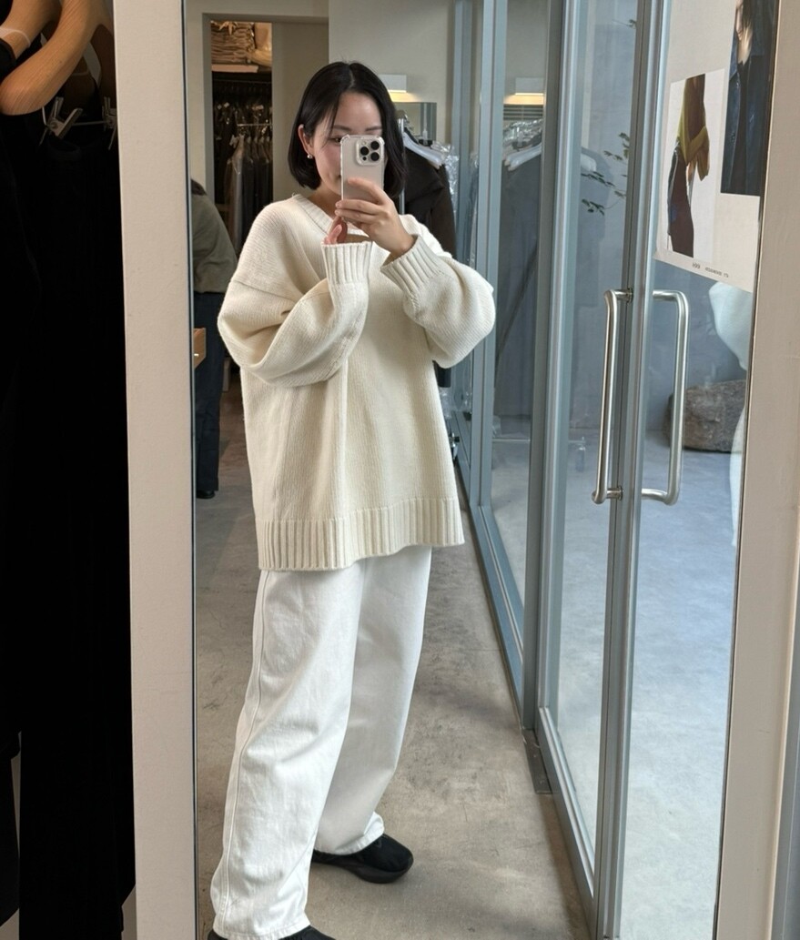 보통 박시한 니트는 부해보이기 마련인데 어깨 래글런 타입으로 슬림하게 떨어지는 핏이 특징입니다.