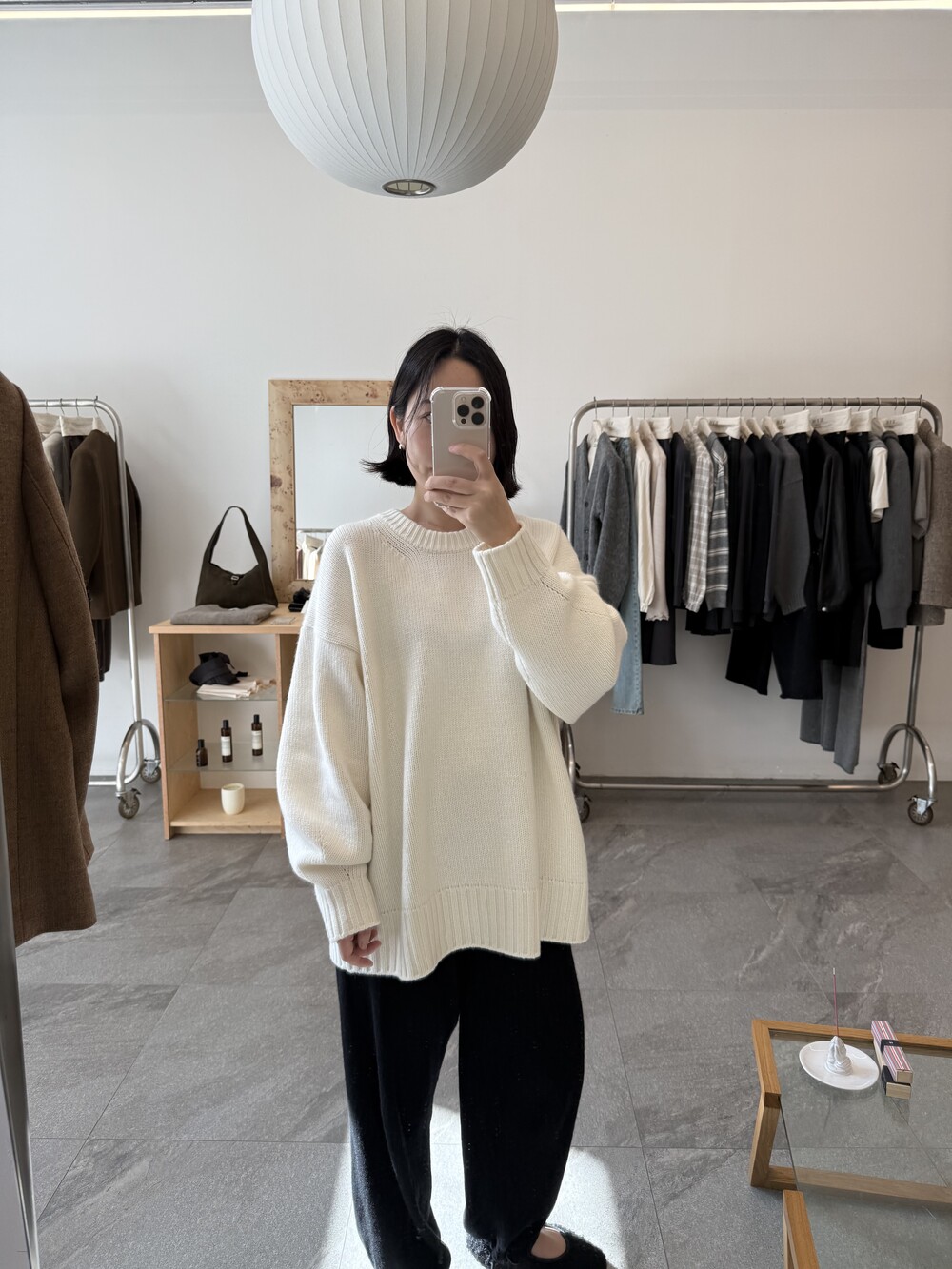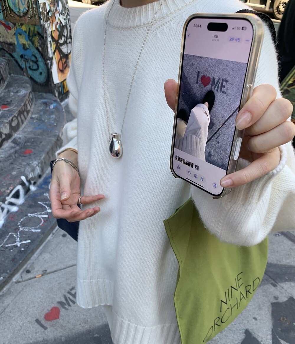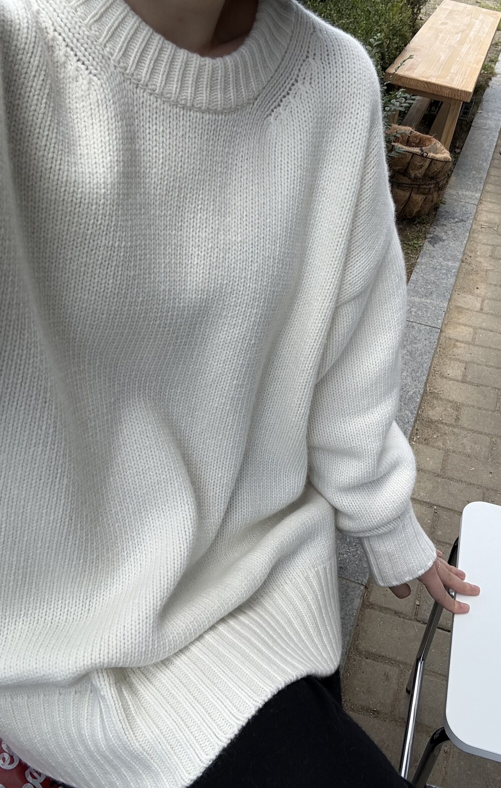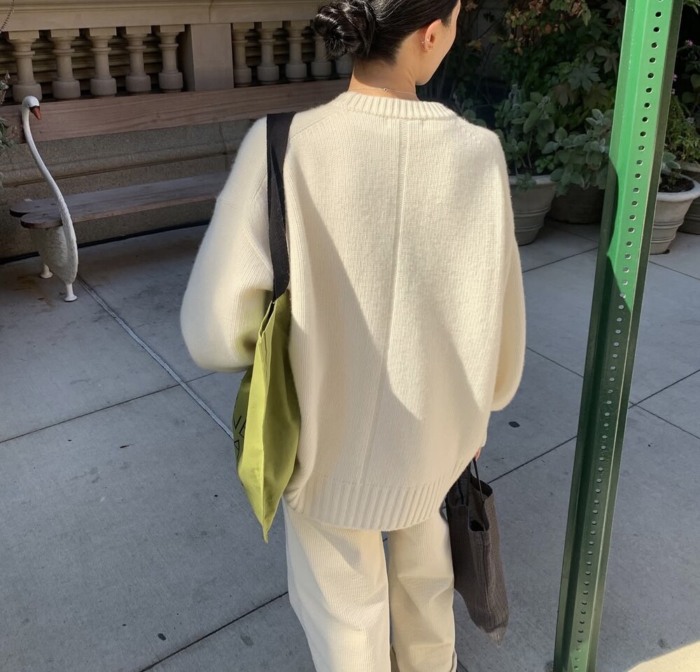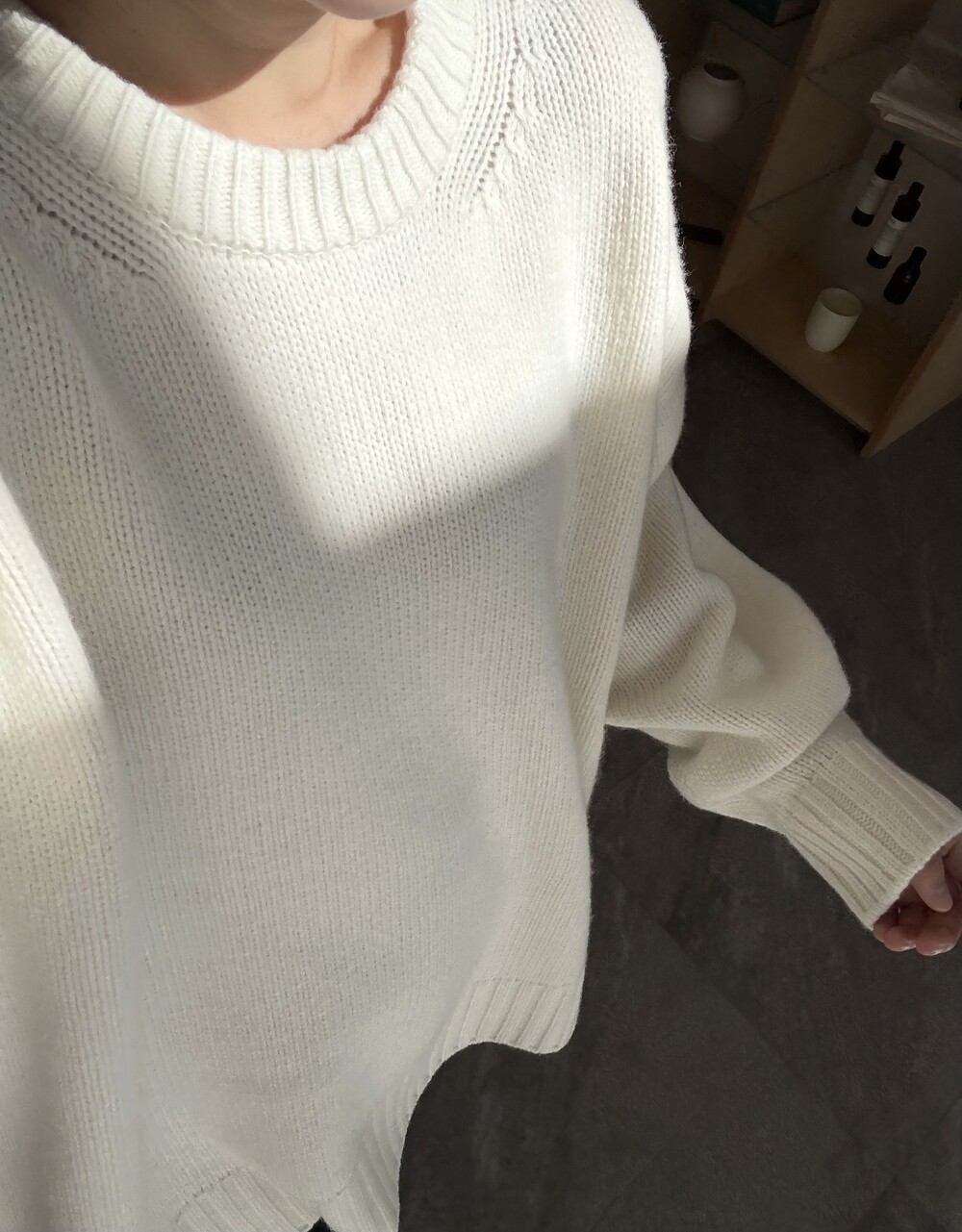 보통 박시한 니트는 부해보이기 마련인데 어깨 래글런 타입으로 슬림하게 떨어지는 핏이 특징입니다.