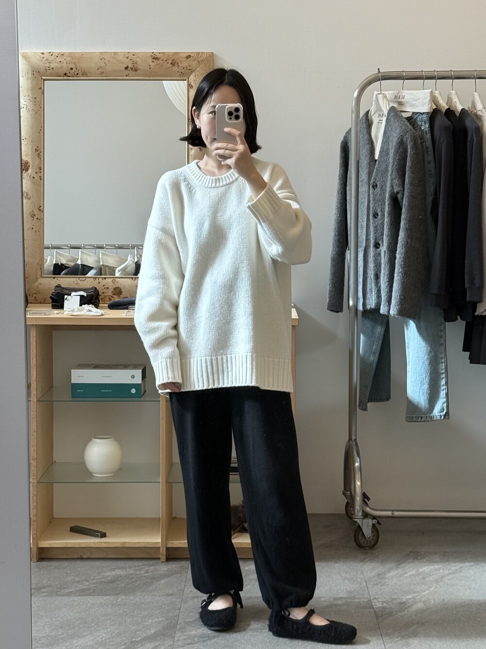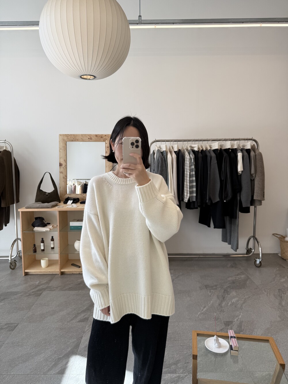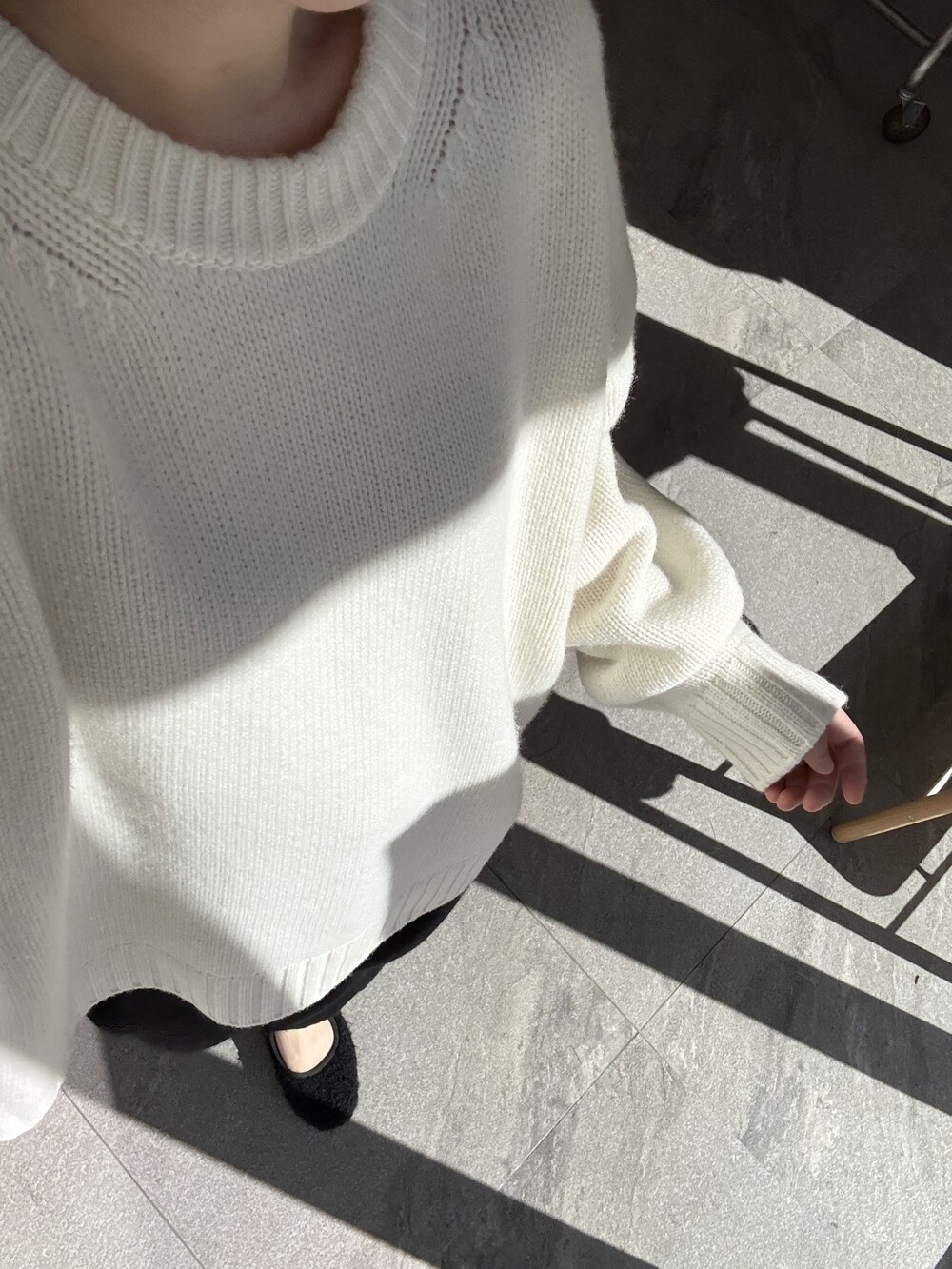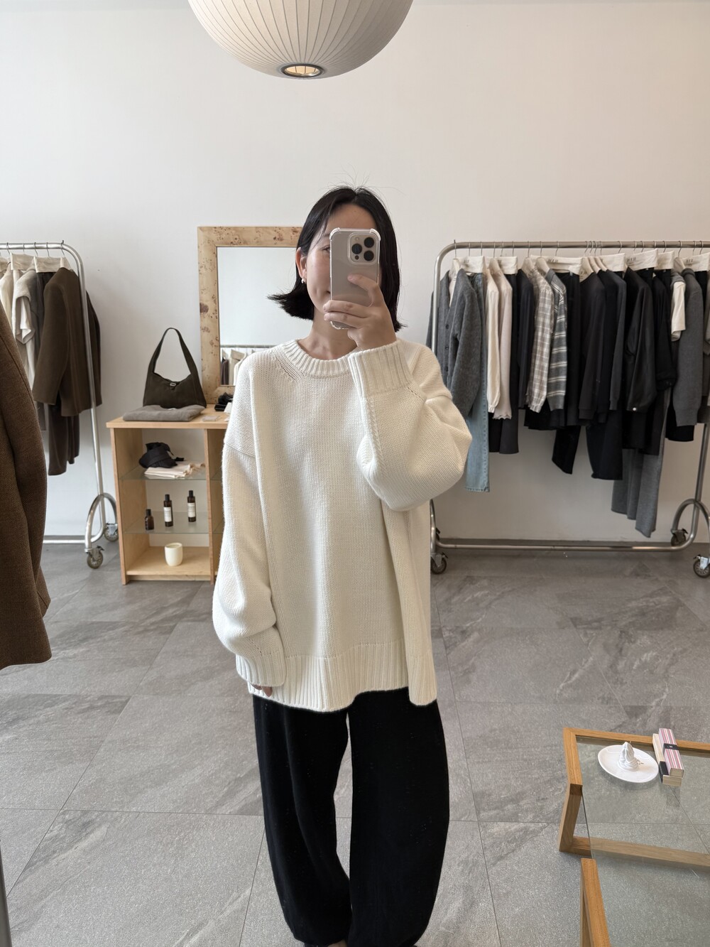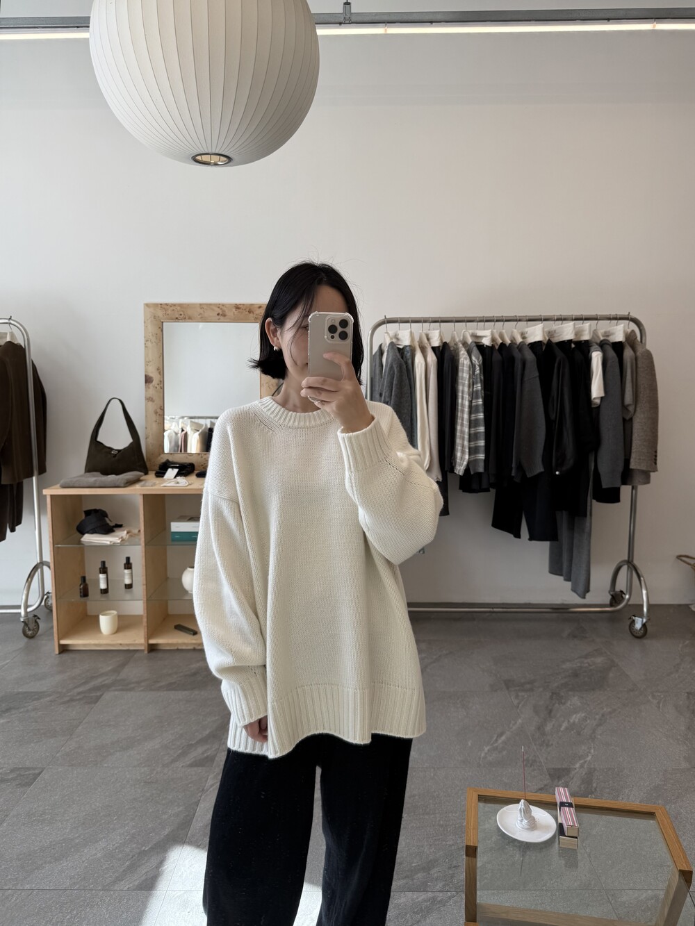 보통 박시한 니트는 부해보이기 마련인데 어깨 래글런 타입으로 슬림하게 떨어지는 핏이 특징입니다.