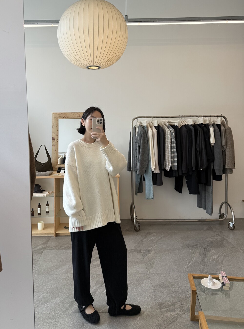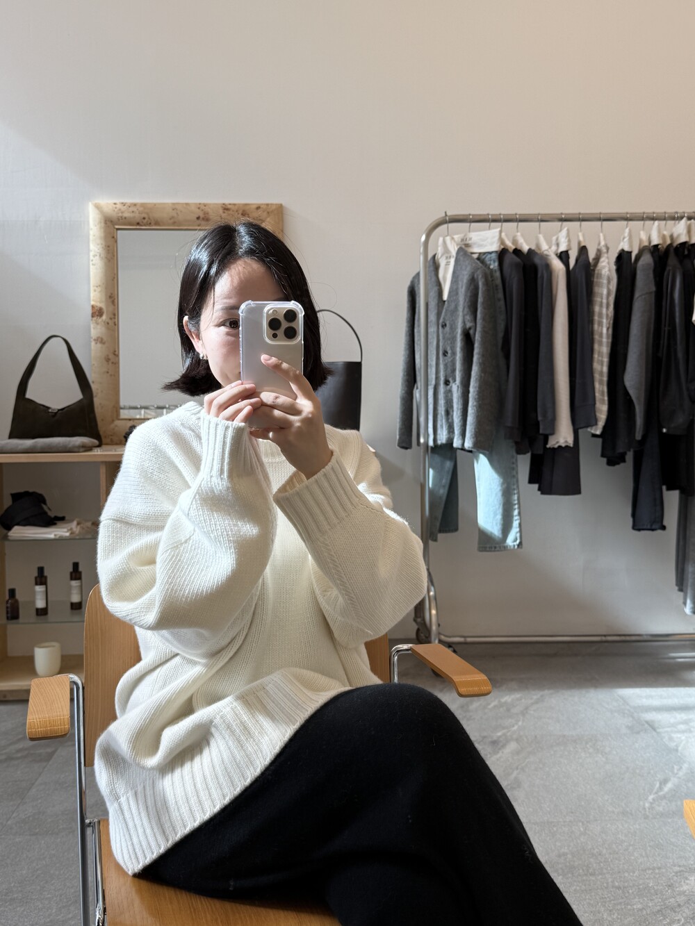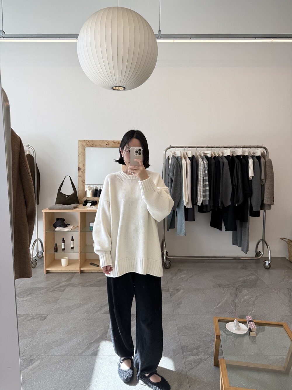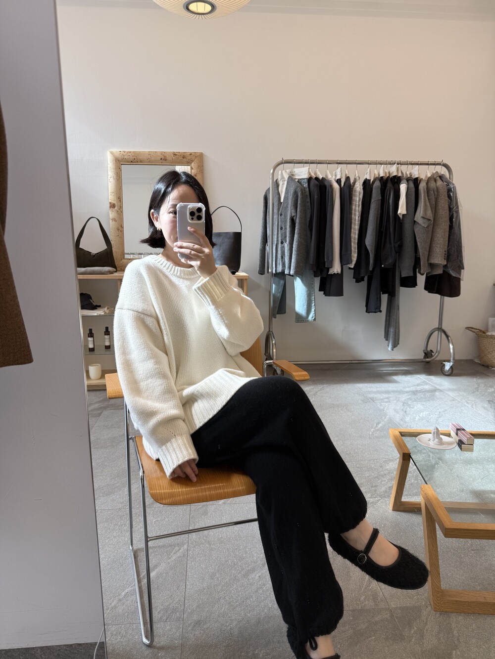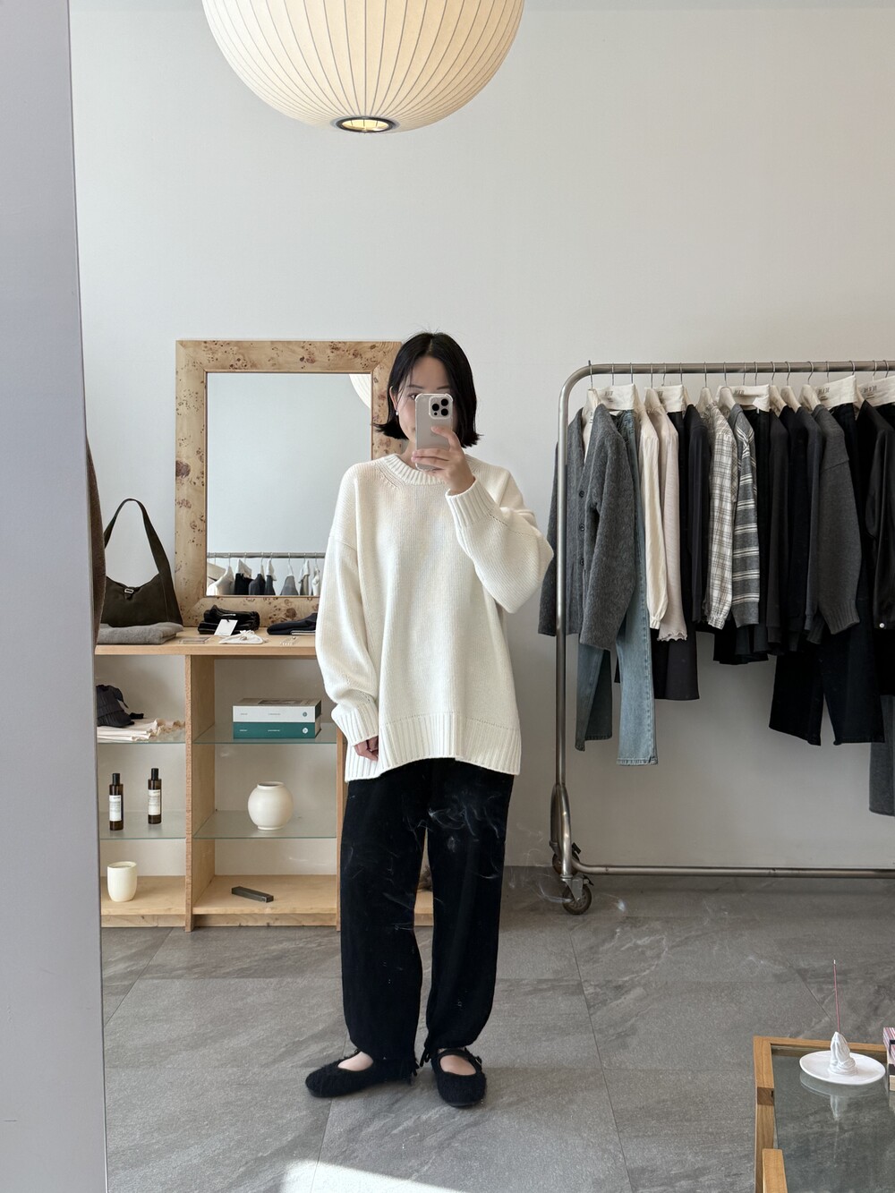 보통 박시한 니트는 부해보이기 마련인데 어깨 래글런 타입으로 슬림하게 떨어지는 핏이 특징입니다.