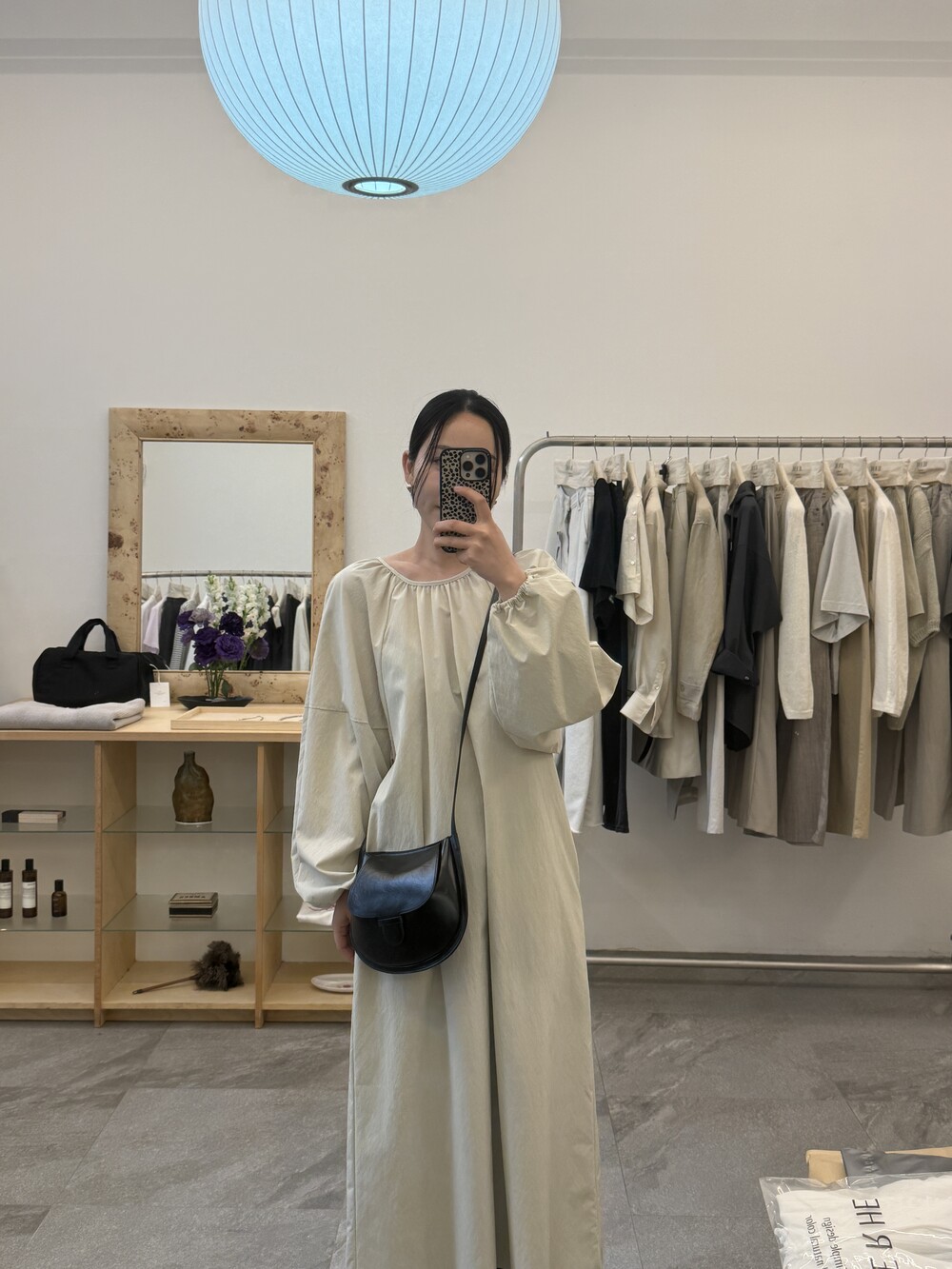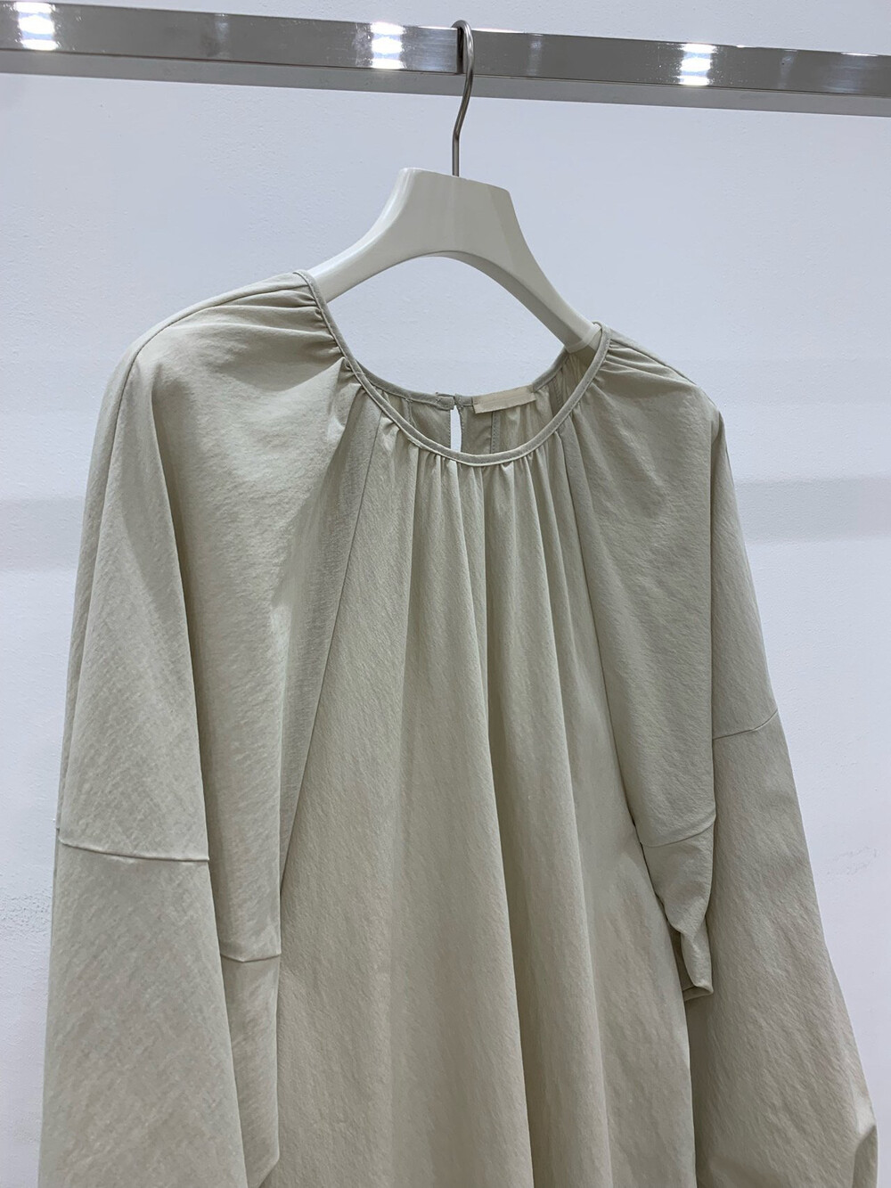 넥 라인을 따라 자연스럽게 잡힌 셔링 디테일이 전체 실루엣을 부드럽게 풀어주면서, 과하지 않게 볼륨감을 더해줍니다. 여유 있는 핏이지만 부해 보이지 않고, 체형에 구애 없이 편안하게 떨어지는 점이 가장 큰 장점이에요.